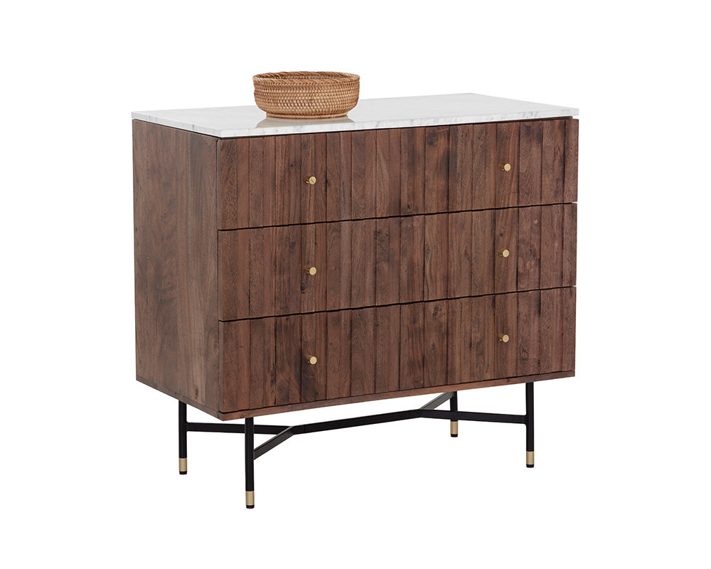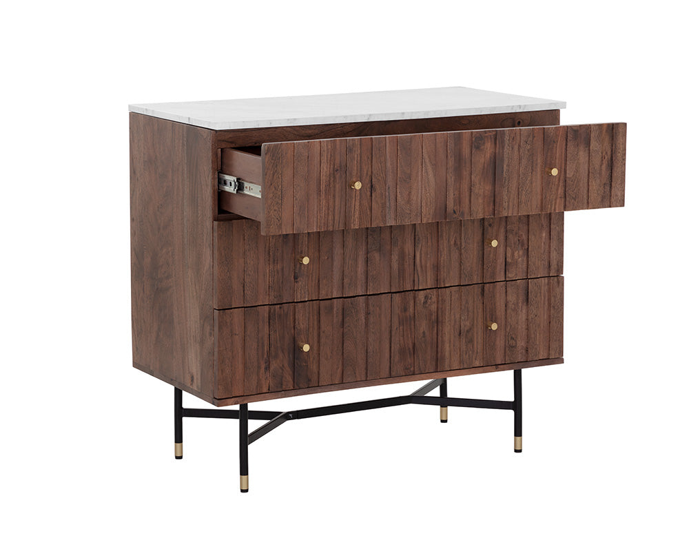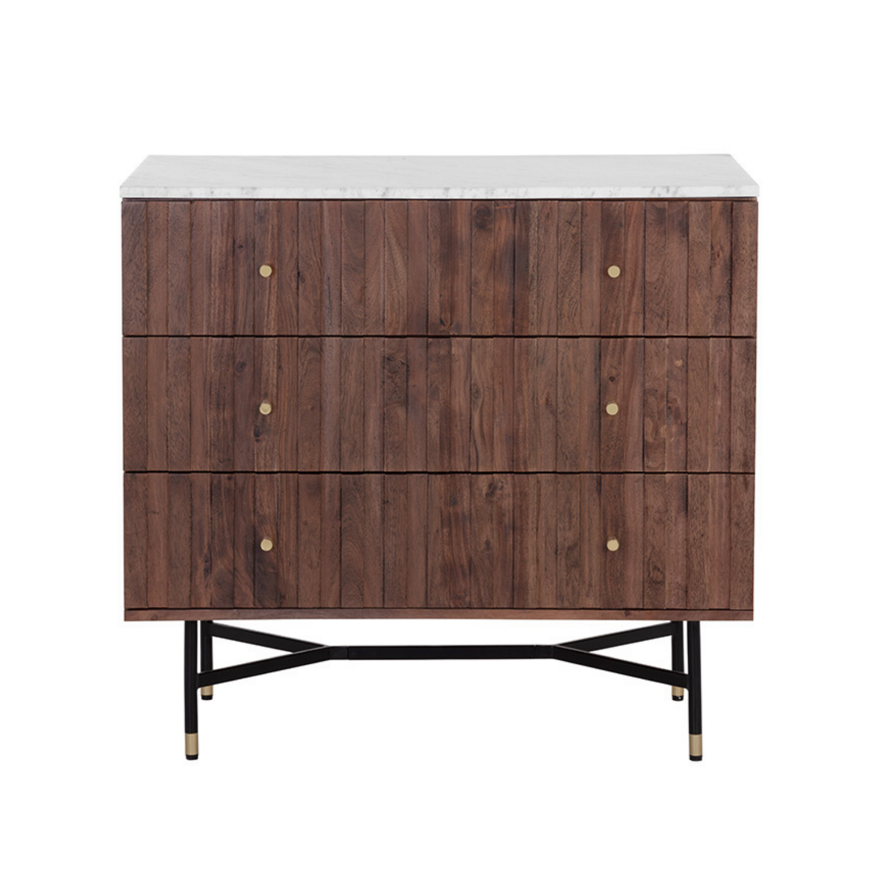 Expertly crafted from engineered wood and finished in a light brown palette with whitewashed undertones, the ELIZA is an elegant accent chest featuring three large pull-out drawers with elliptical details that offer ample storage space for a wide range of items. The ELIZA is braced by two solid metal legs finished in a matte-black tone that not only add to the visuals of the piece but also guarantee unparalleled stability and balance.