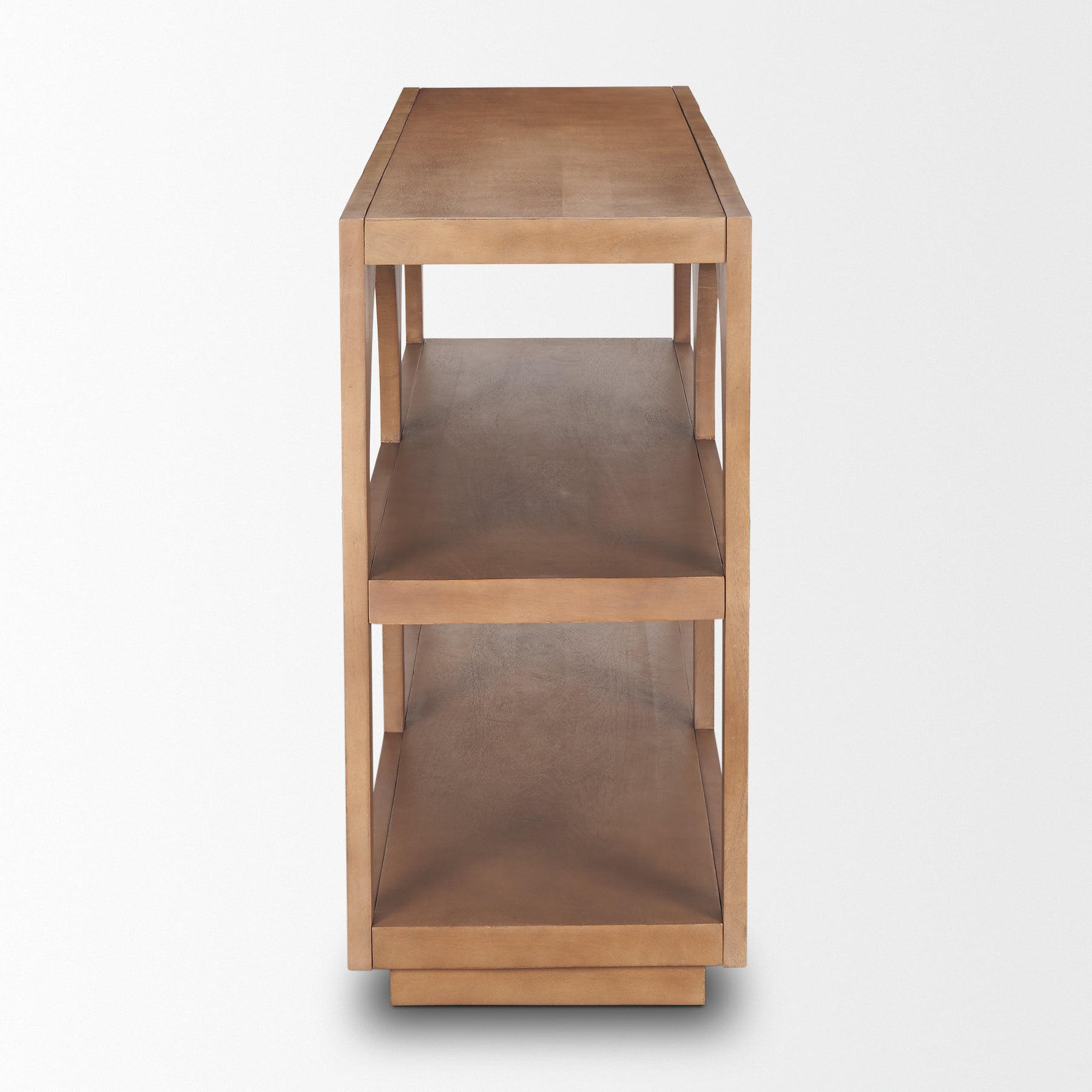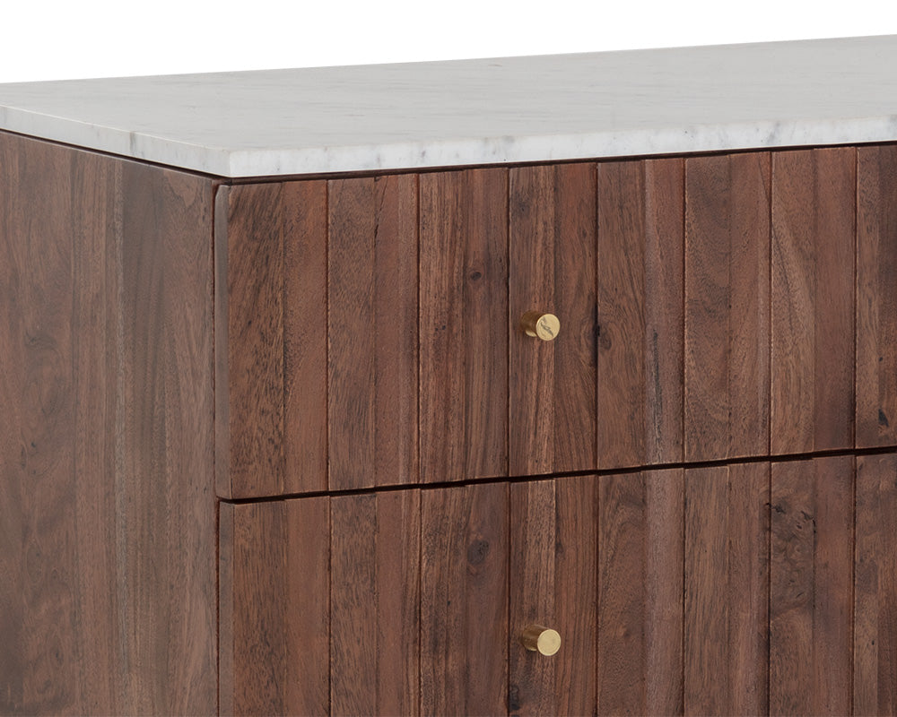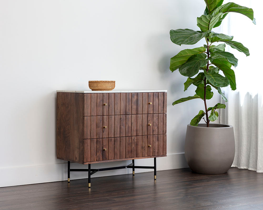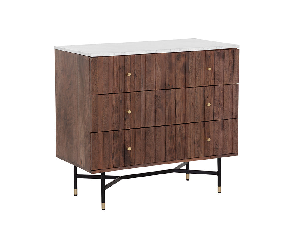 Expertly crafted from engineered wood and finished in a light brown palette with whitewashed undertones, the ELIZA is an elegant accent chest featuring three large pull-out drawers with elliptical details that offer ample storage space for a wide range of items. The ELIZA is braced by two solid metal legs finished in a matte-black tone that not only add to the visuals of the piece but also guarantee unparalleled stability and balance.