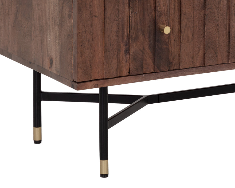 Inspired by mid-century modern designs, this cabinet evokes a timeless and minimalist style. Crafted with a matte black iron frame and features fluted glass doors.