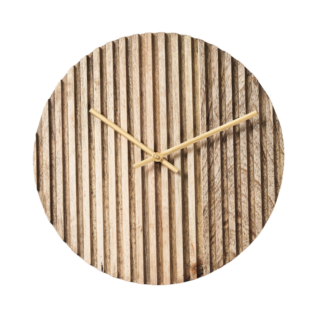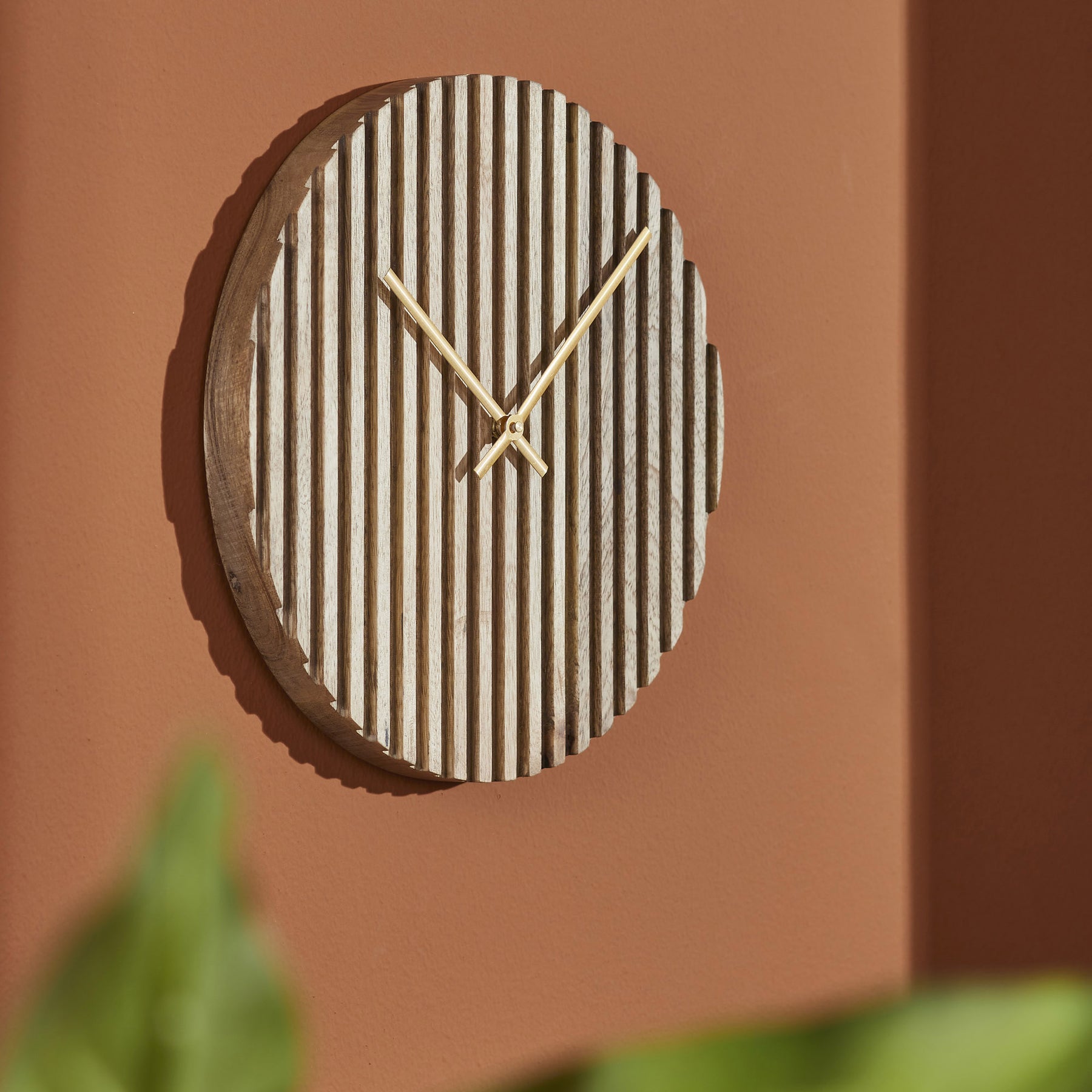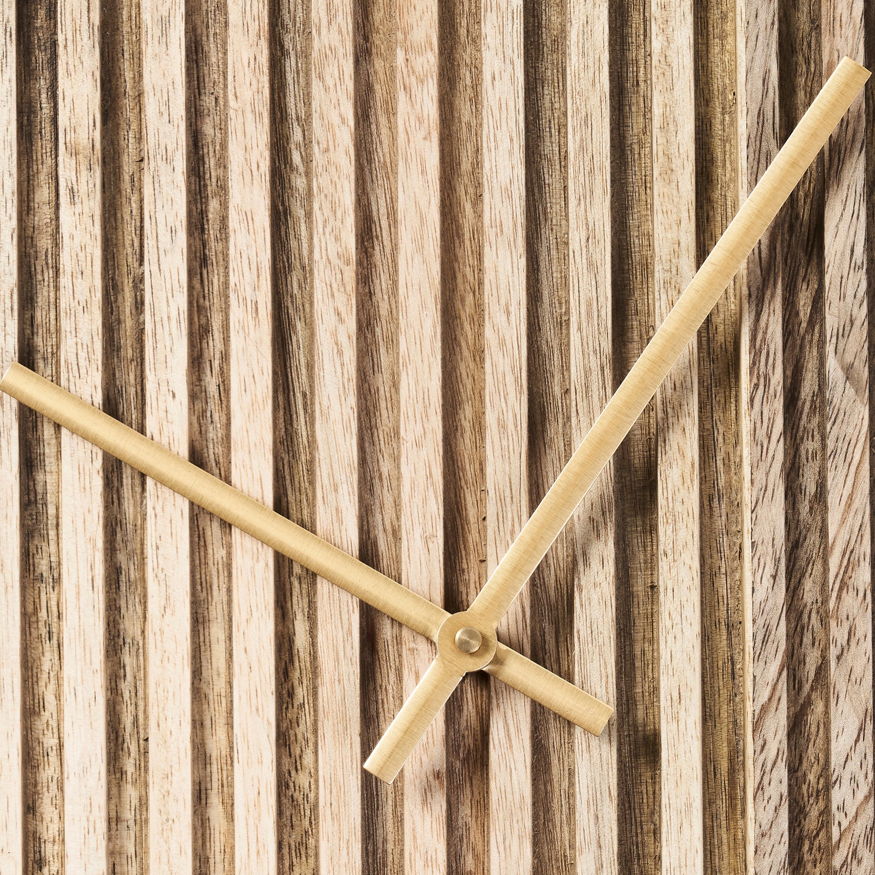 Regular price $229.00Organic elements combine with modern design in this wall clock. Set inside the mid-century modern interior, its intricate laser cut details catch the eye of every passerby. The iron antique brass finished watch hand complements the beauty of the mango wood’s natural varying hues.