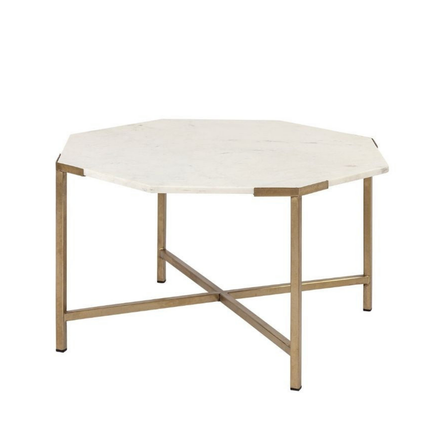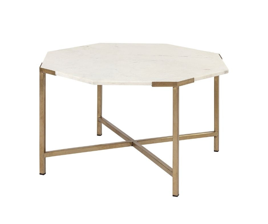 The PALOMA coffee table has an octagonal marble top that rests neatly upon a crisscross iron base. The white marble top has subtle cream undertones with gray and beige veining throughout, while the iron base has an unfussy matte gold finish. *Marble is a natural material. Each piece has its own beautiful intricacies, and some may carry naturally occurring fissures. Please expect variations in color and texture.