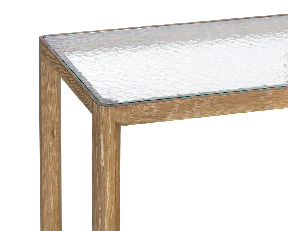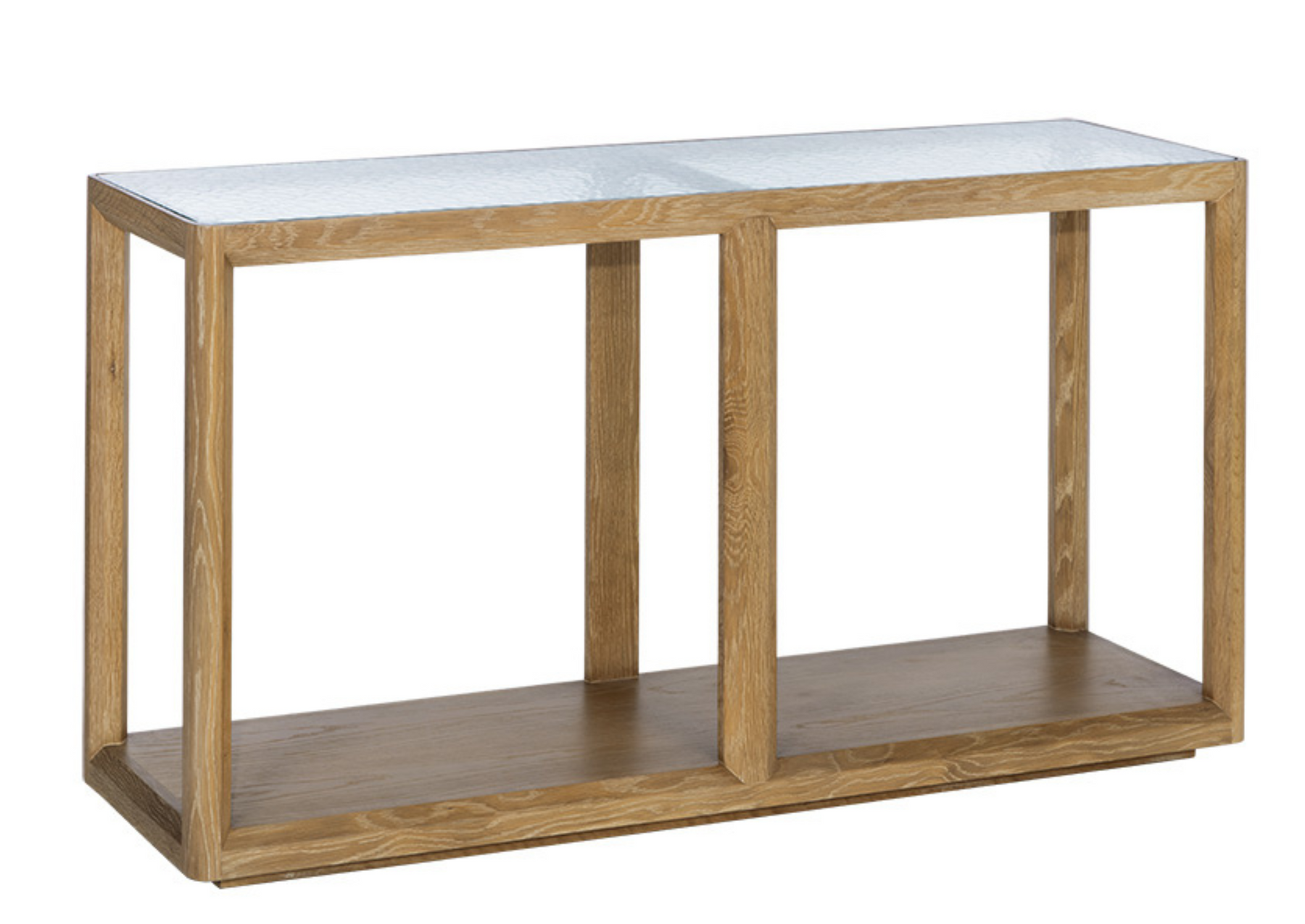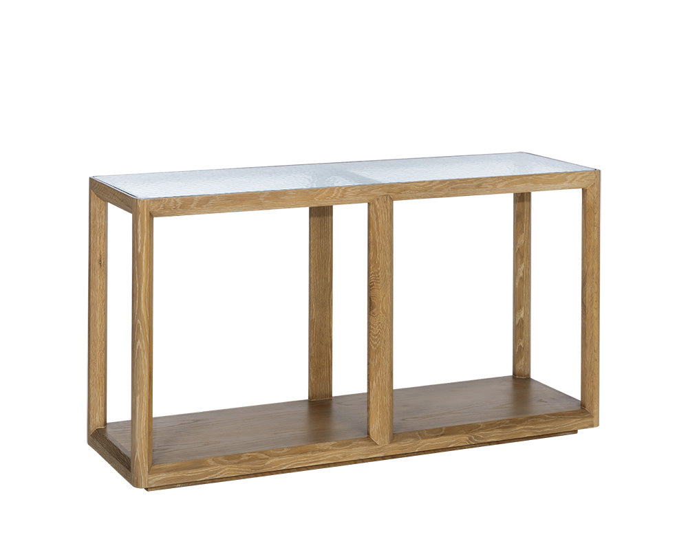 The AUDEN console table will bring warmth and style to various living and lounge spaces. The oak wood veneer top is complemented with architectural antique brass iron legs for added appeal. Cracks and deep lines in finish are part of the distressed look. Suitable for residential and contract environments.