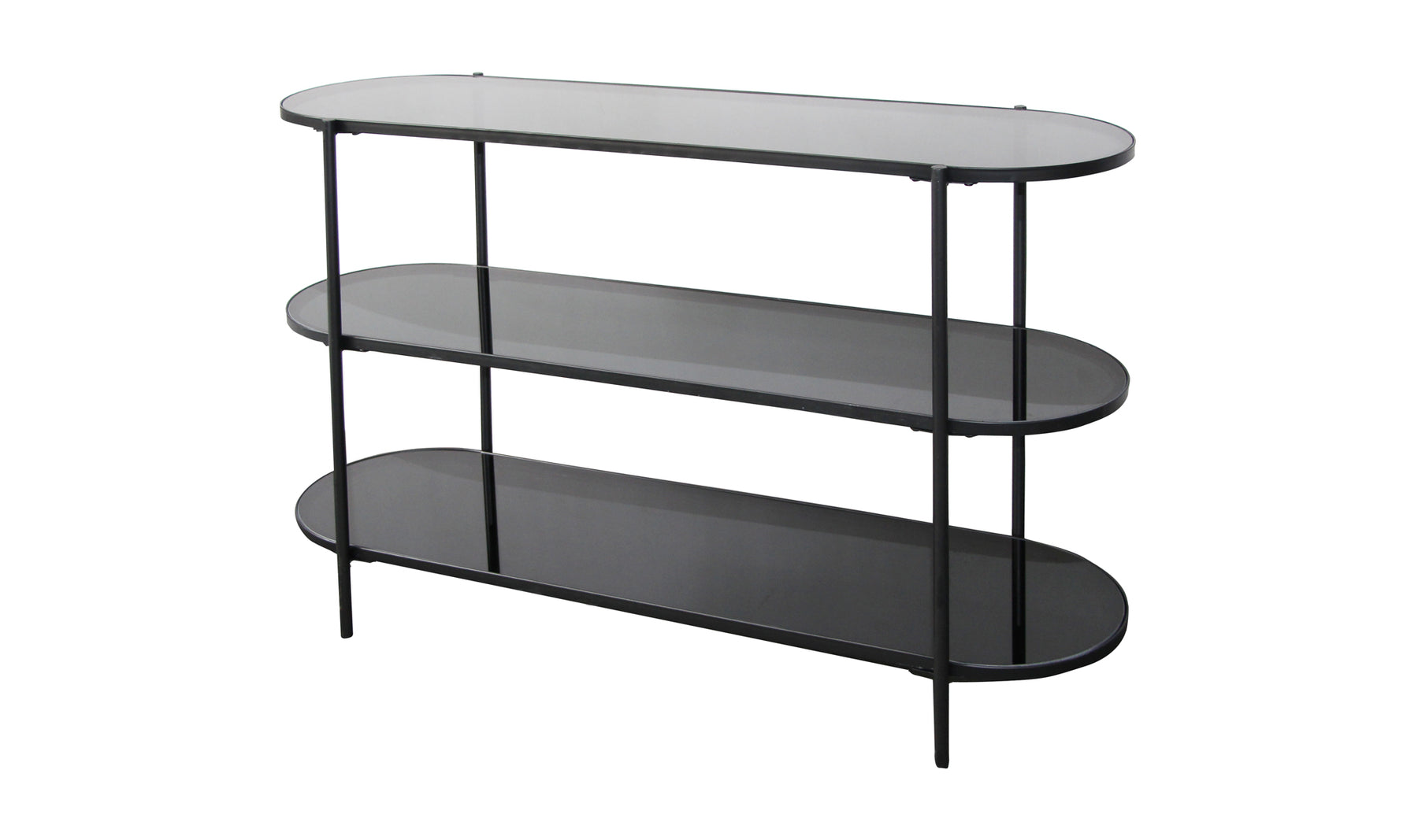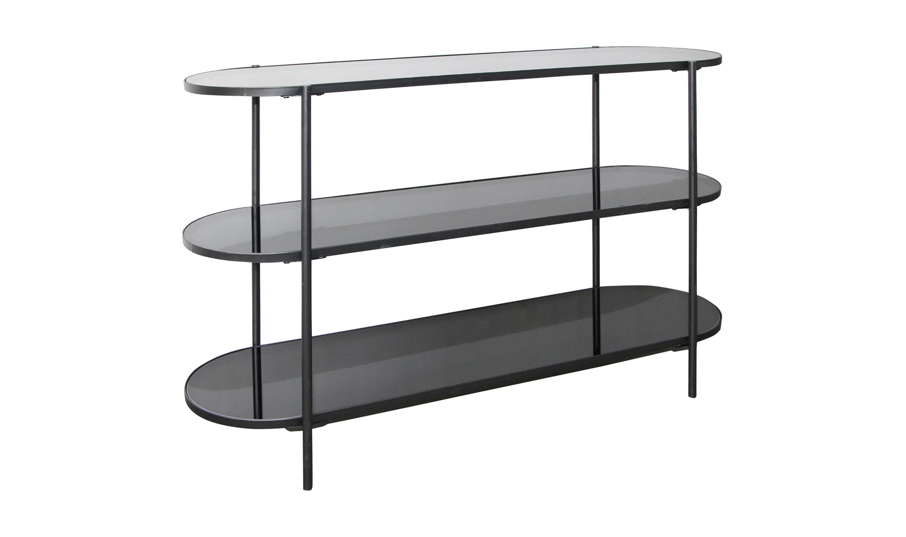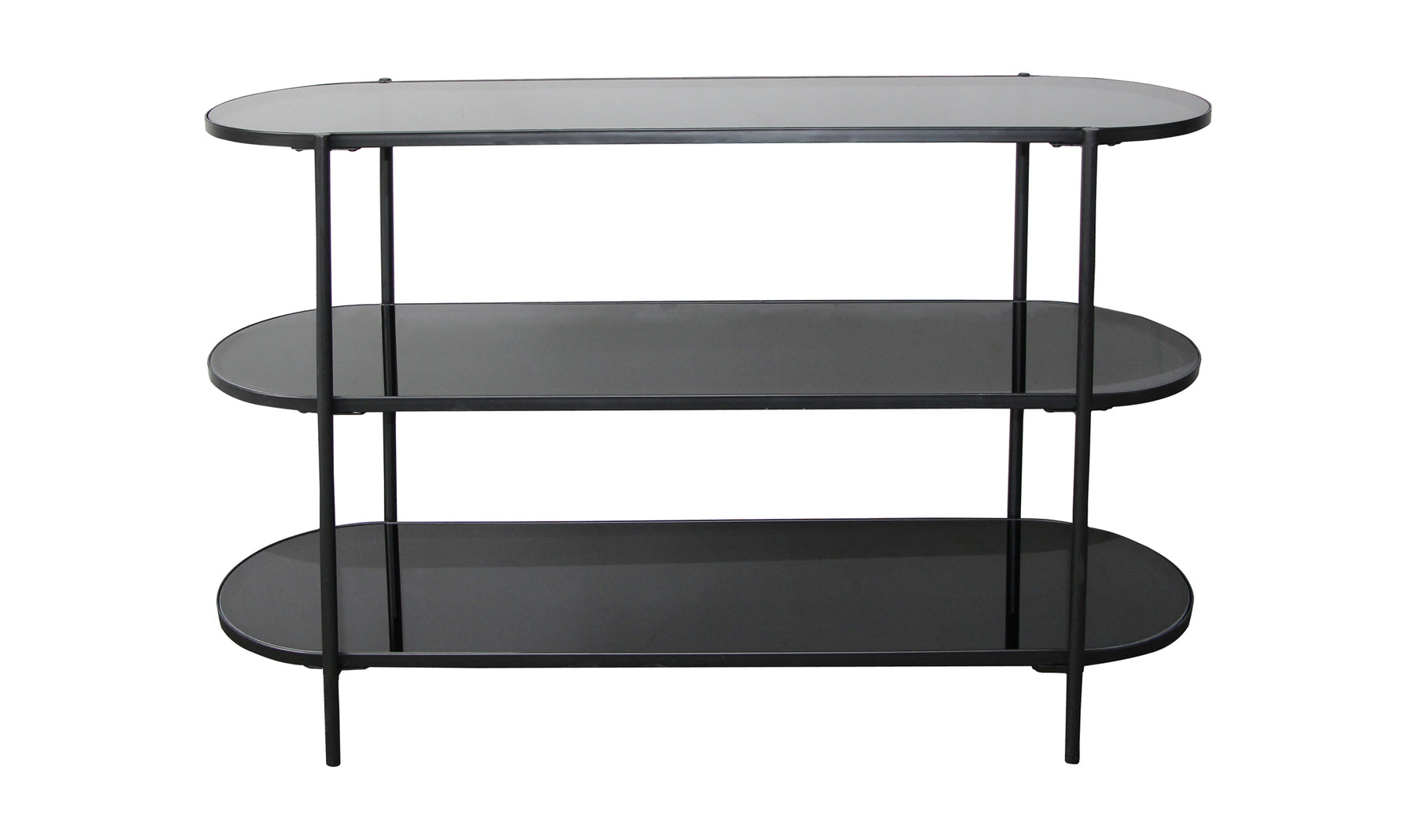 A modern console table designed to add a beautiful touch to living and lounge spaces. Crafted from charcoal grey oak wood veneer with three drawers and shelf for added storage. Brushed gold iron hardware completes the look.