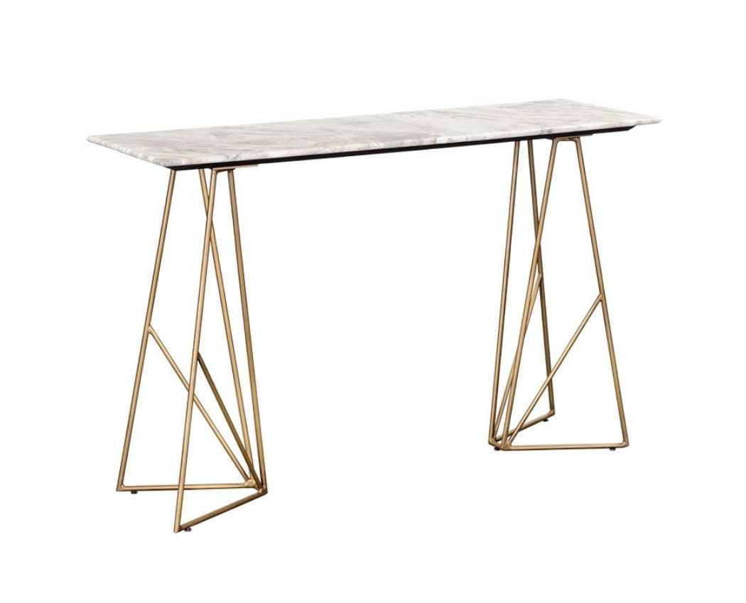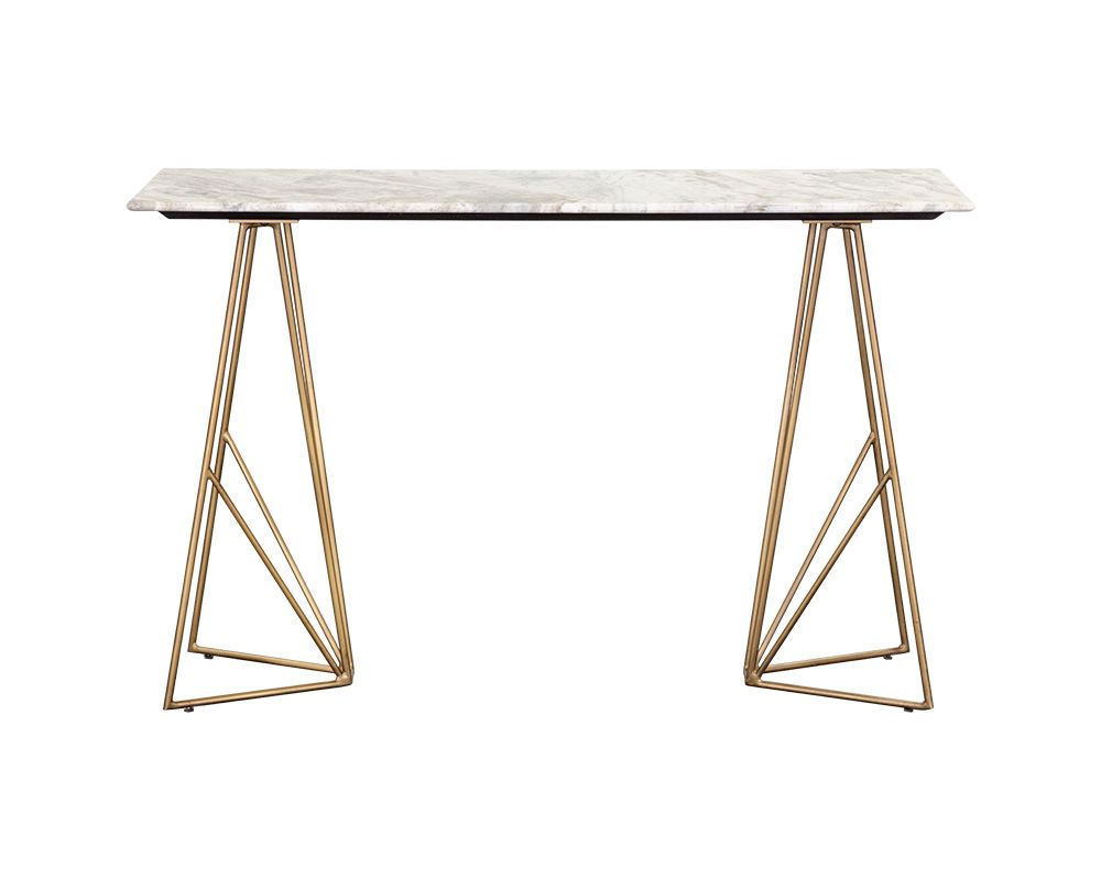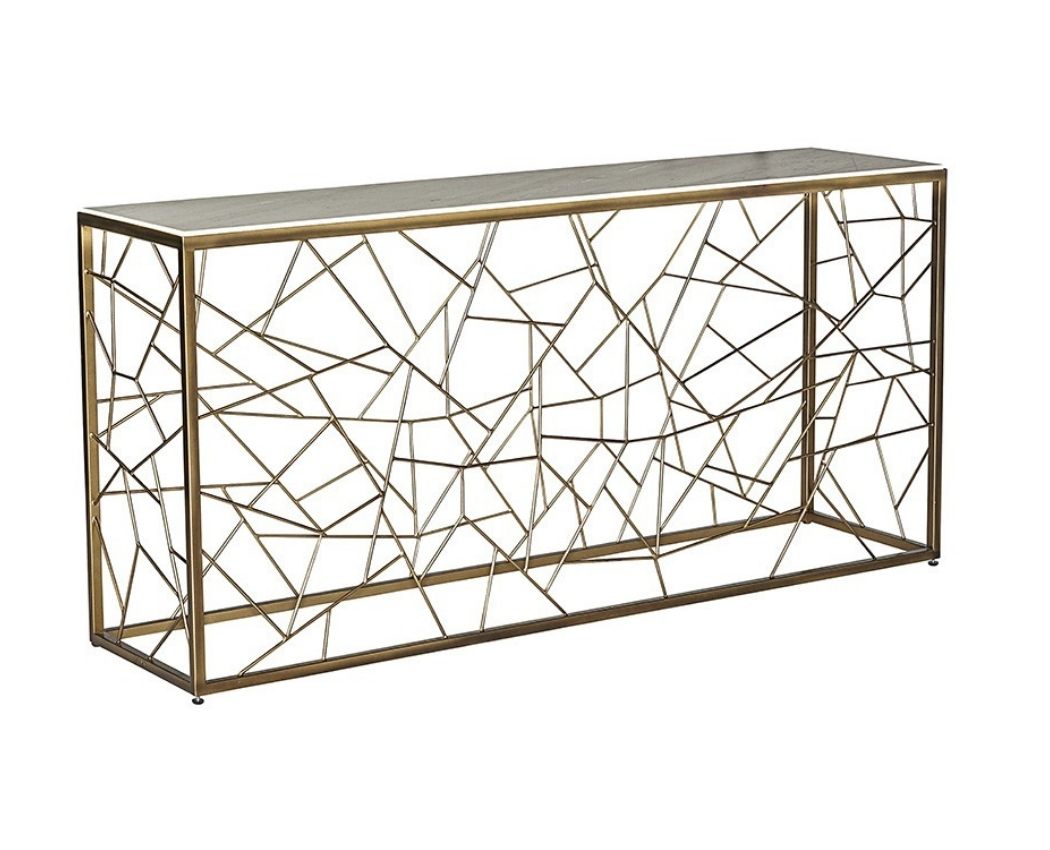 The large and dramatic VIANA console table is sure to be the center of attention in any room. A white marble top is beautifully paired with a rustic bronze steel frame in an intriguing webbed pattern. Suitable for lounge and living spaces in residential and commercial environments.