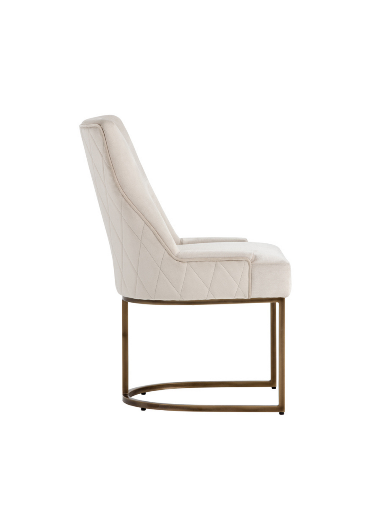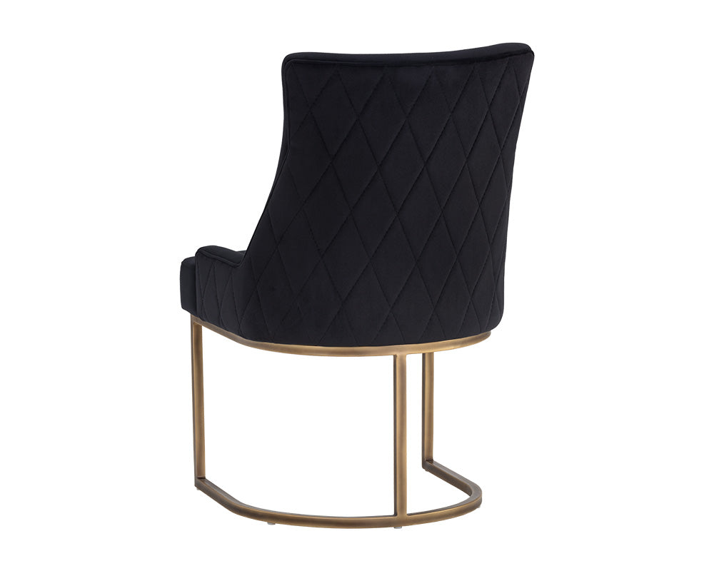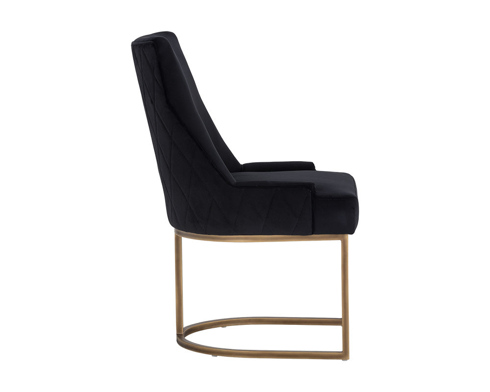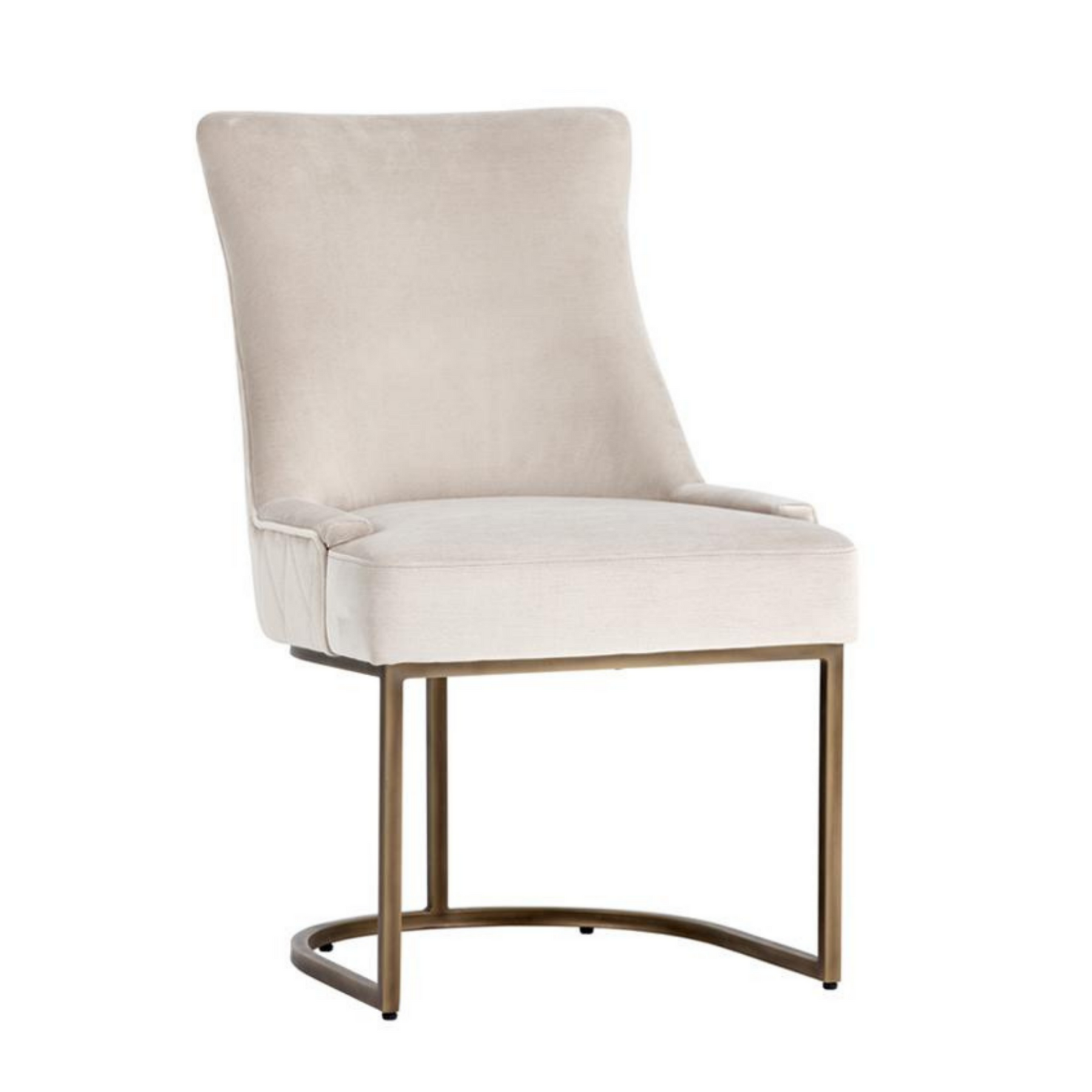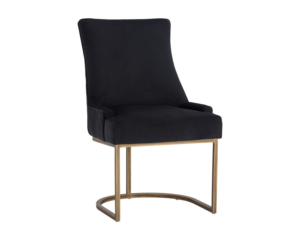 The FIORELLA dining chair offers transitional elegance. Features a beautifully sculpted seat in vegan leather and fabric options, with a rustic bronze cantilever frame. A diamond stitched pattern on the exterior seatback adds a touch of beauty to complete the look.