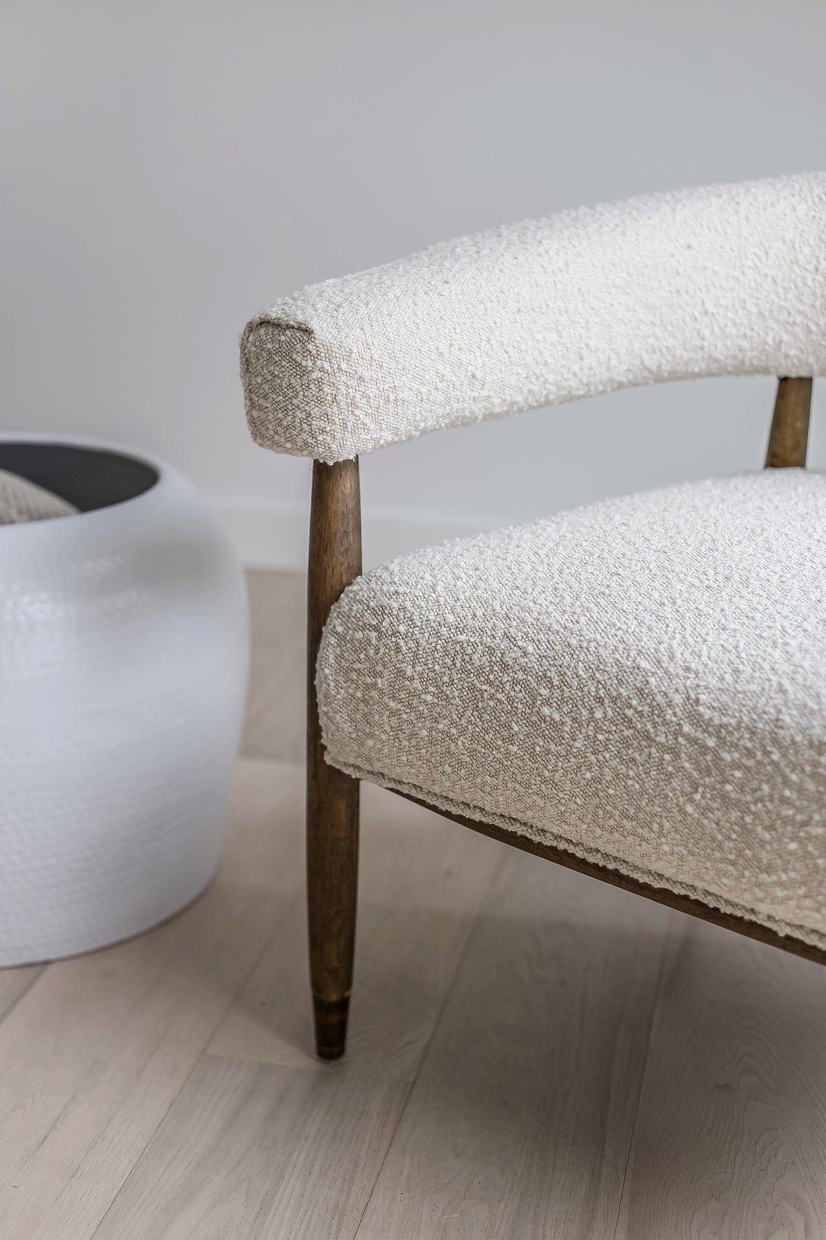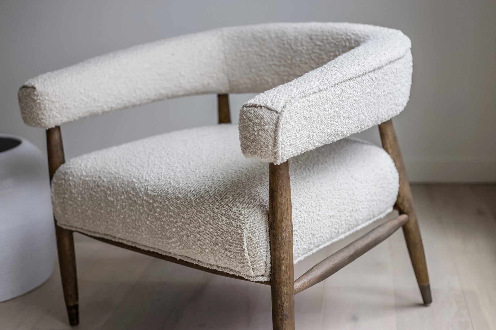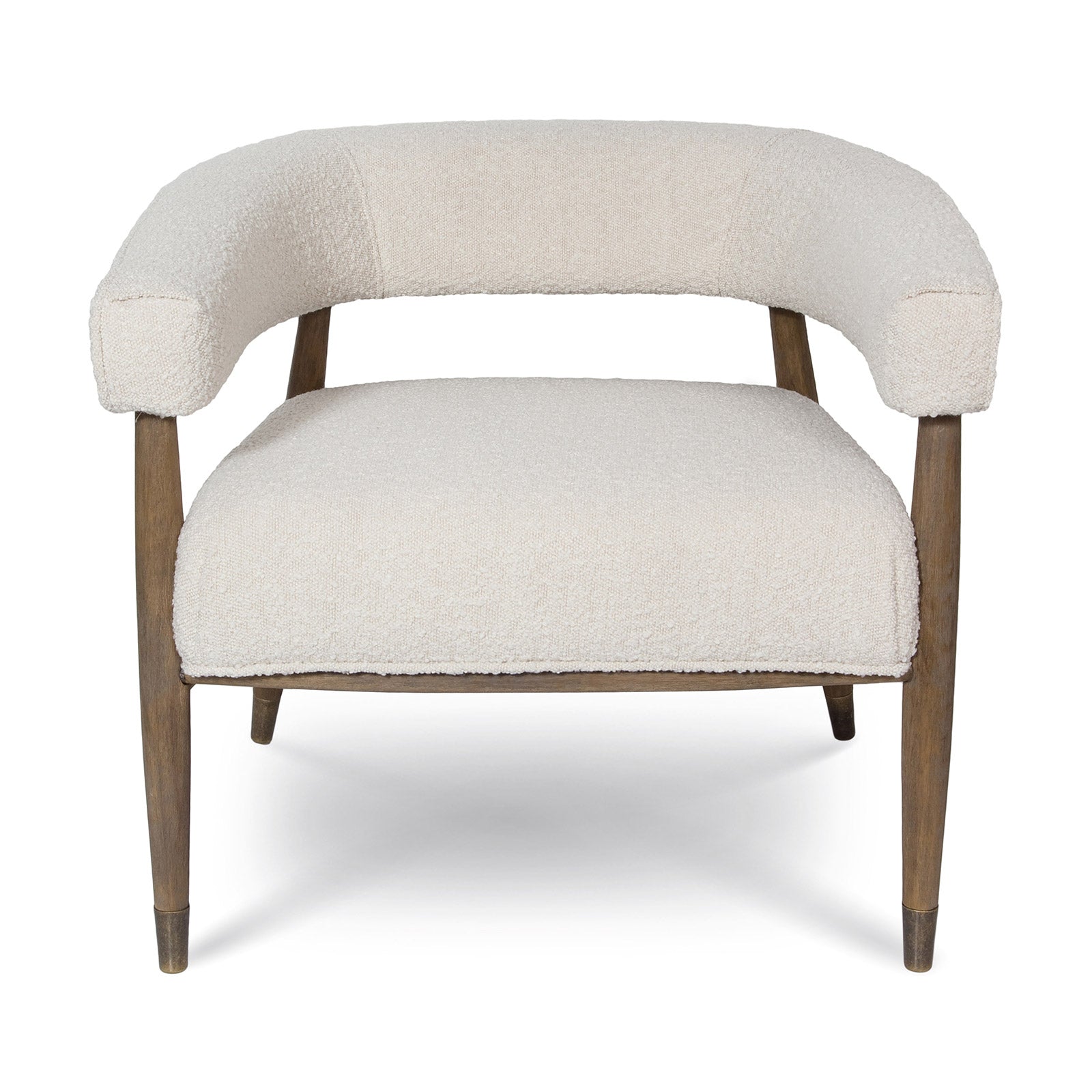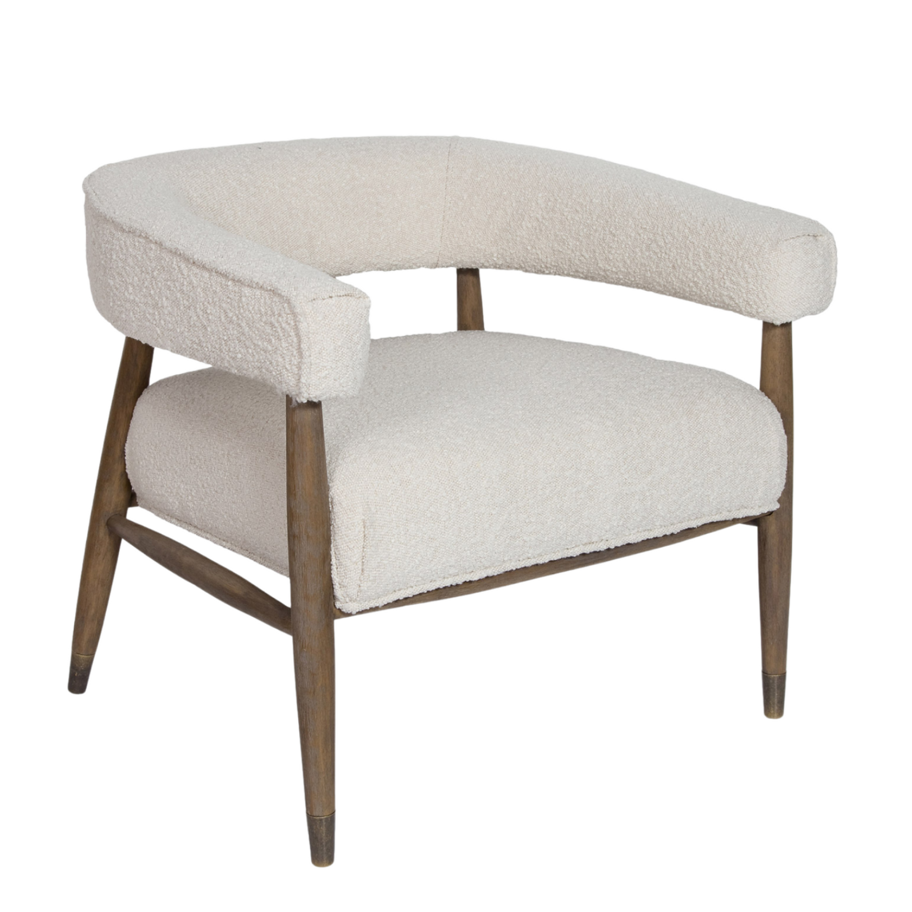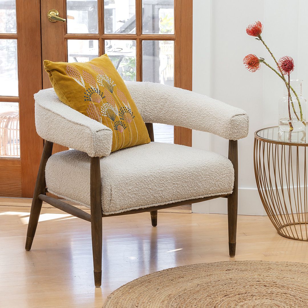 With its rounded curves and cozy boucle fabric, our ELEODORA lounge chair has taken mid-century modern design into the new millennium. Supported by a warm walnut tone frame, ELEODORA is as comfortable as it is stylish. Perfectly sized for the bedroom or living room, this occasional chair sits like a dream.