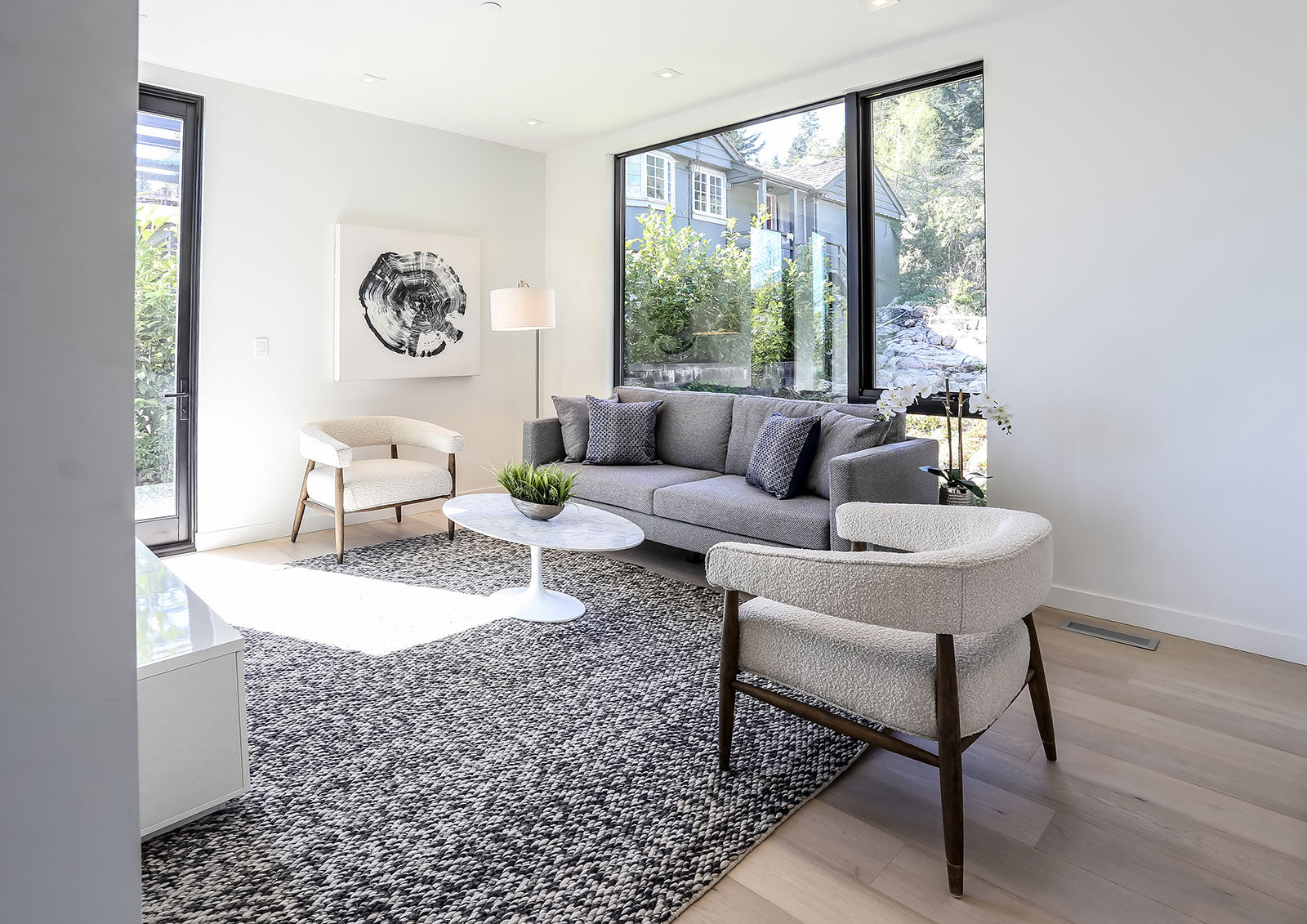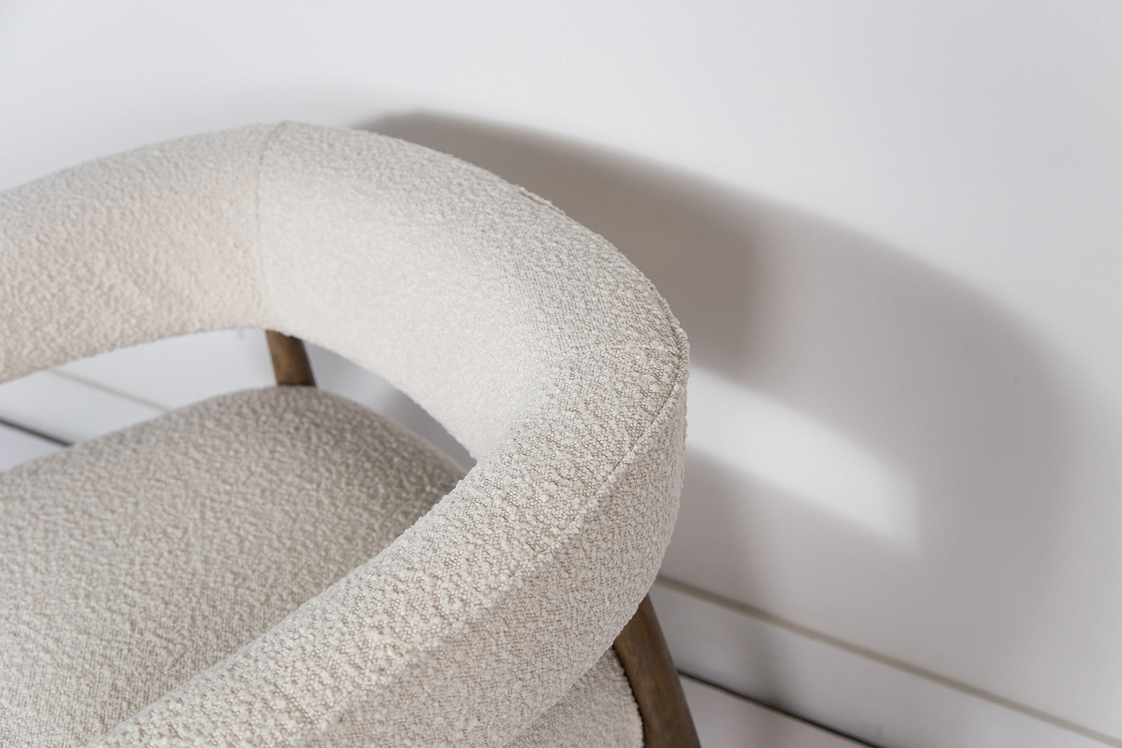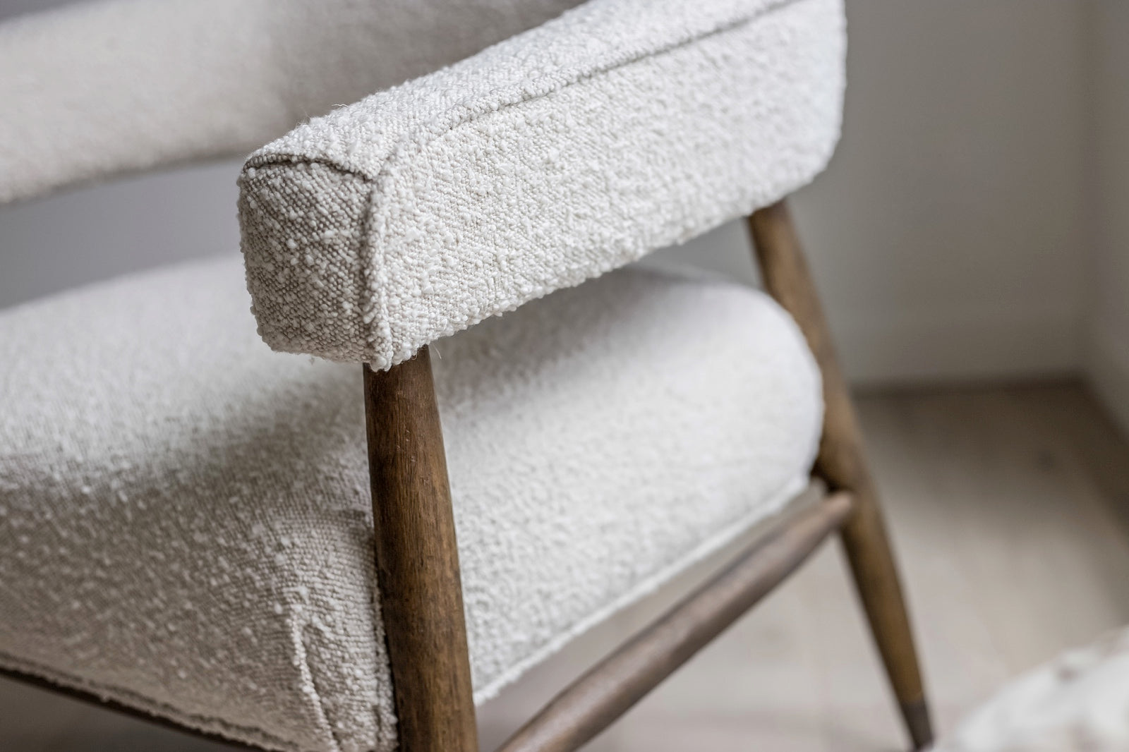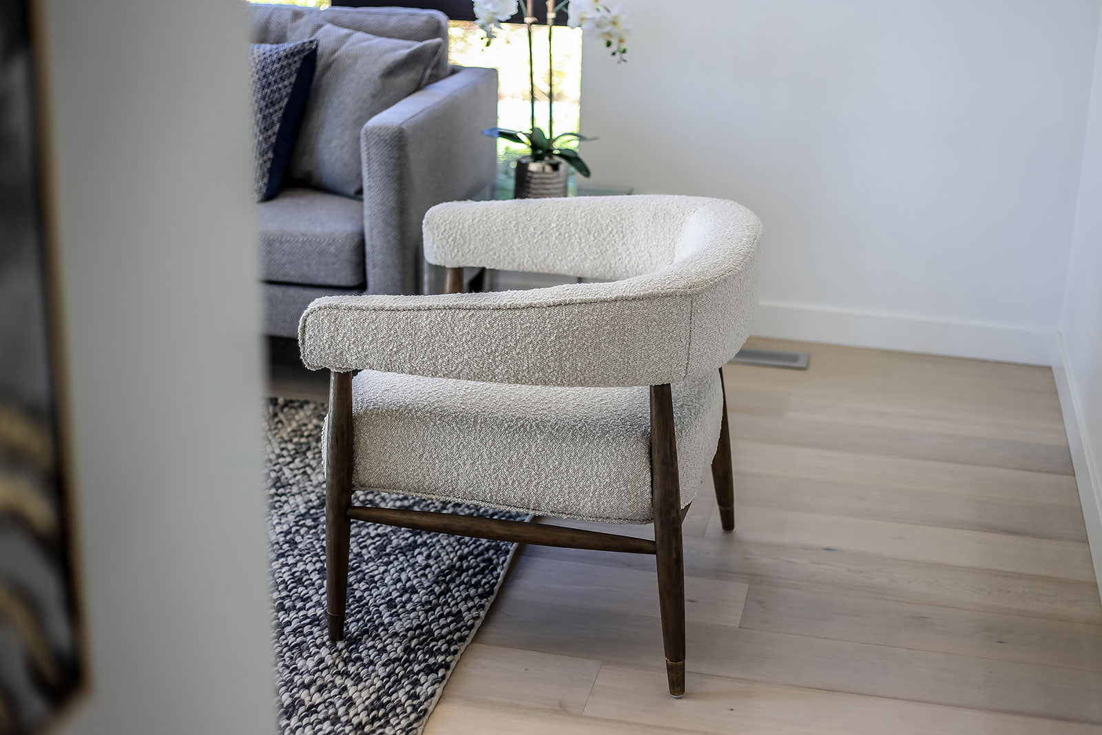 With its rounded curves and cozy boucle fabric, our ELEODORA lounge chair has taken mid-century modern design into the new millennium. Supported by a warm walnut tone frame, ELEODORA is as comfortable as it is stylish. Perfectly sized for the bedroom or living room, this occasional chair sits like a dream.