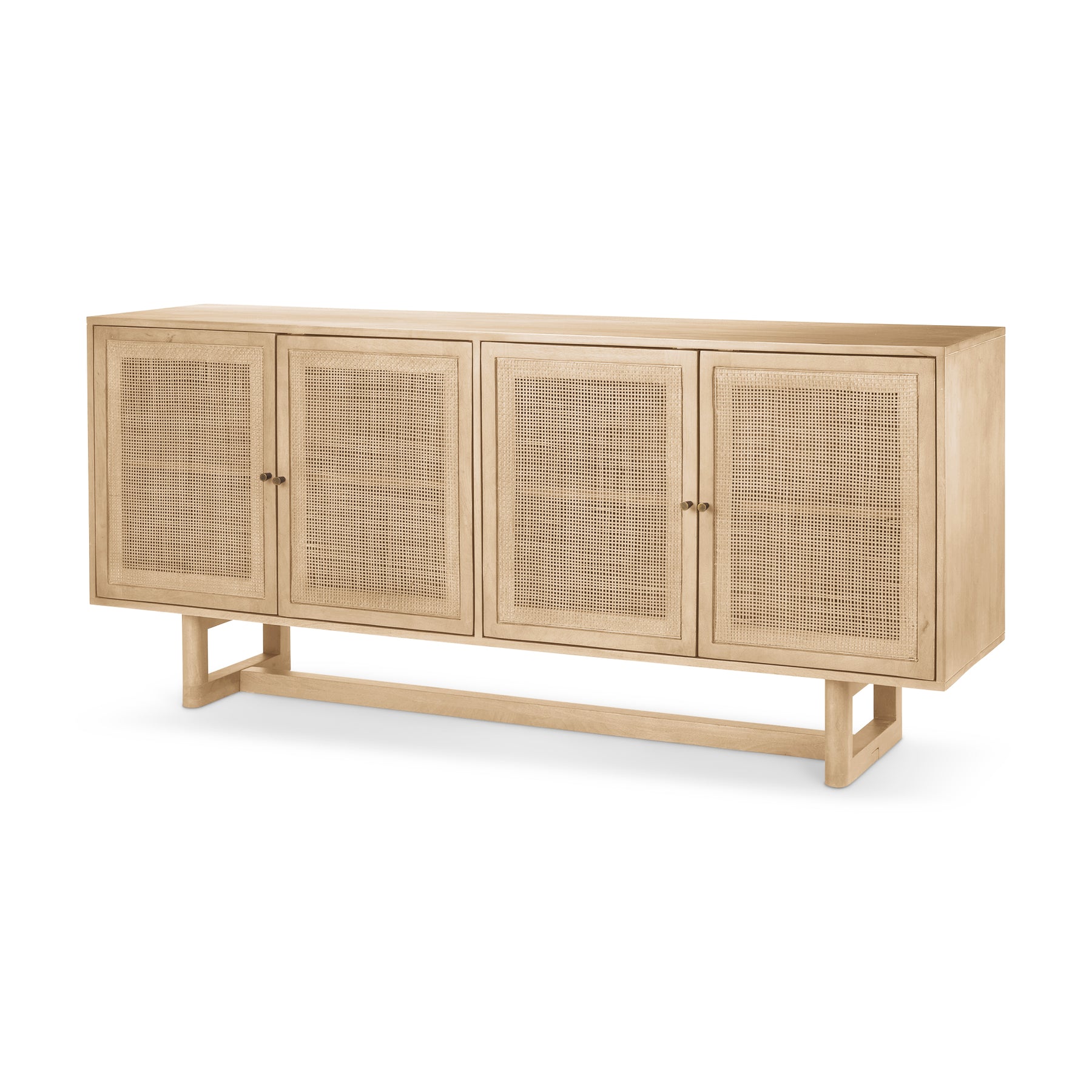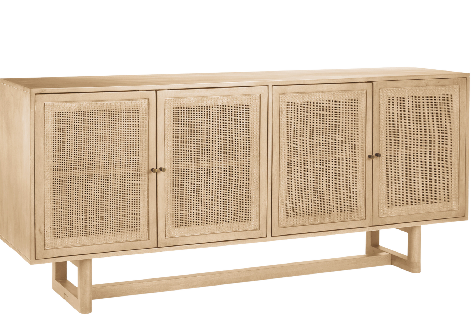 Sleekly crafted from solid Mango wood and finished with classic cane details, the CALLISTA sideboard brings a sense of airiness and relaxed sophistication to contemporary living spaces. This sturdy piece offers two spacious cabinets with removable shelves for storage flexibility. Delicate gold accents and an open trestle base elevate its look.
