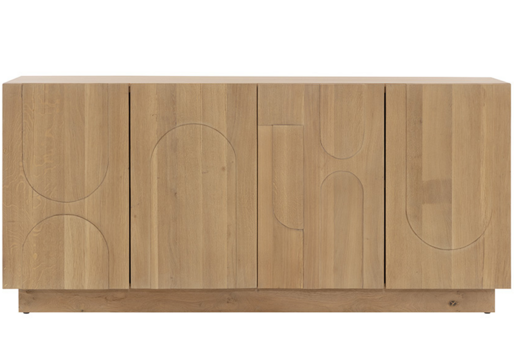 Taking cues from Scandinavian design, this mid-century modern sideboard is revitalized with beautiful wood patterning. Crafted from a brown solid oak wood frame in a rustic finish, and completed with four cabinets for ample storage space. Anti-tipping kit included. As wood is an organic, porous material, these pieces will contain natural variation of texture and may also exhibit fine indentations and cracks. Wood pieces will also display a disparity of colour and grain, and visible knots and burls that add to the character of each piece.