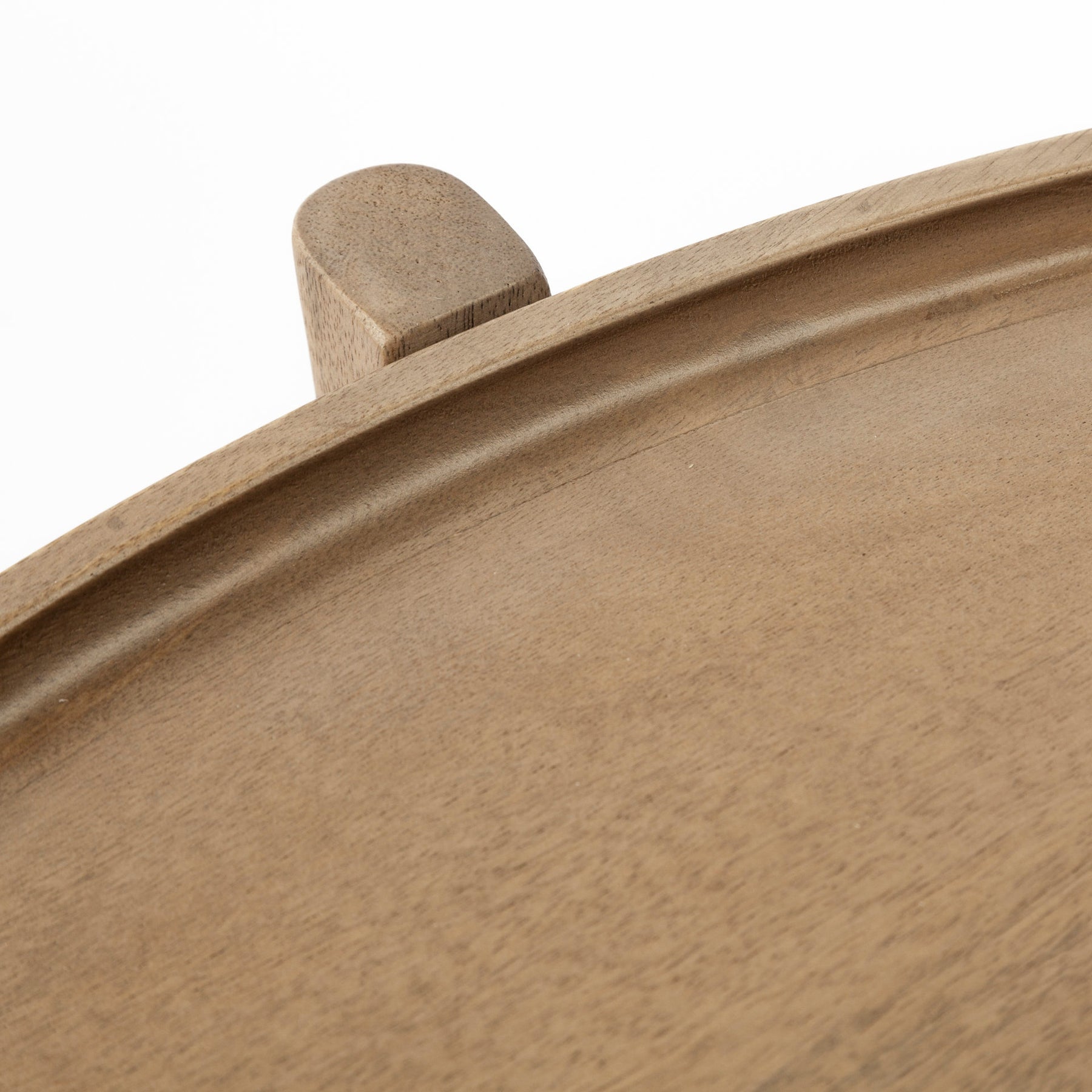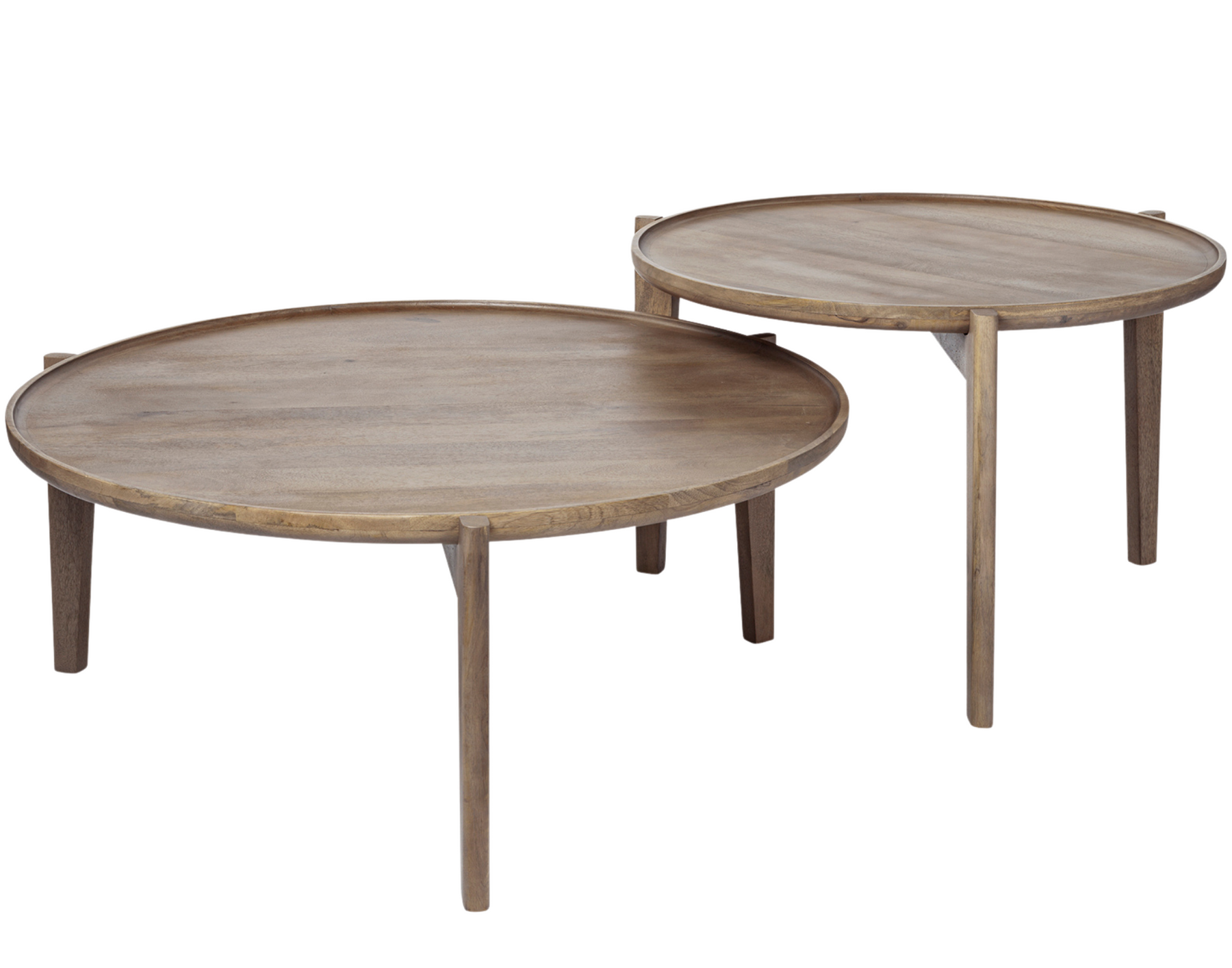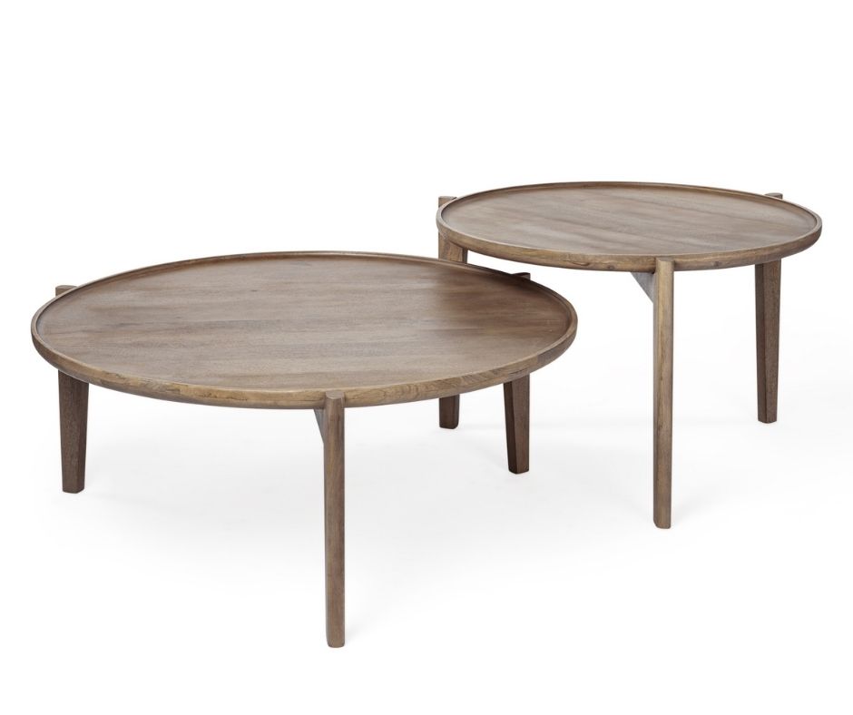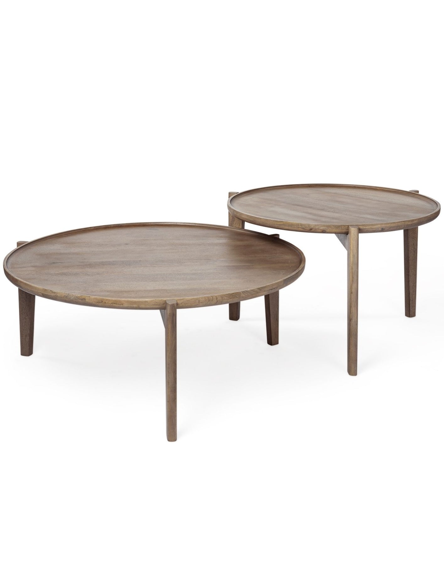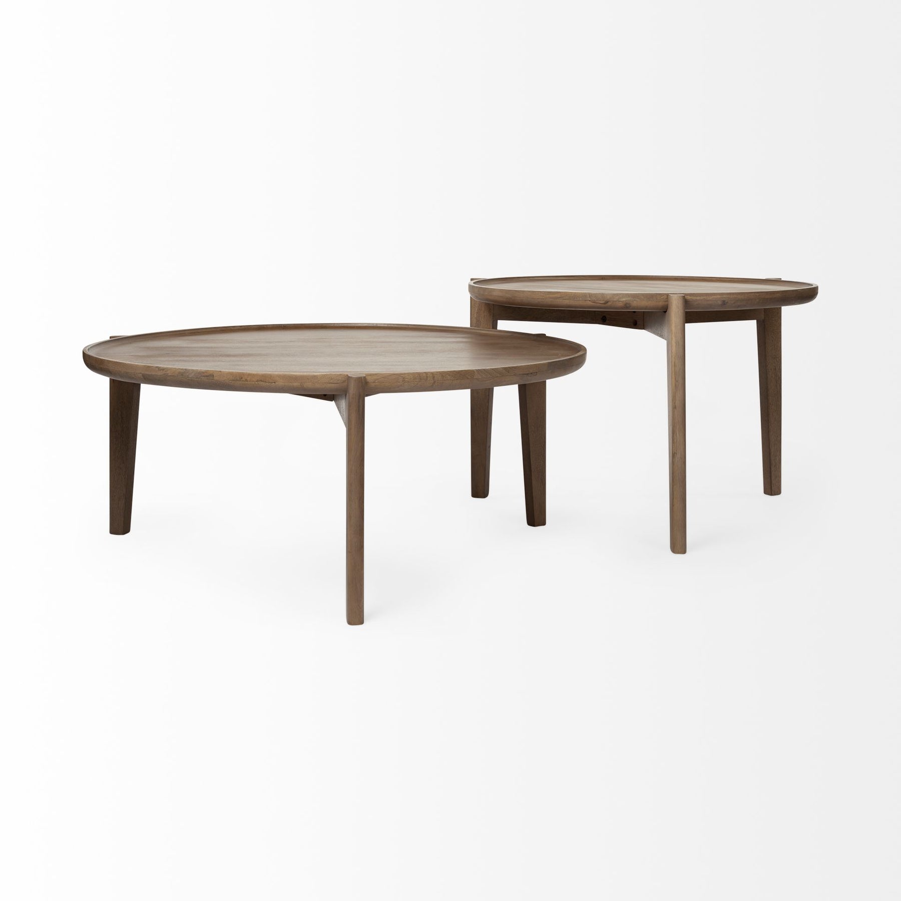 The BACALAR is a set of two uniquely designed, partially-nesting round coffee tables that look great in any modern living room. The two tables feature a smoothly polished, dark brown-toned, raised edge top braced by a three-legged, solid wood base. The base, finished in a matching, dark brown polish, not only complements the top and adds to the table's visuals but also stabilizes it to perfection. A result of the harmonious blend between style and functionality.