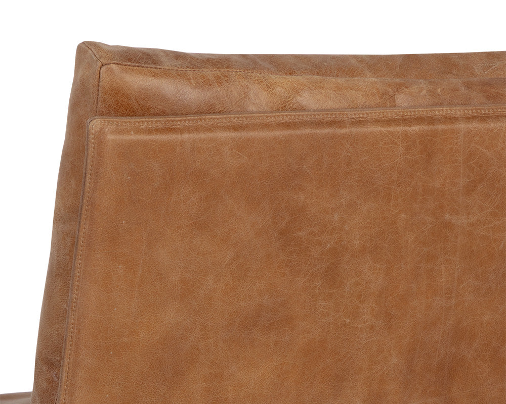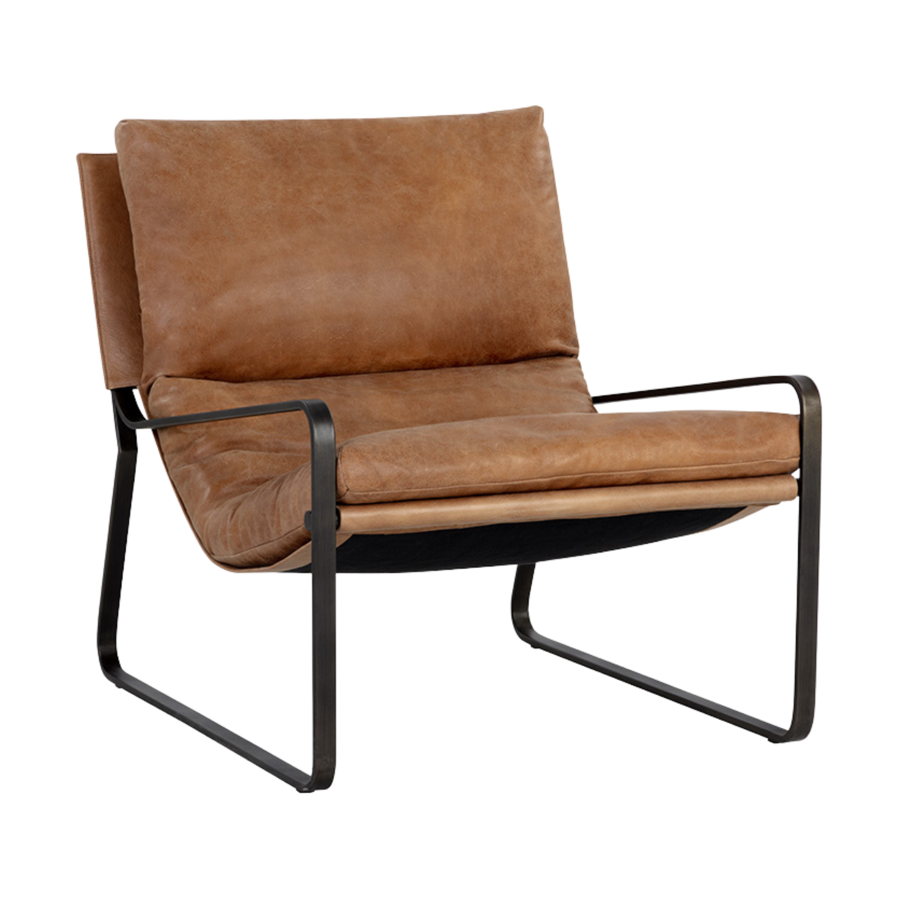 Unwind in comfort with this incredible lounge chair that features a stylish scooped seatback. Upholstered in tan leather and completed with a gunmental steel frame.