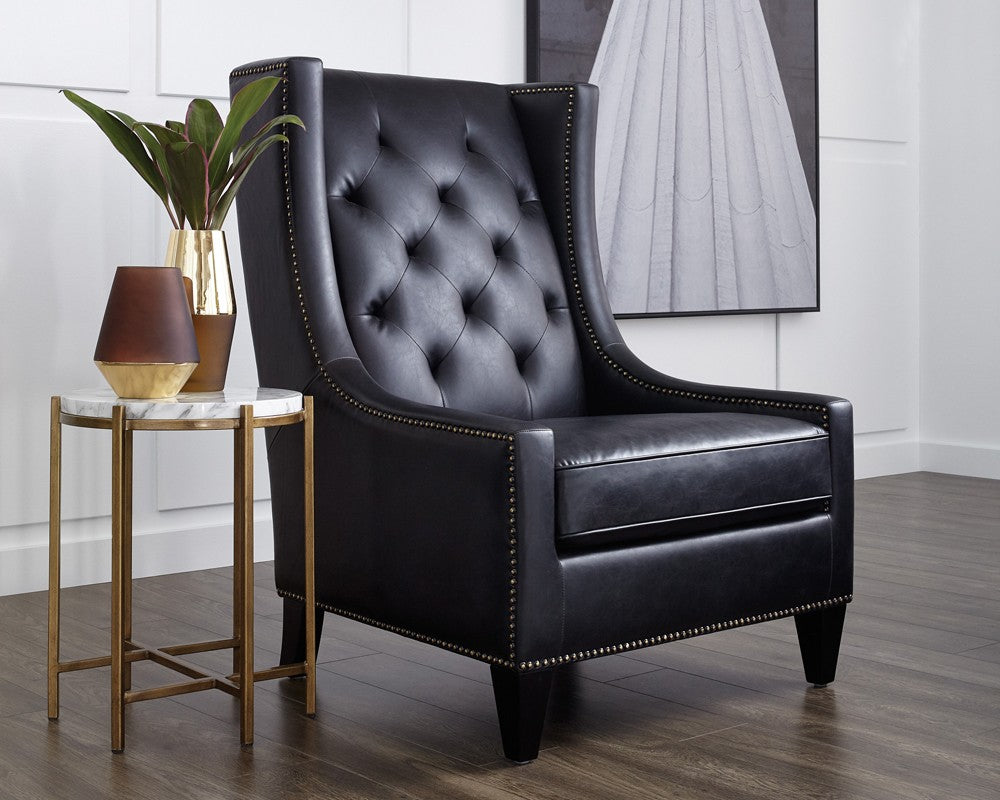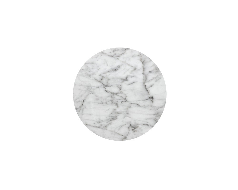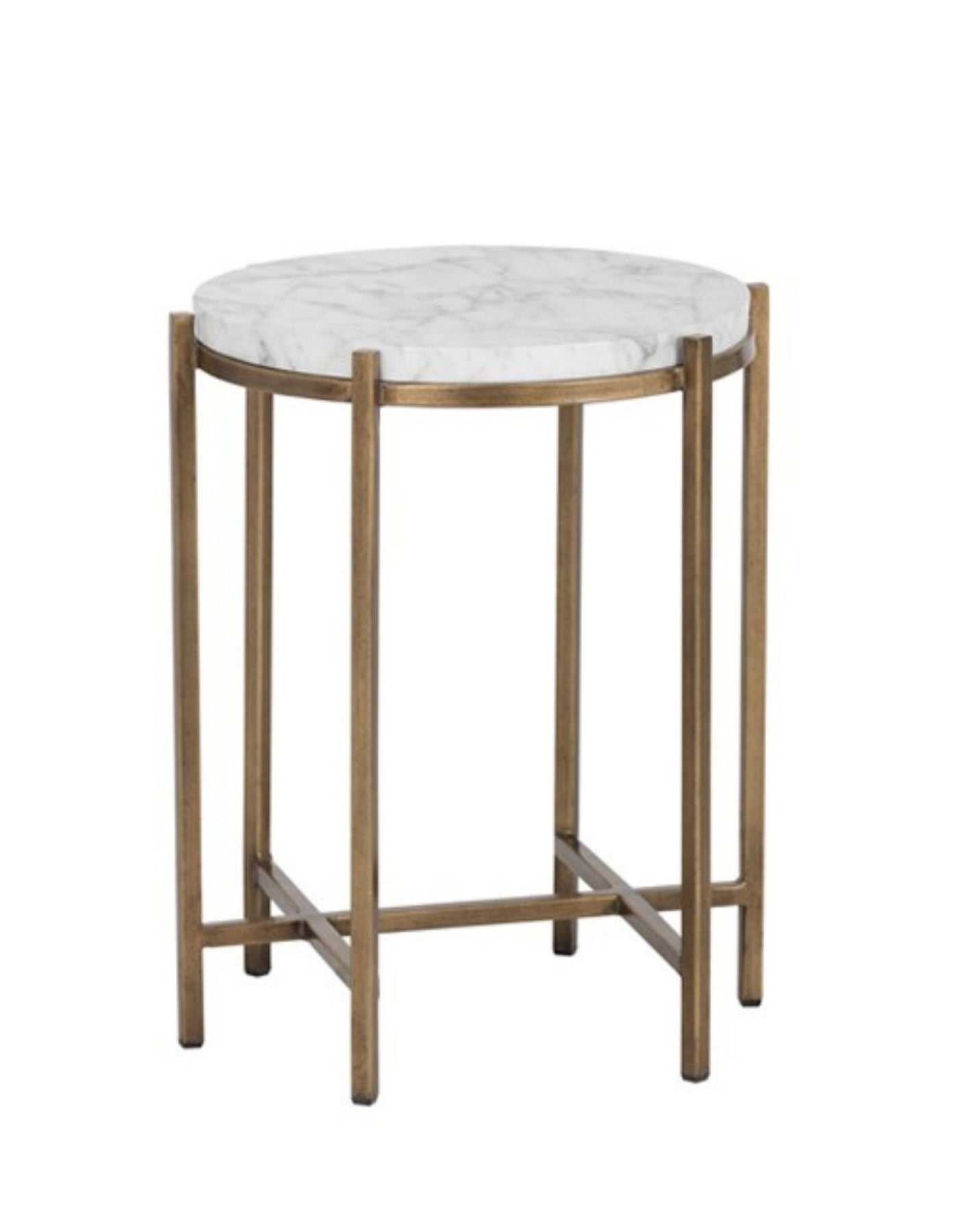 This round end table combines natural and industrial elements for a dramatic look. Features a white marble look film top supported by an architecturally designed brushed antique brass metal base. Suitable for residential and contract environments.