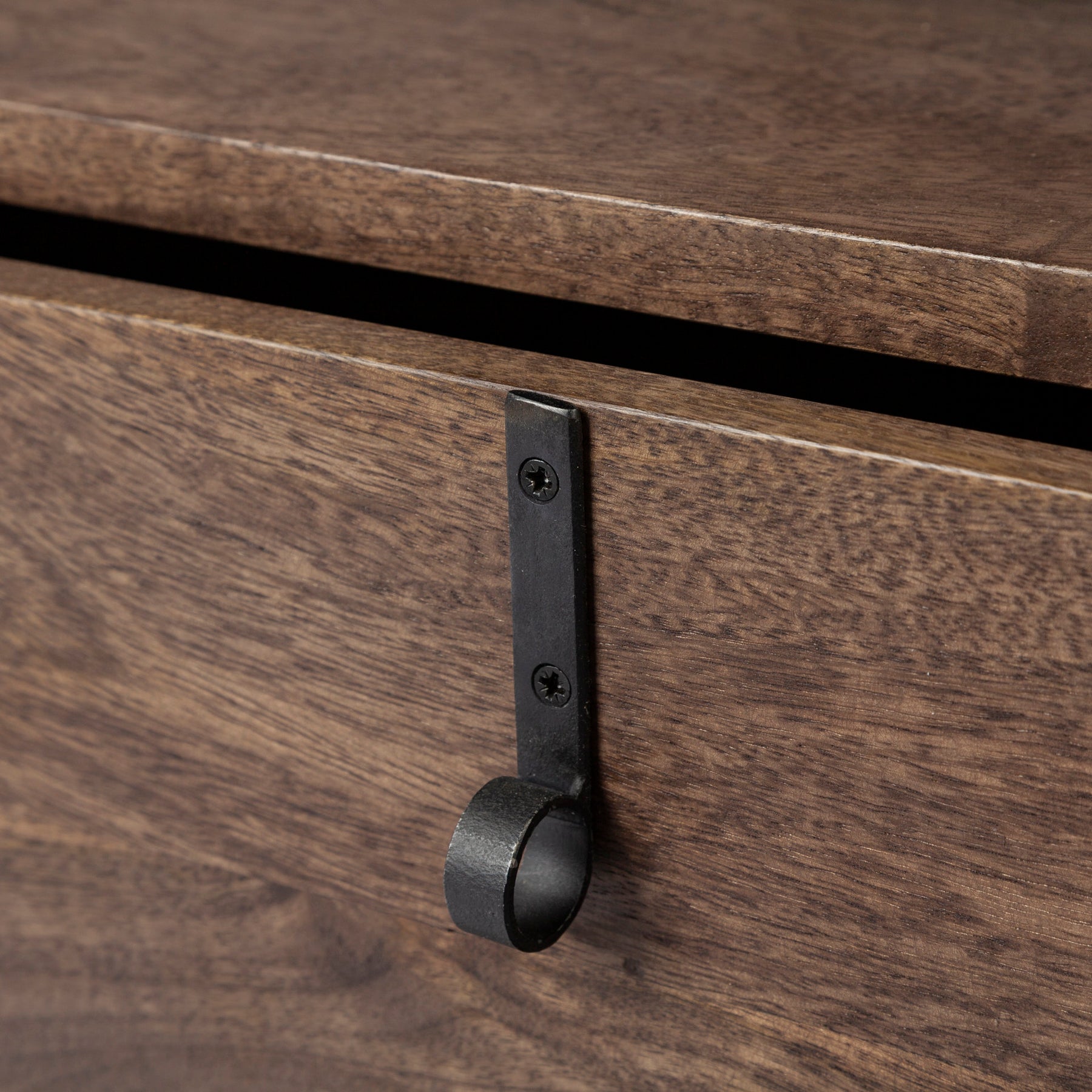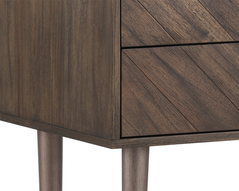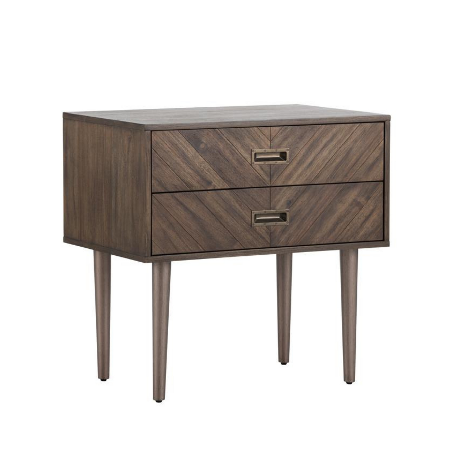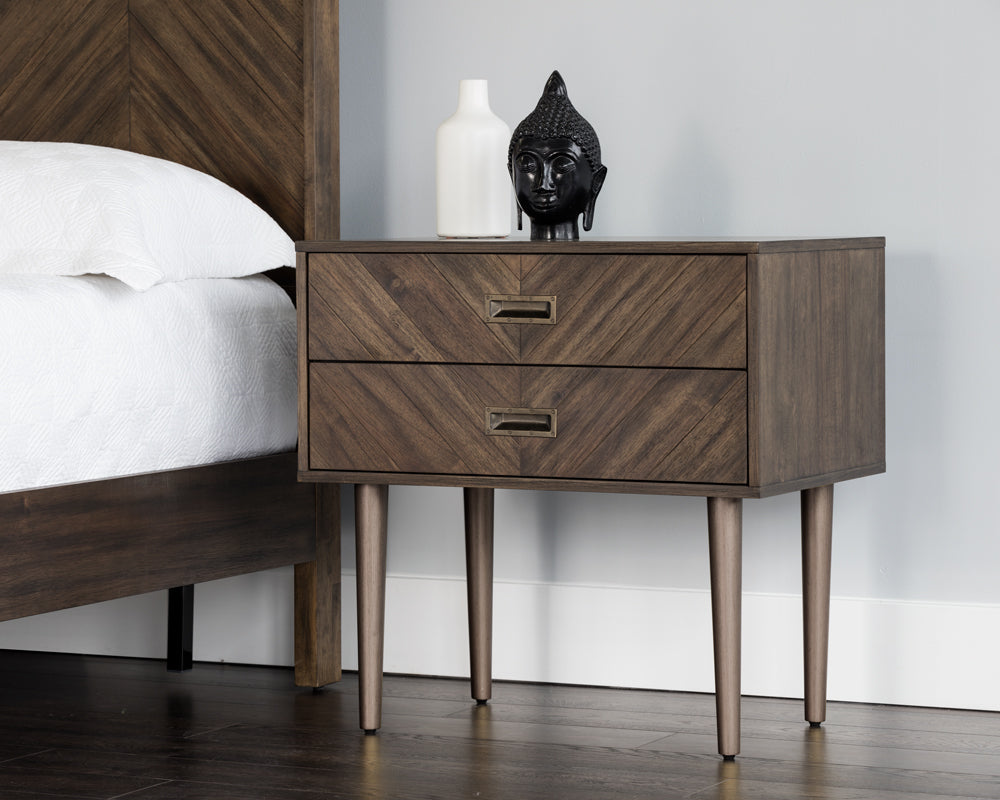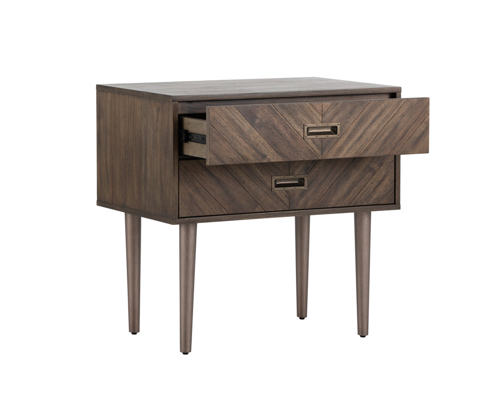 This uniquely crafted nightstand will add transitional allure to any bedroom. Made from acacia wood veneer with two drawers for ample storage. Alternating wood grain patterns on the drawer fronts and antique brass hardware complete the look. Suitable for residential and contract settings
