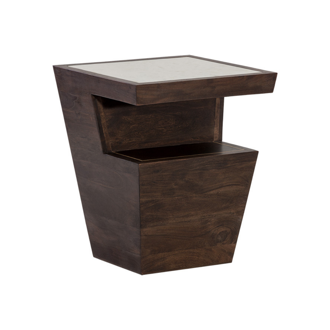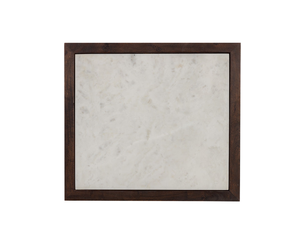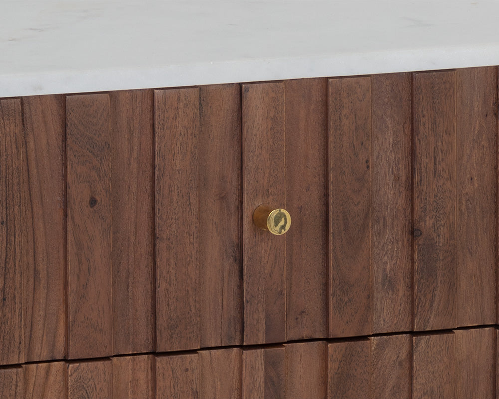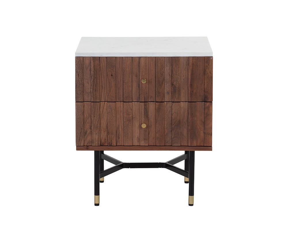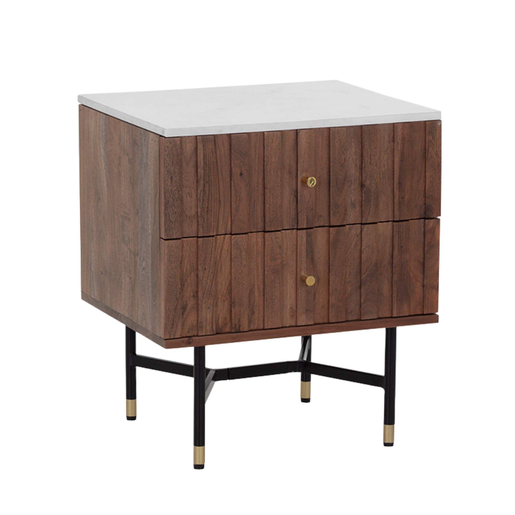 Marrying two rich materials with distinct textures, this nightstand evokes a design that is inspired by global travels. Made with a brown solid acacia wood frame and features a white marble top. Includes two drawers, and completed with a black iron base and brass accents.