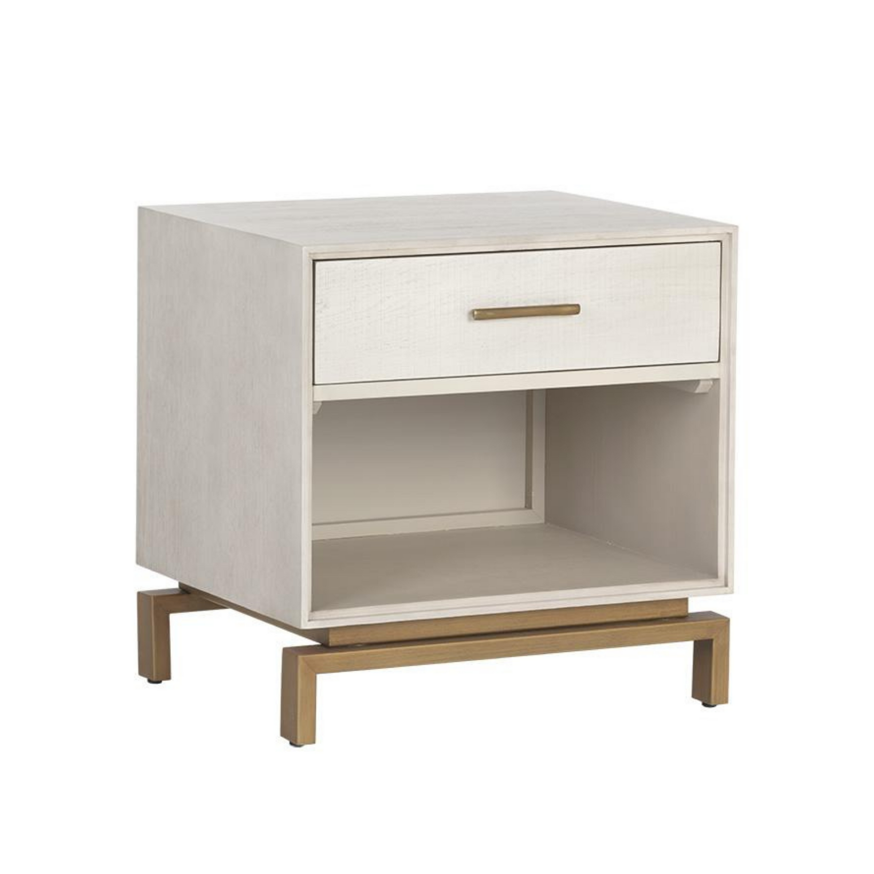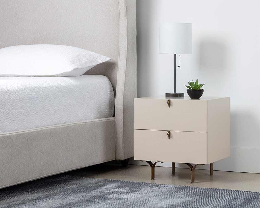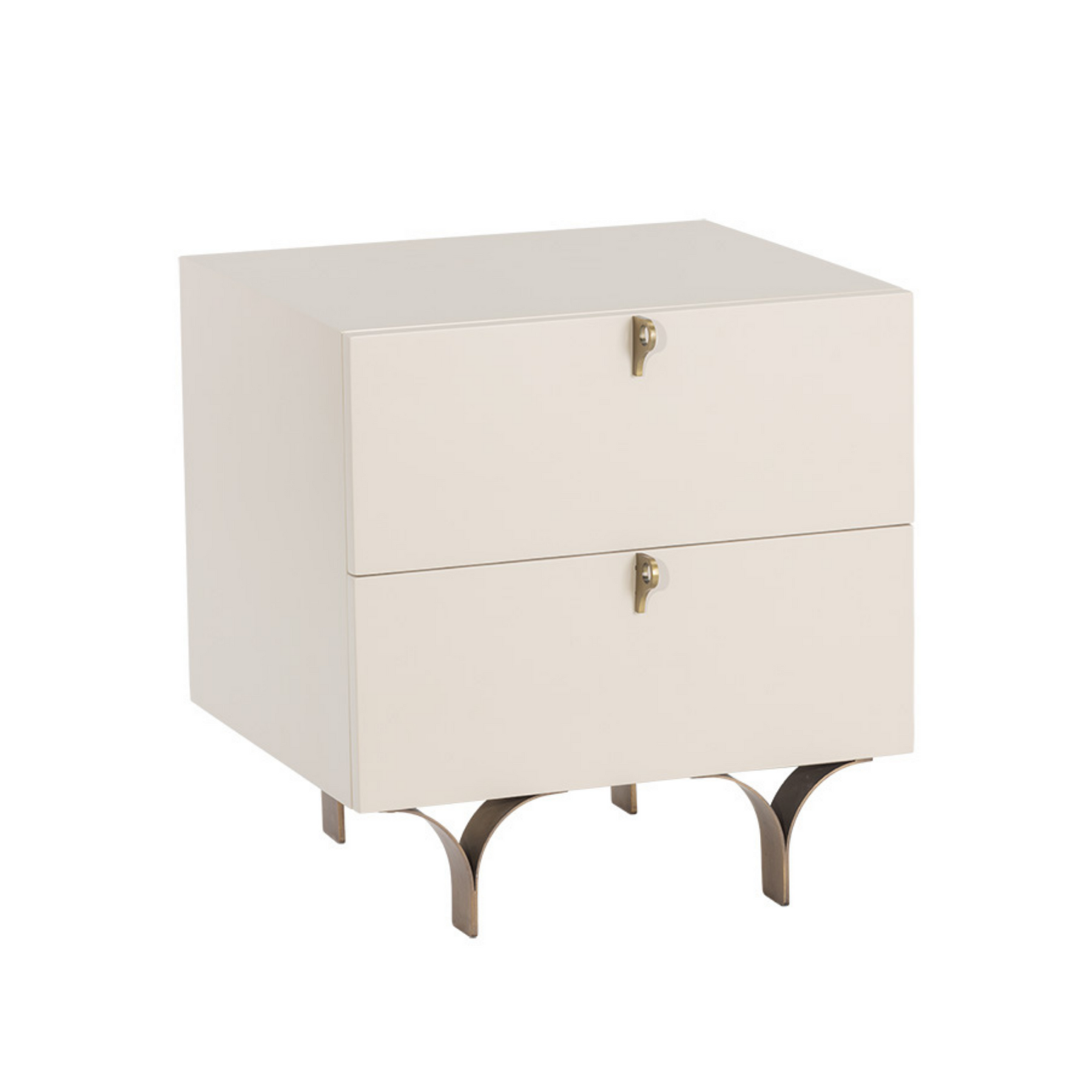 Add beauty to your bedroom oasis with this stylish nightstand. Designed with two soft closing drawers crafted from rubberwood, featuring a subtle wood grain texture and a painted cream finish. Uniquely sculpted antique brass feet and drawer pulls complete the look.