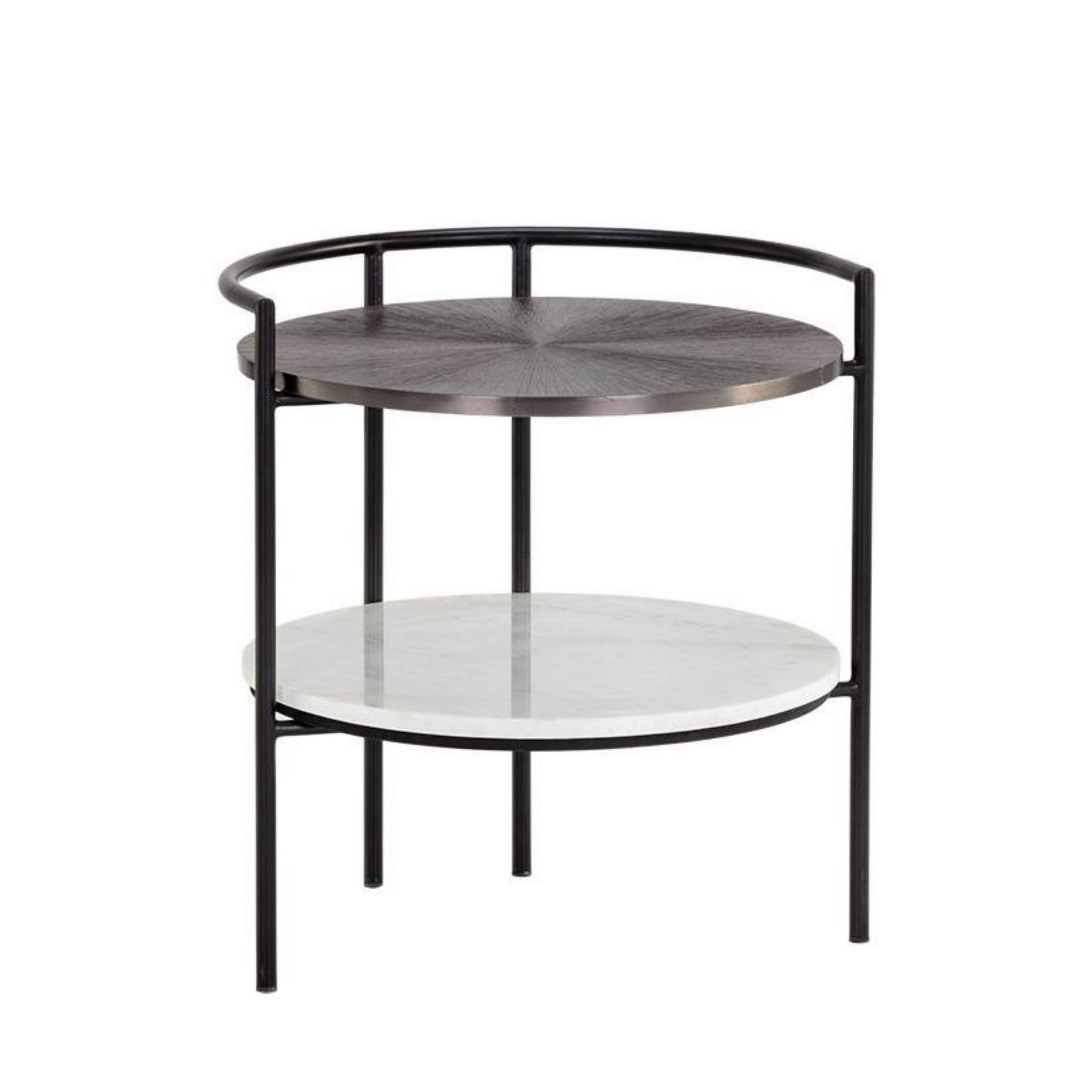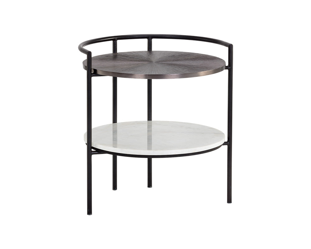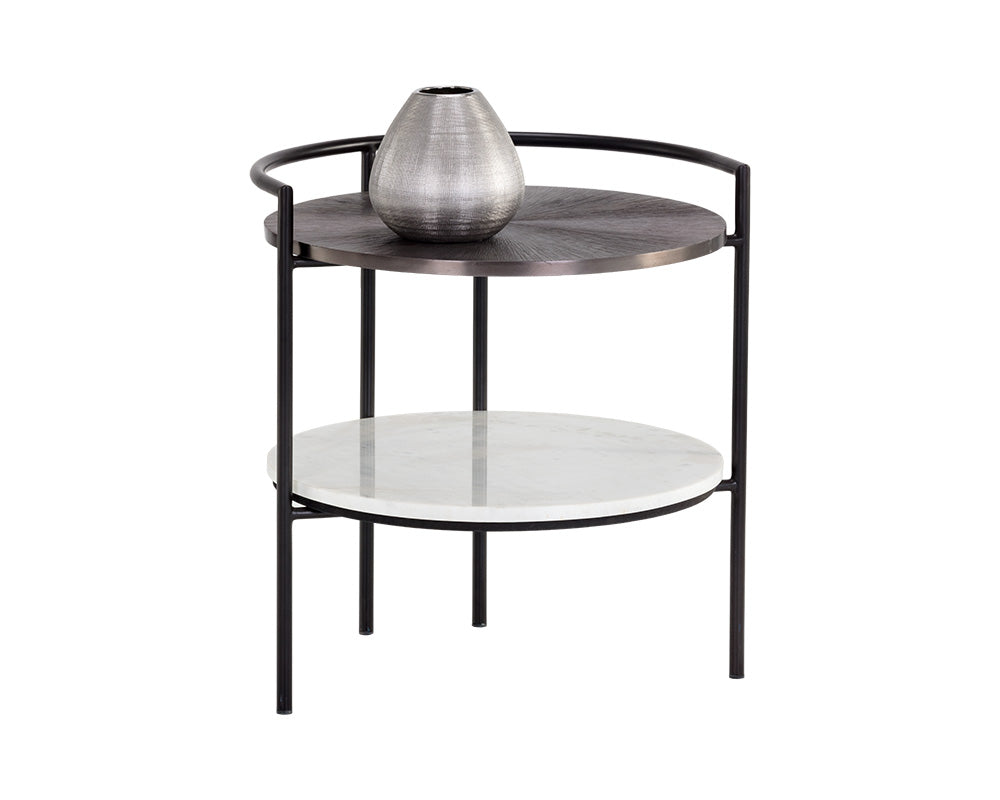 The TORIN nightstand builds a story around elemental bursts of marble and iron. Three tiers of white marble are joined together by a sturdy semi-gloss iron frame to create something that is as functional as it is elegant. This versatile nightstand keeps things neat and organized in the bedroom but would look great in any room setting.