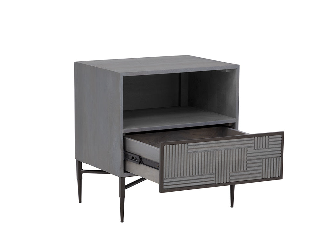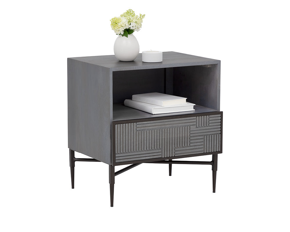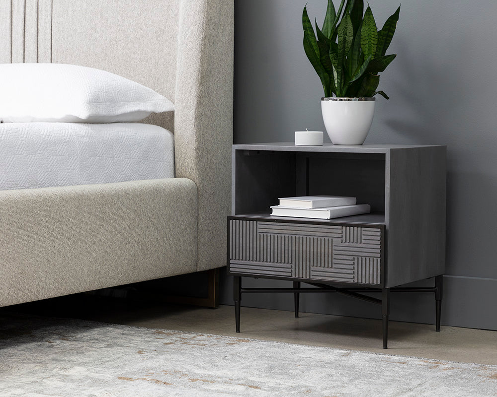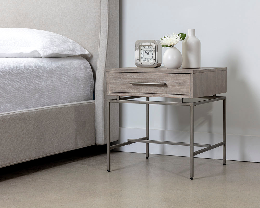 A contemporary nightstand designed to add a beautiful touch to the bedroom. Crafted from taupe oak veneer with a soft closing drawer and shelf for added storage. Black iron hardware completes the look. Also available in a charcoal grey oak veneer with a matte black frame.