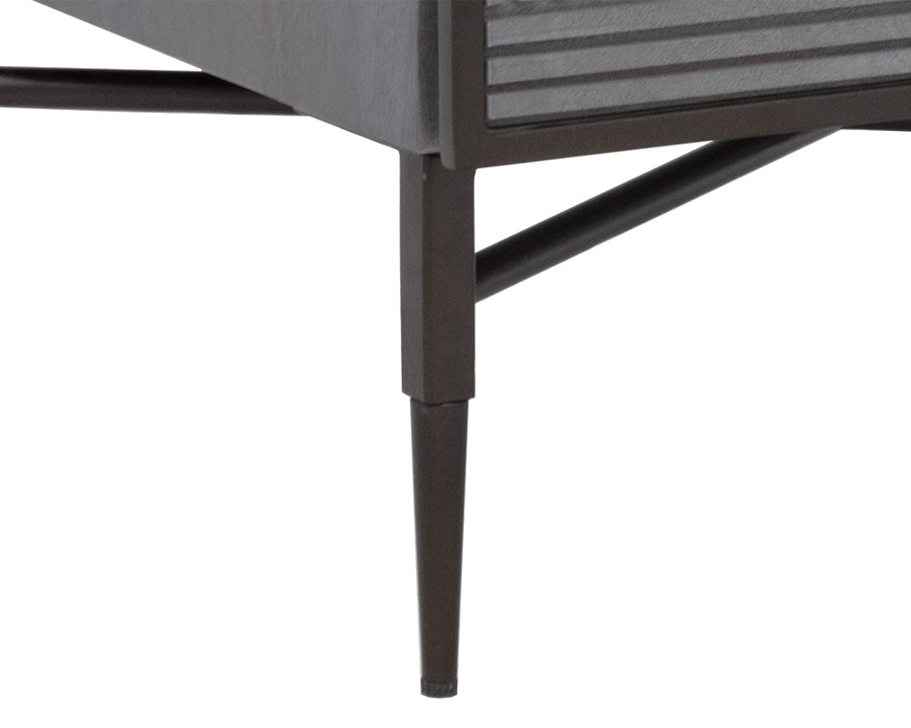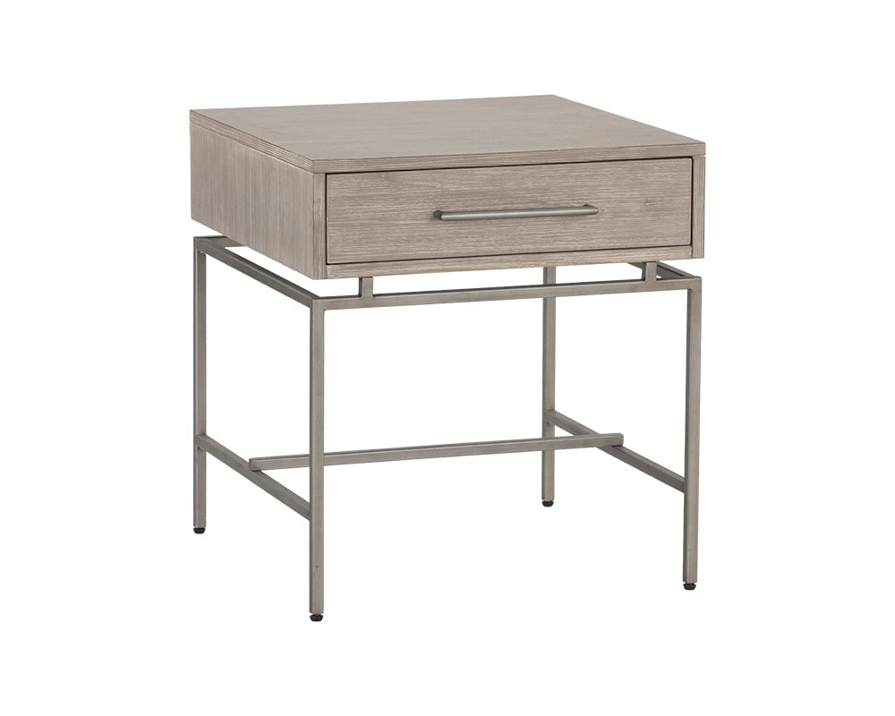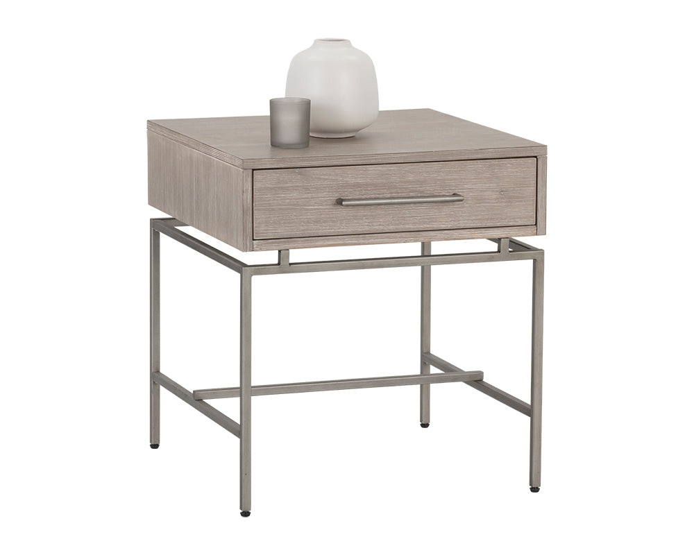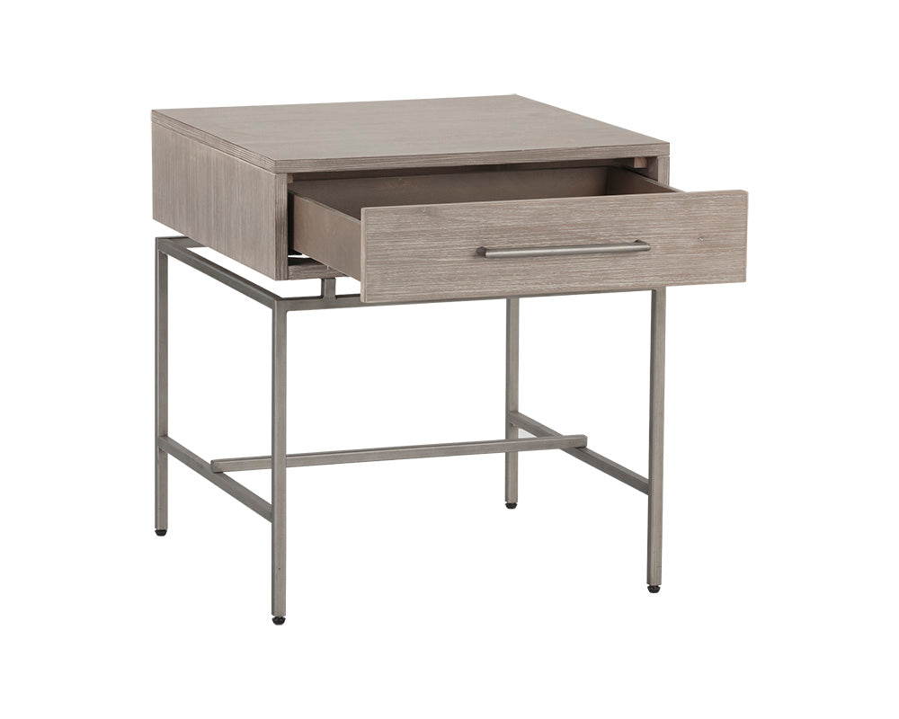 A contemporary nightstand designed to add a beautiful touch to the bedroom. Crafted from taupe oak veneer with a soft closing drawer and shelf for added storage. Black iron hardware completes the look. Also available in a charcoal grey oak veneer with a matte black frame.