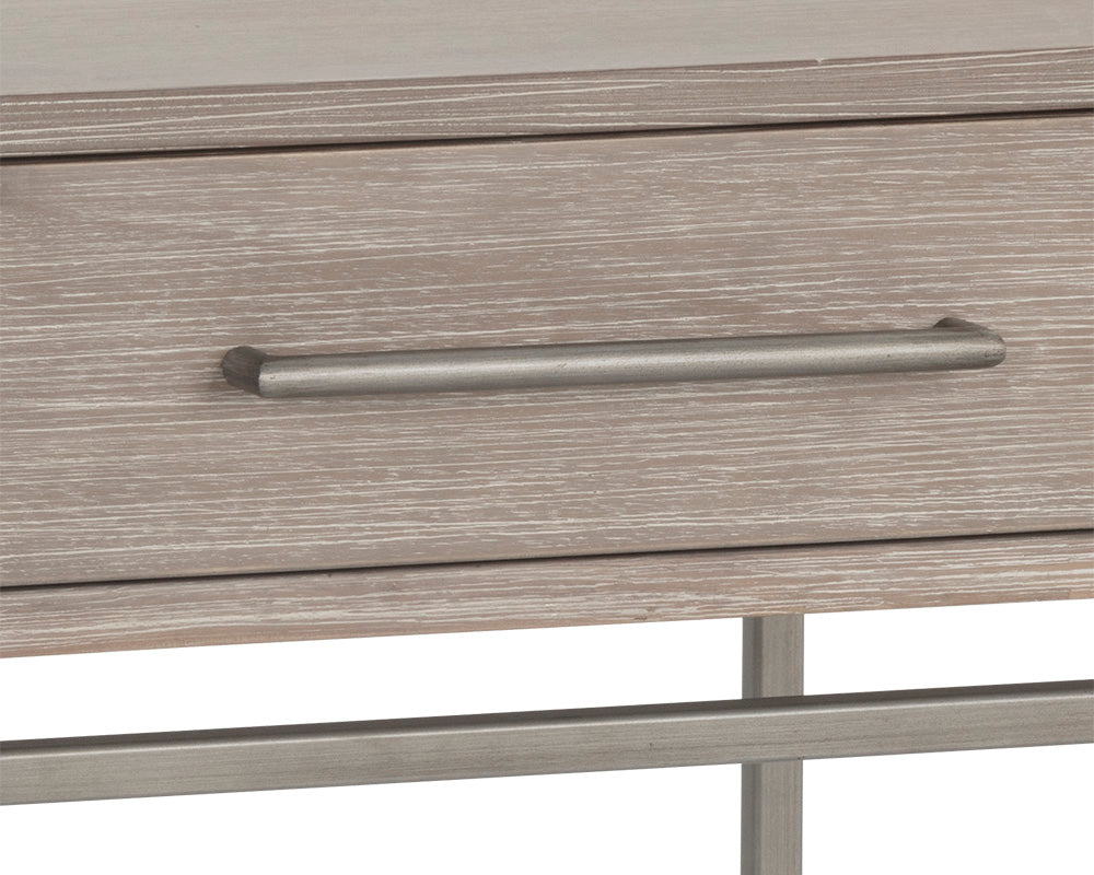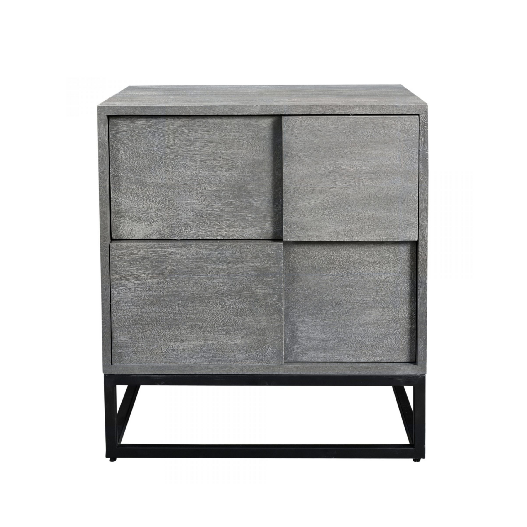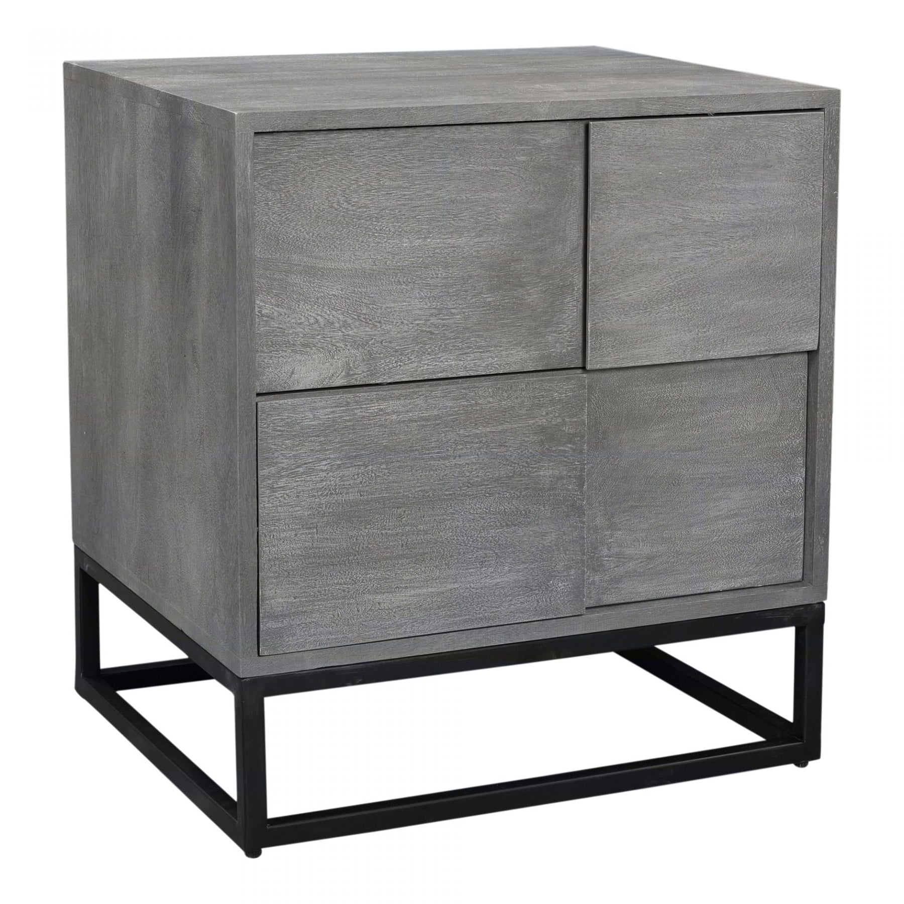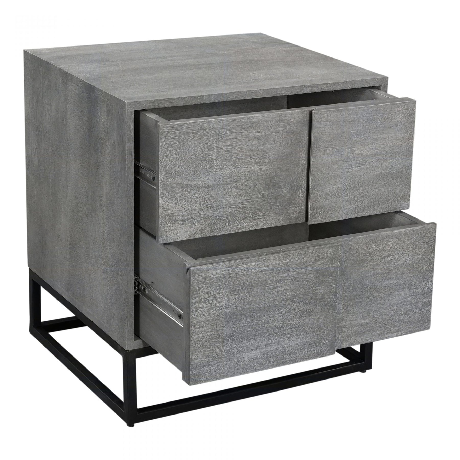This handcrafted nightstand will add a unique design to any bedroom. Made from ash grey wood veneer with two soft closing drawers. Antique silver hardware completes the look. Suitable for residential and contract settings.