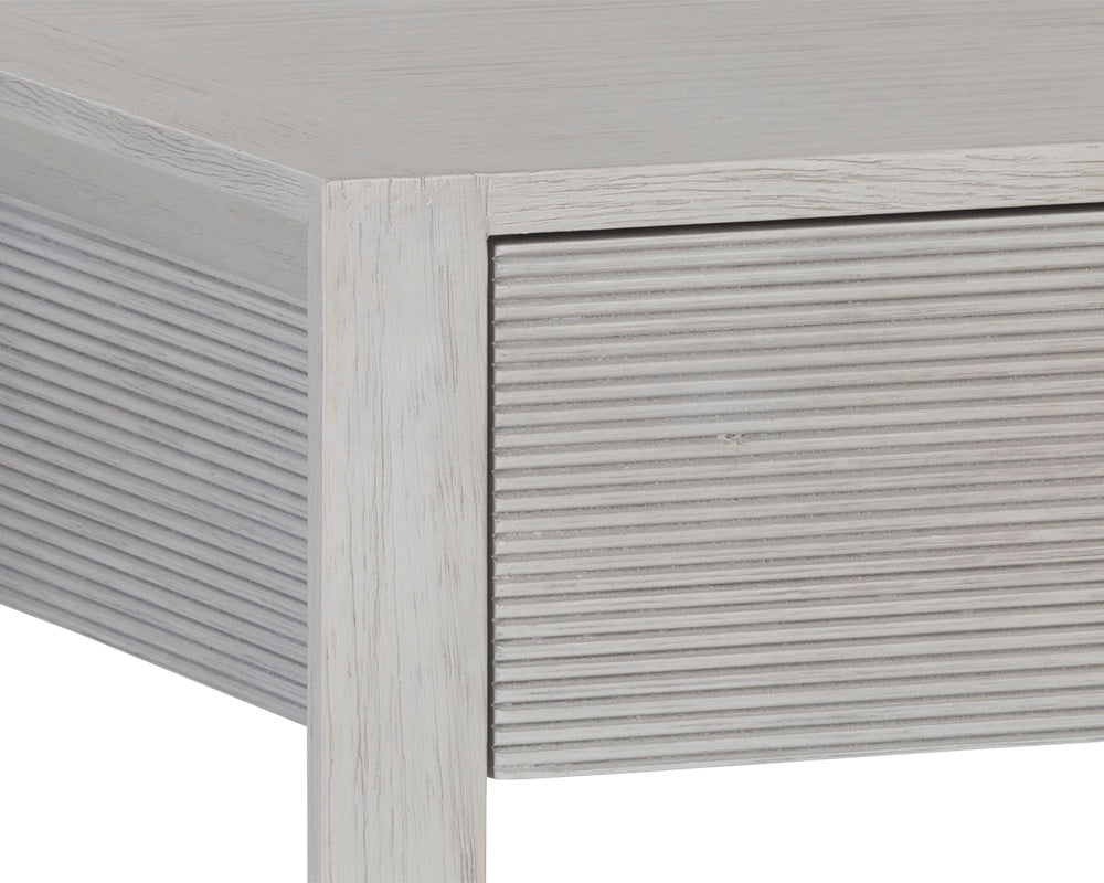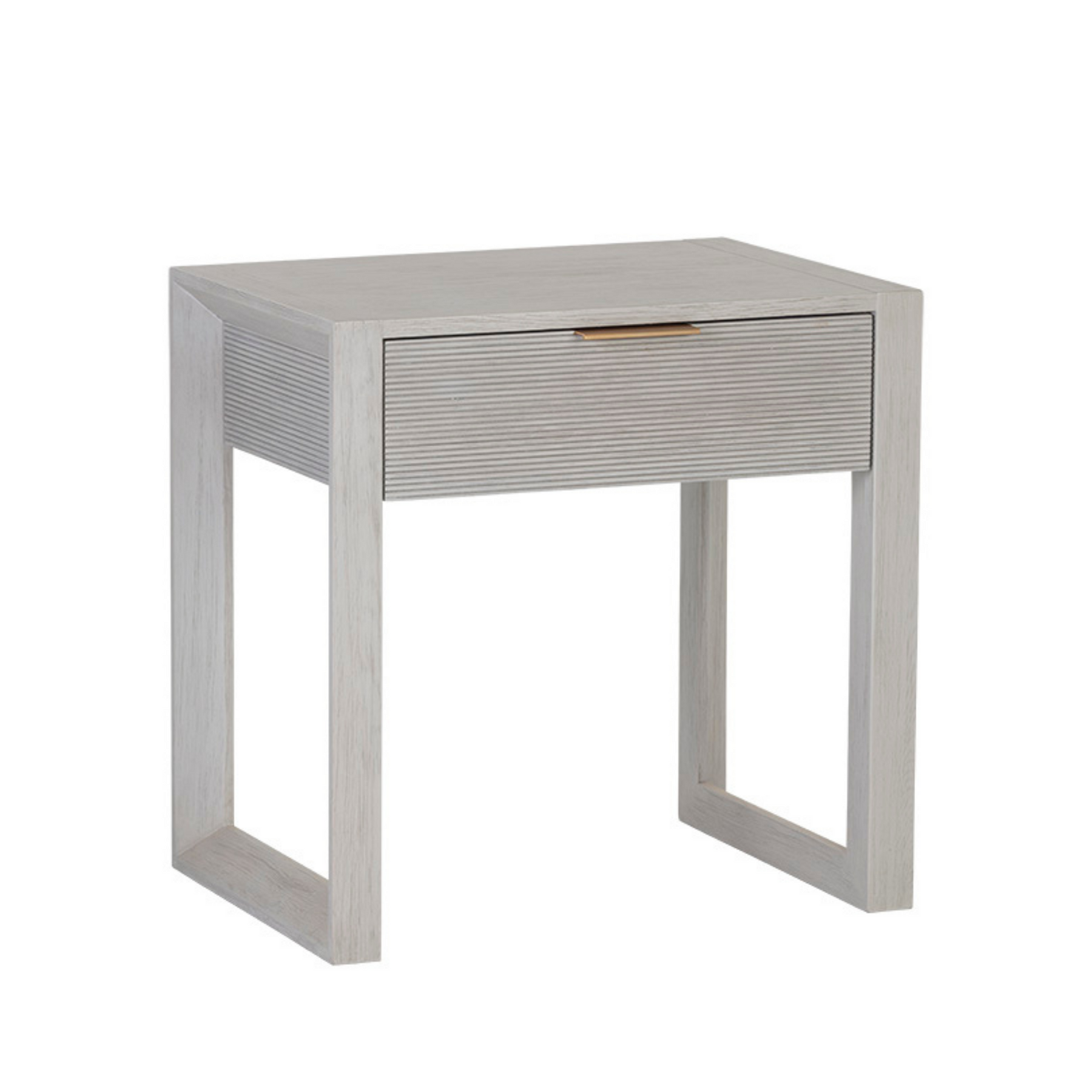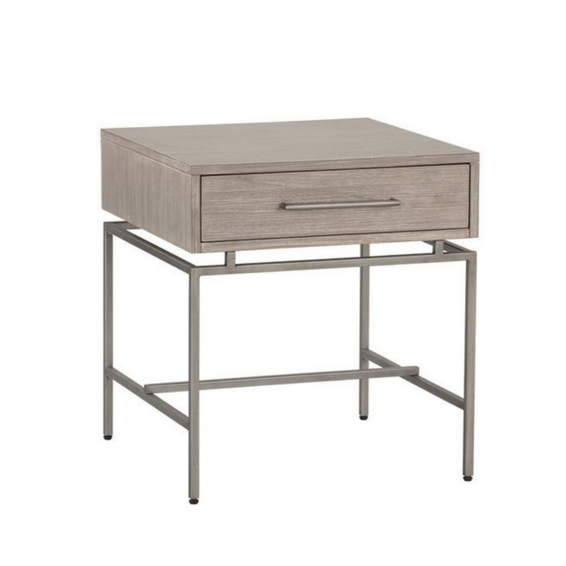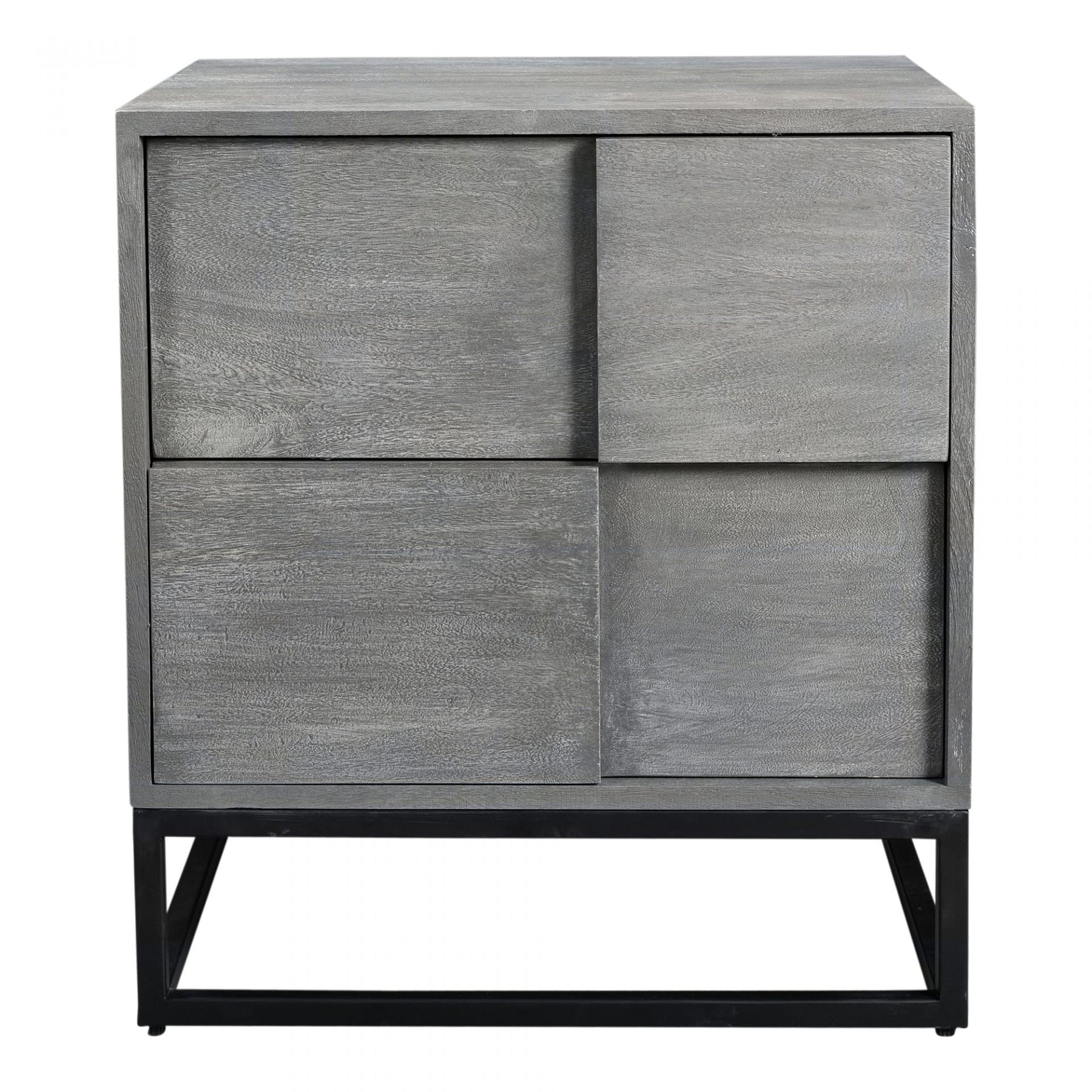 This handcrafted nightstand will add a unique design to any bedroom. Made from ash grey wood veneer with two soft closing drawers. Antique silver hardware completes the look. Suitable for residential and contract settings.