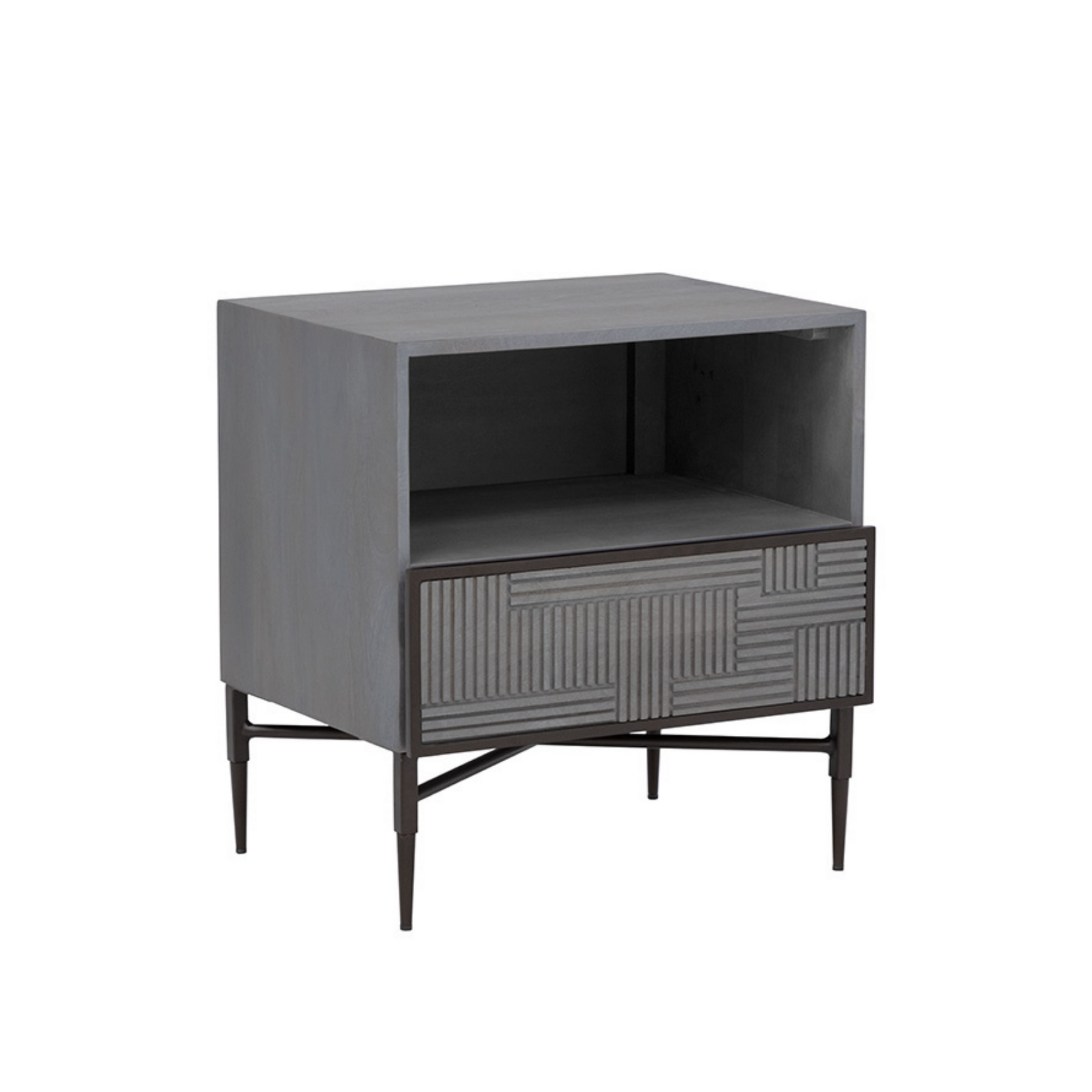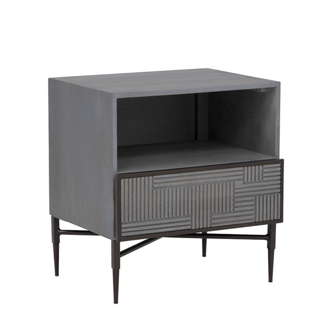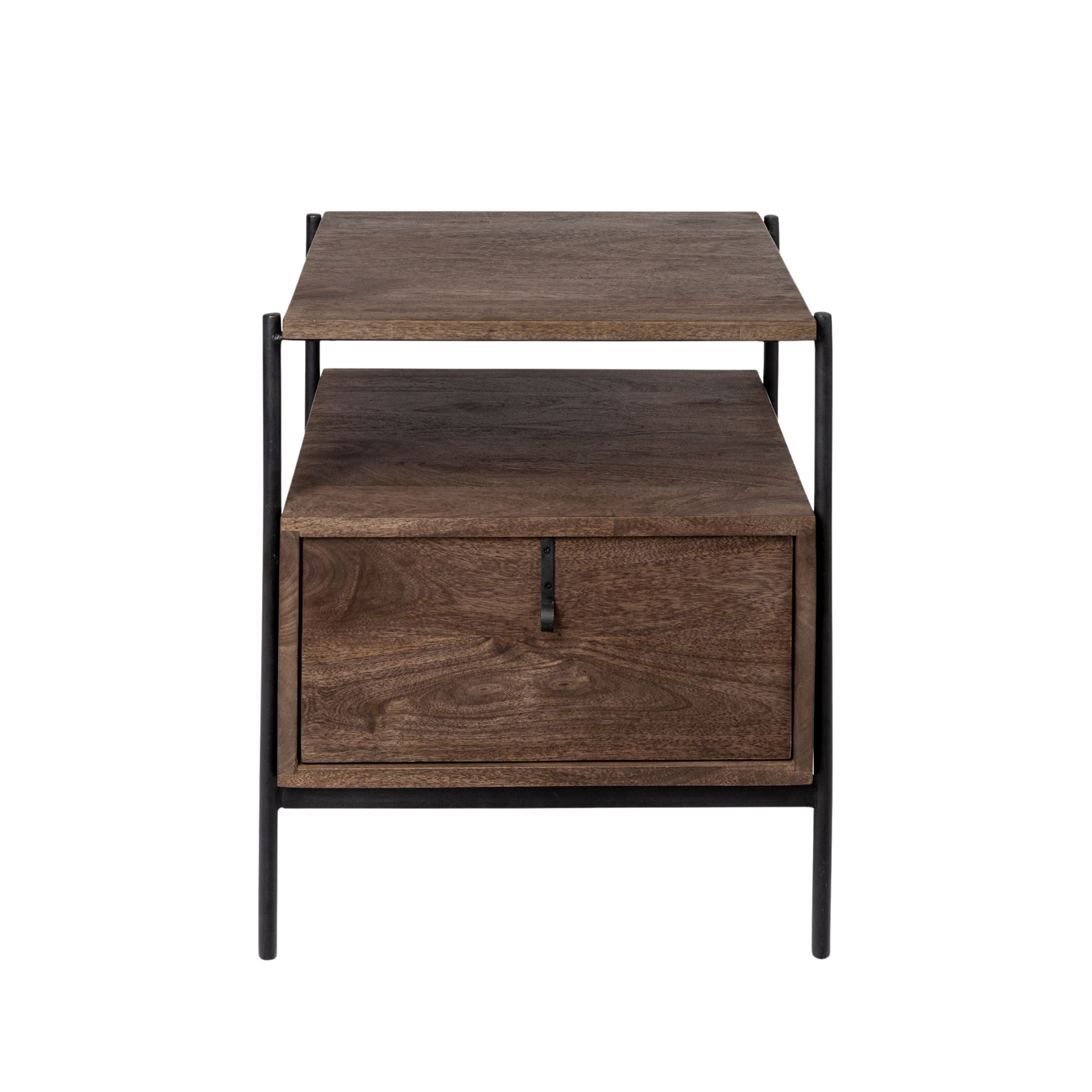The JESSAMY nightstand is constructed with solid acacia wood on an angular, steel legs to achieve that rustic, industrial look. It features a single drawer with two open spaces for your bedside needs.