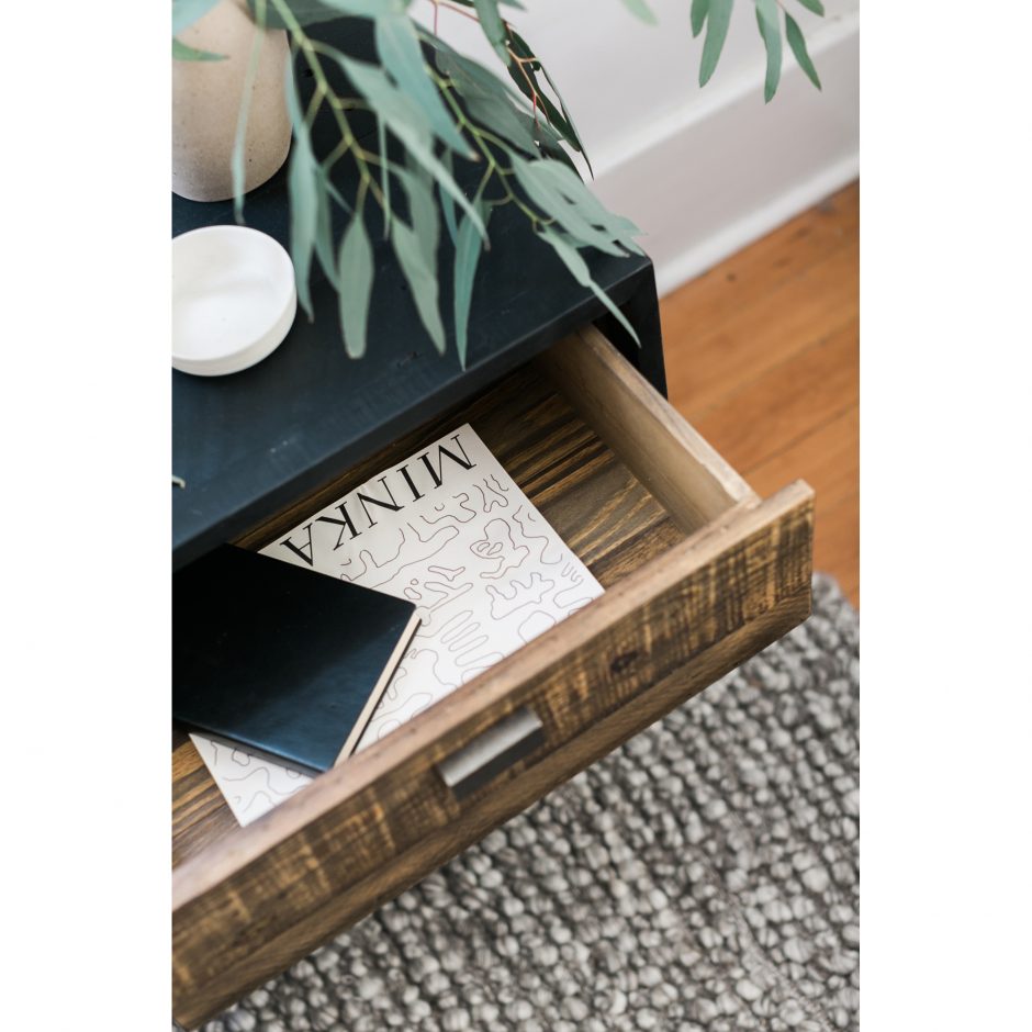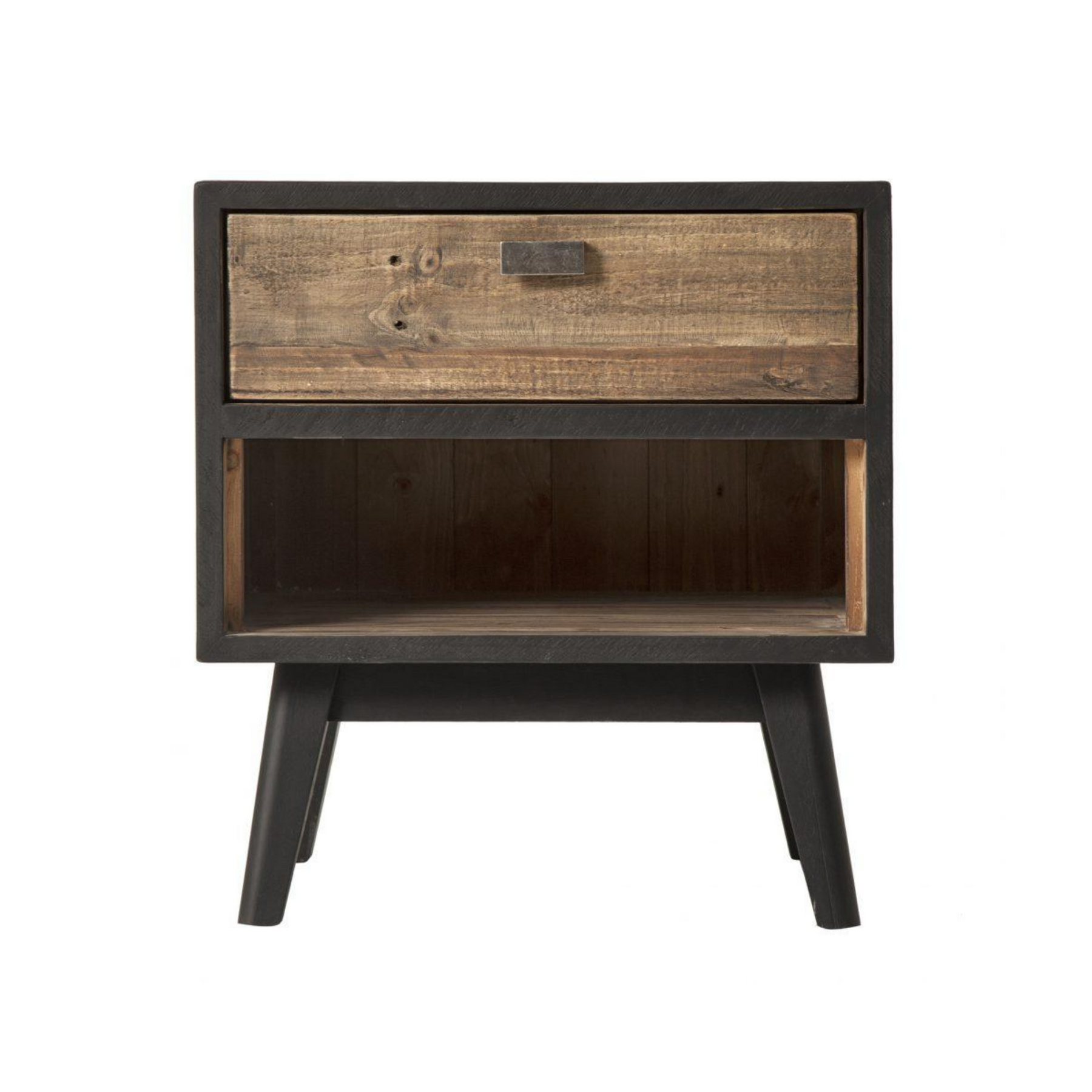 A new look in a rustic nightstand, the MARI features an attractive two-tone, black and natural finish. Made with solid, reclaimed pine, the nightstand features one drawer and one open space for a combination of open and hidden storage options. Sustainable and built to last.