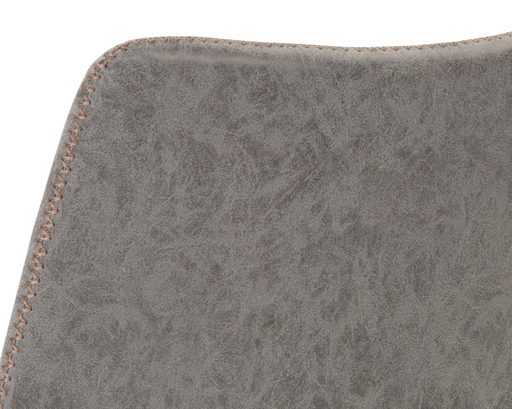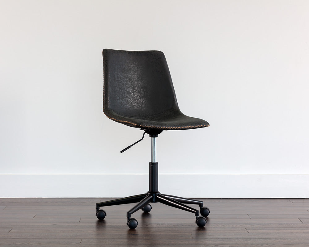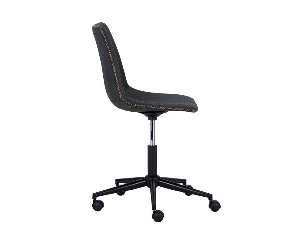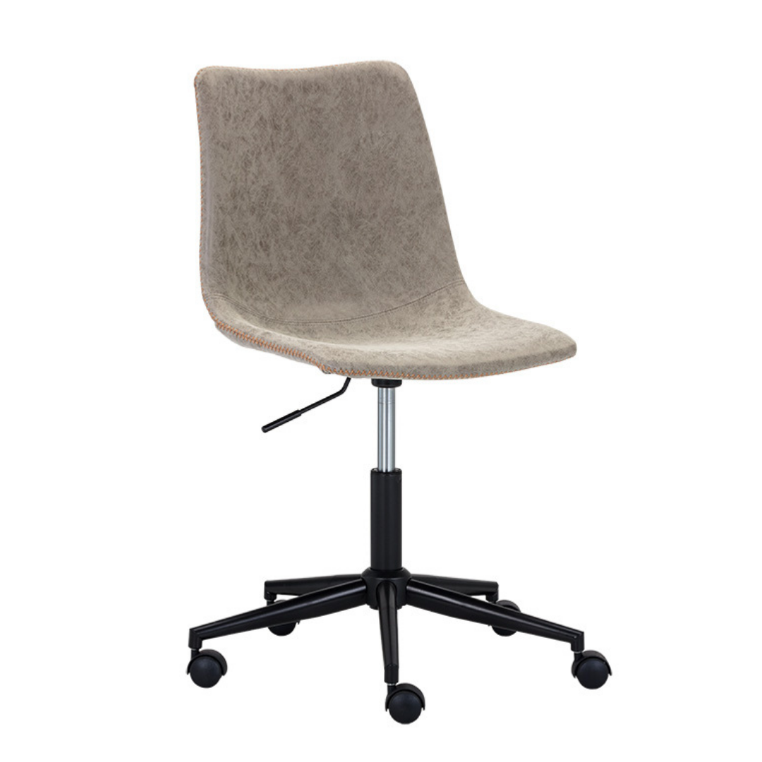 A comfortable and compact office chair. Designed with a simple, mid-century silhouette. Features an adjustable seat and castors for mobility. Stocked in antique black, brown and grey vegan leather. Handle With Care: This design has been crafted with vegan leather. Vegan leather is manufactured to reflect the natural characteristics of leather; as such, colour variations, markings wrinkles, grooves, and light scratches are appreciated characteristics. No two pieces will be alike.