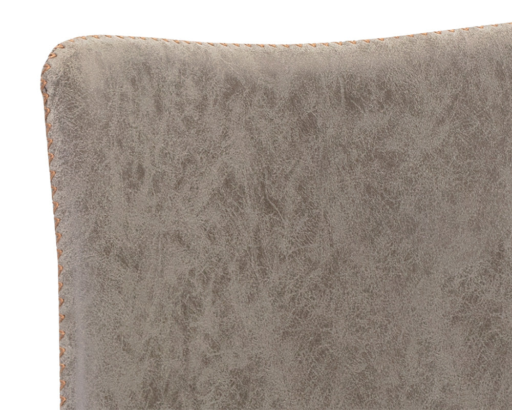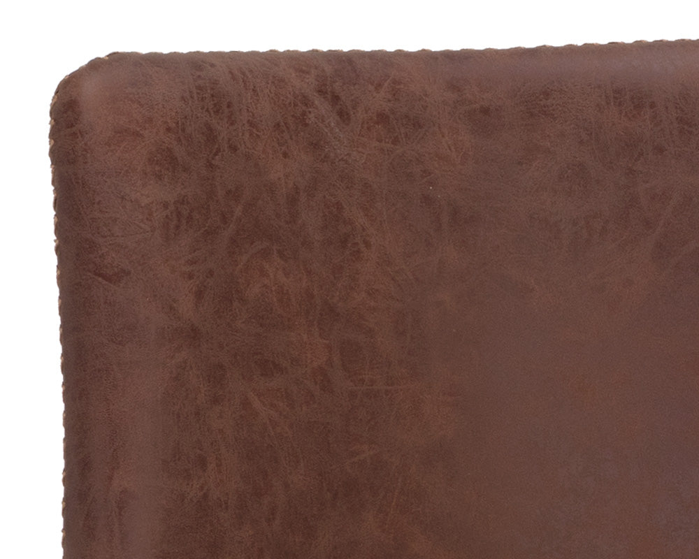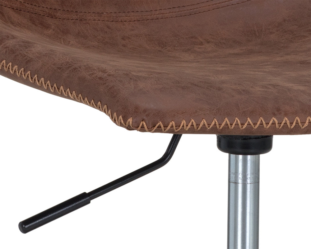 The armless DAVIA office chair was inspired by Scandinavian style with an industrial flair. Stocked in rust tan and onyx vegan leather and finished with an exposed brushed steel frame. Castors allow for easy mobility. Also available in castillo cream vegan leather and champagne gold legs.