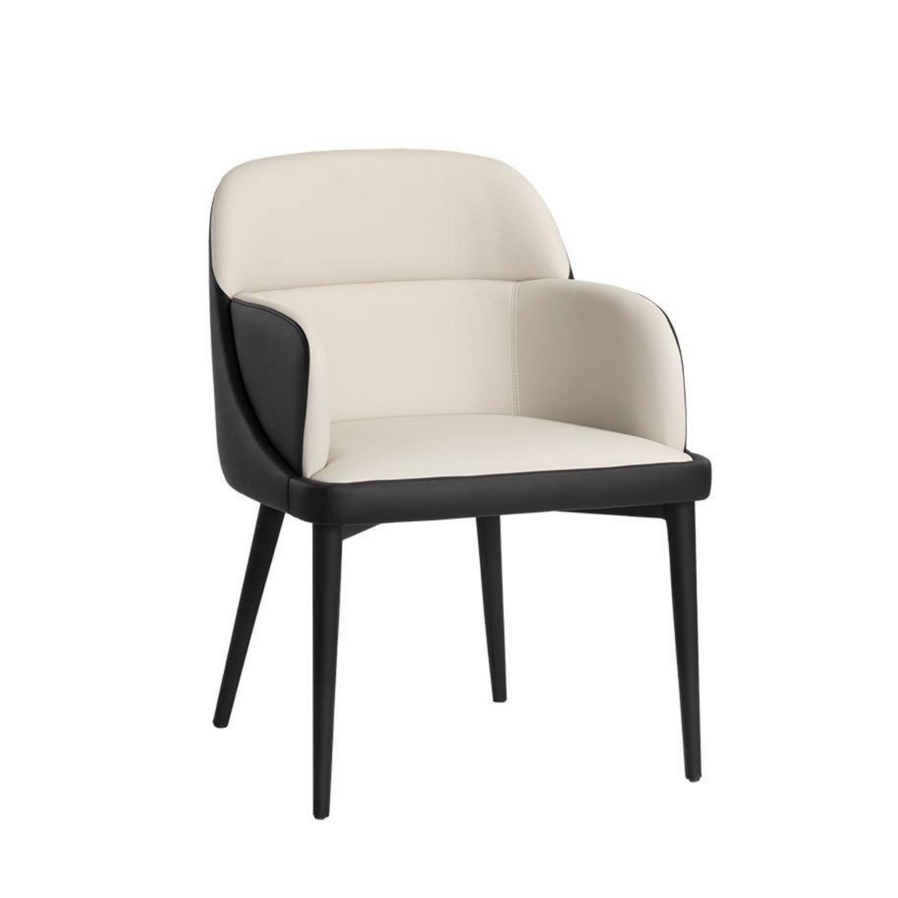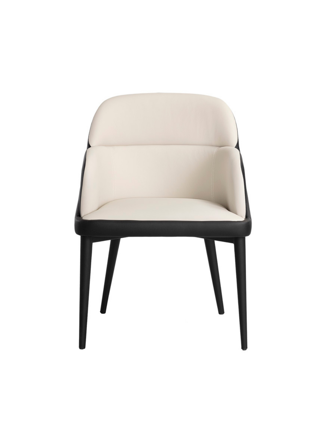 The futuristic, contemporary dining HADDON armchair features a modular inspired seat, upholstered in contrasting dillon cream and dillon black vegan leather and dillon steel and dillon williamsburg vegan leather.