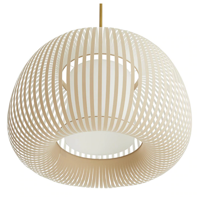 Like a magnetic field surrounding the central lantern, almost 100 strips of upholstered banding are made to create each of these pendants. The bands are made of a super pliable material and simple beige cotton, the lantern from white cotton and the fixture suspends from a stainless steel stem finished in a warm antique brass. The filtered light comes from a single bulb, casting a wonderful glow and soft, linear shadows.
