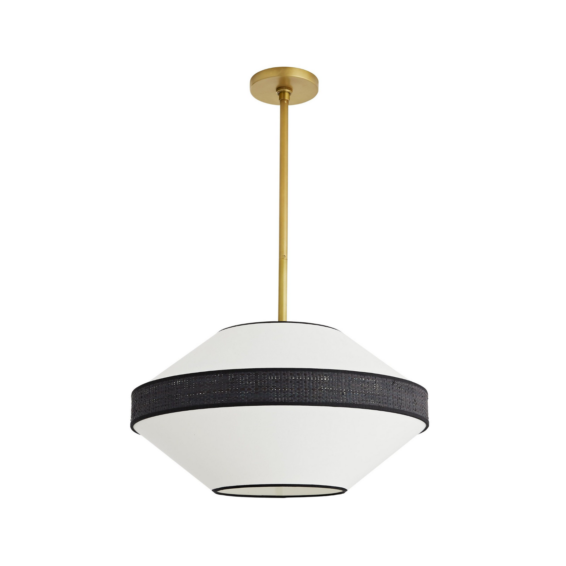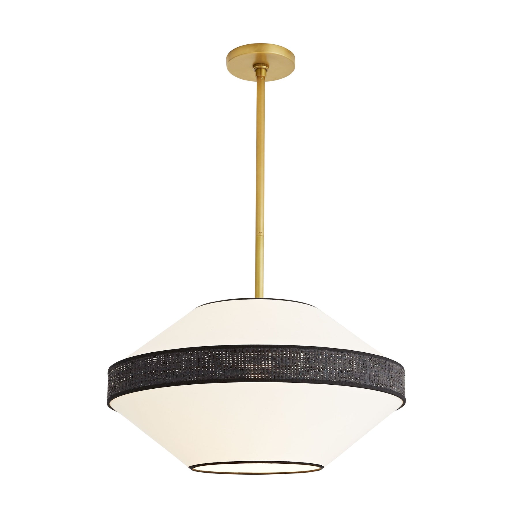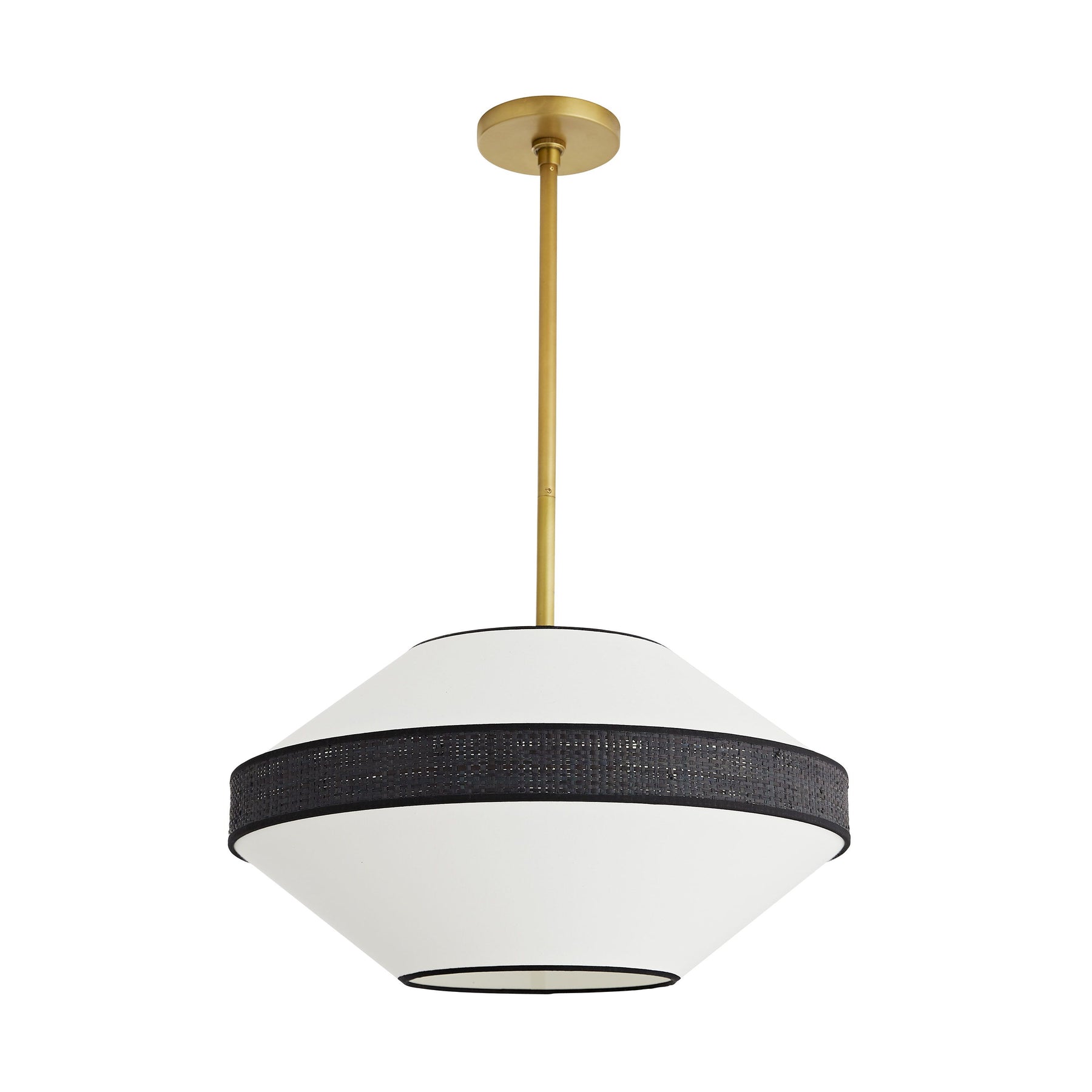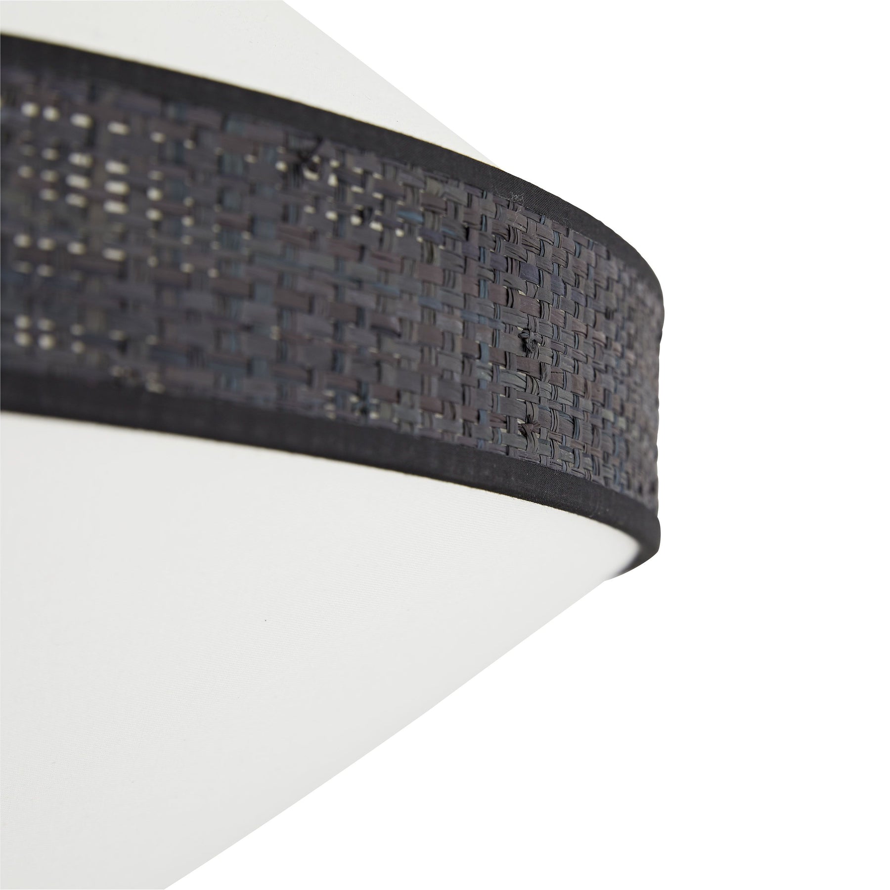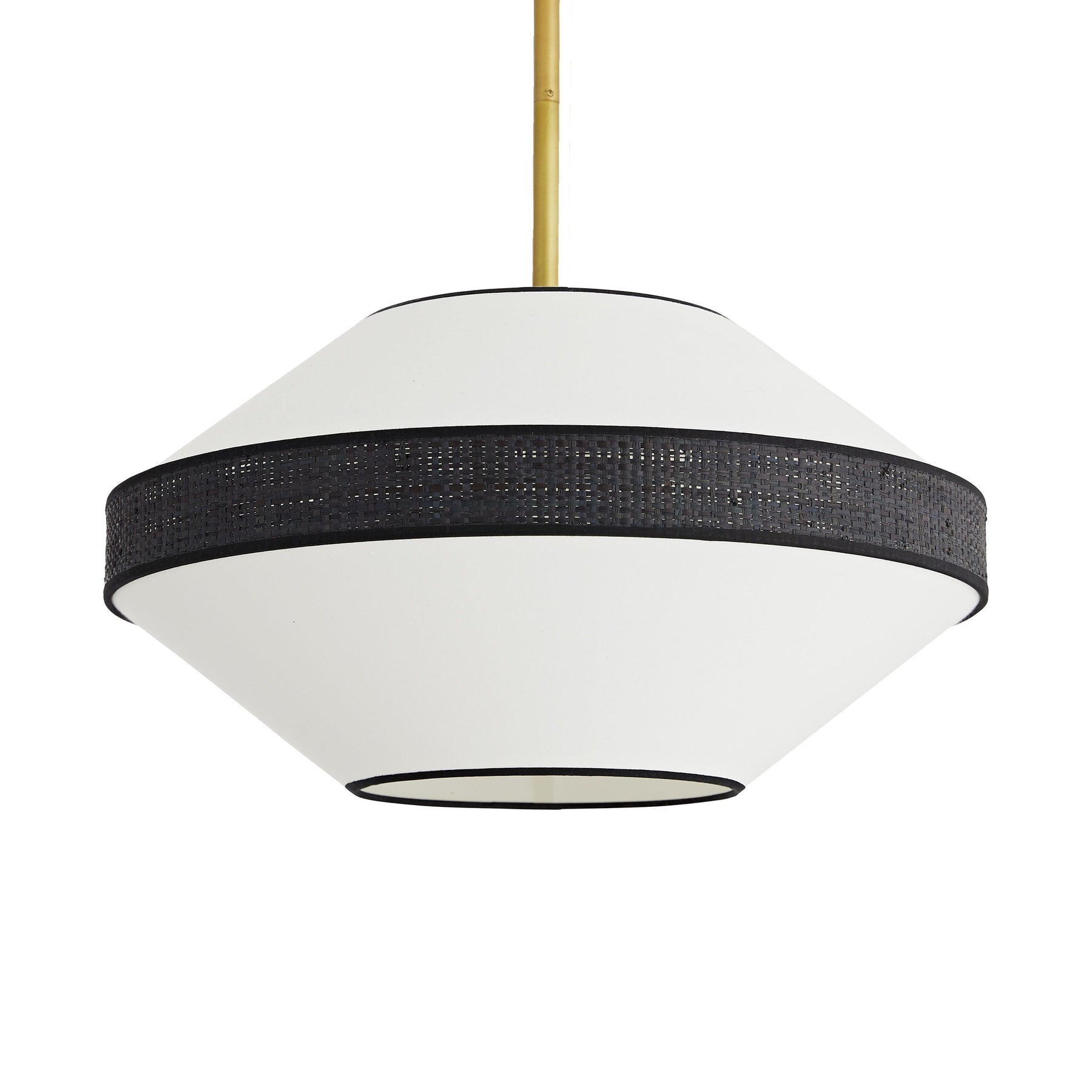 Distinct in design and sui generis in style this disk-shaped pendant delivers style and substance while working to illuminate its surroundings. Its foundation is crafted from microfiber in an ivory finish which is broken up by a woven seagrass band that has been stained in black—a sublime contrast of materials and textures. The woven band allows light to brilliantly peek through the negative space while the shade helps diffuse it.