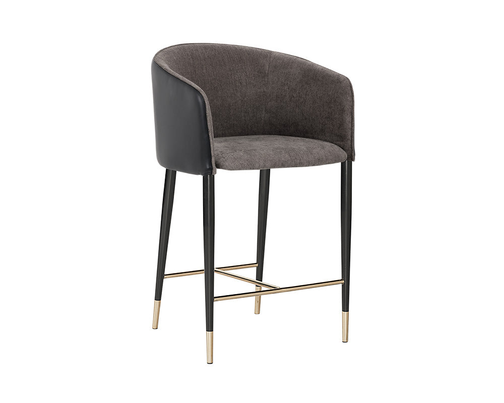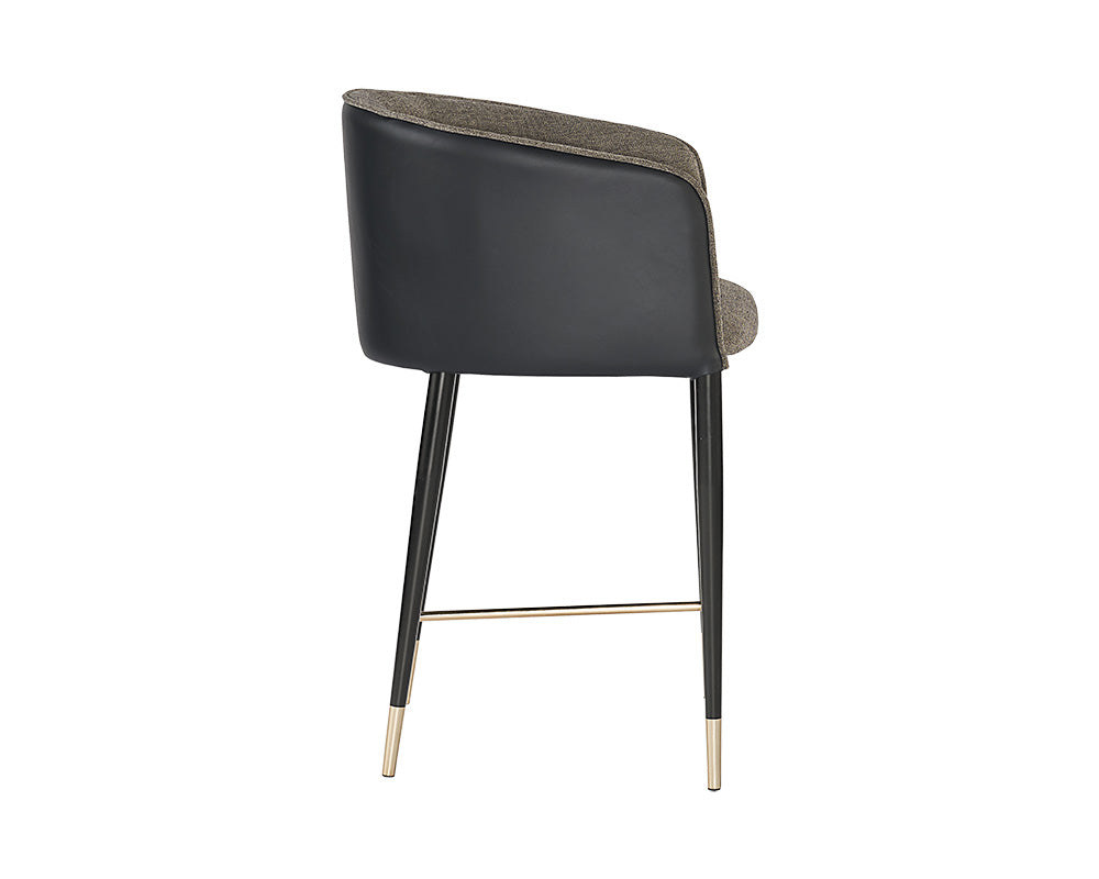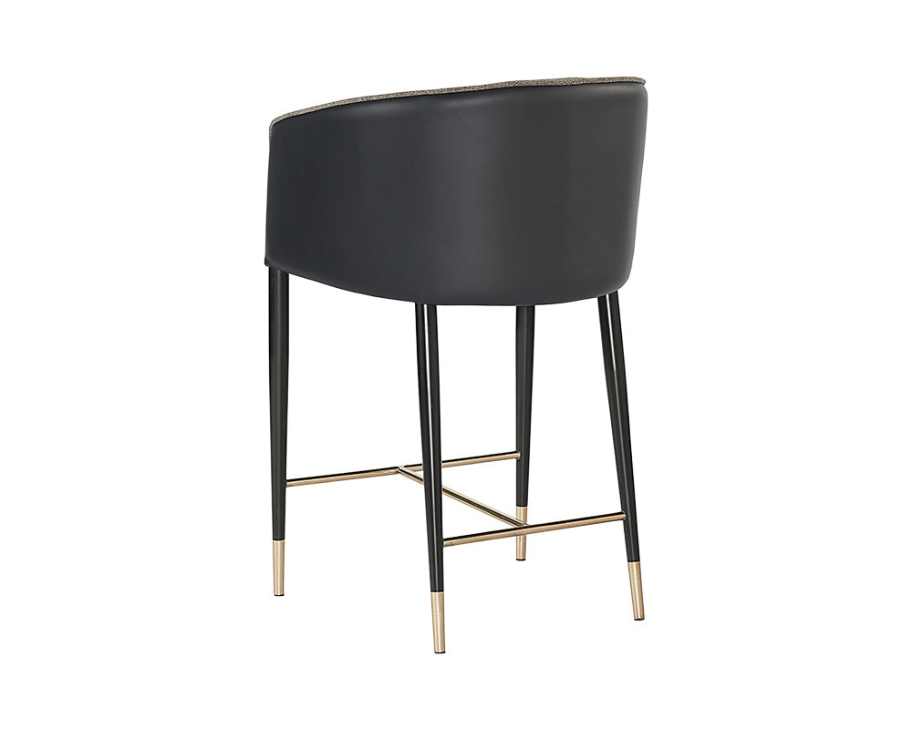 A modern barrel back counter stool upholstered in vegan leather. Finished with black steel legs and brushed gold foot caps. Suitable for various dining, kitchen and bar spaces of all sizes. Handle With Care: This design has been crafted with vegan leather. Vegan leather is manufactured to reflect the natural characteristics of leather; as such, colour variations, markings wrinkles, grooves, and light scratches are appreciated characteristics. No two pieces will be alike.