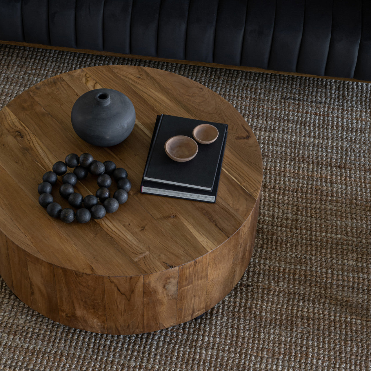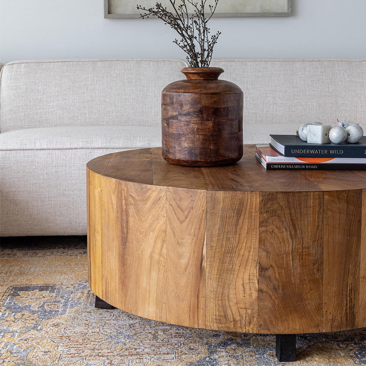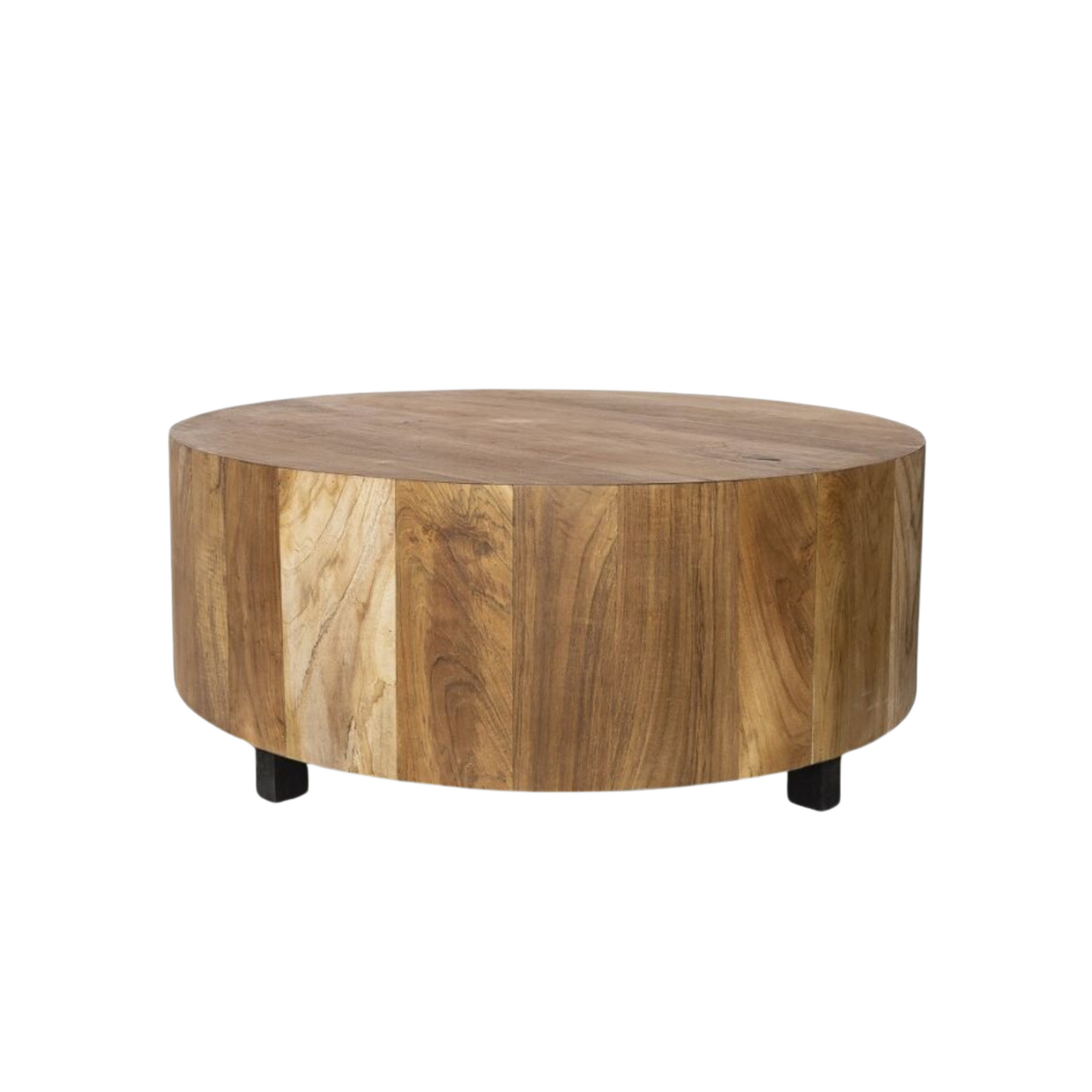 This eye-catching 39-inch table is meticulously handcrafted from solid reclaimed teak, showcasing the beauty and uniqueness of its materials. Its design features sleek, inset black wood legs that provide a modern contrast, elevating the table into a striking centerpiece for any room.