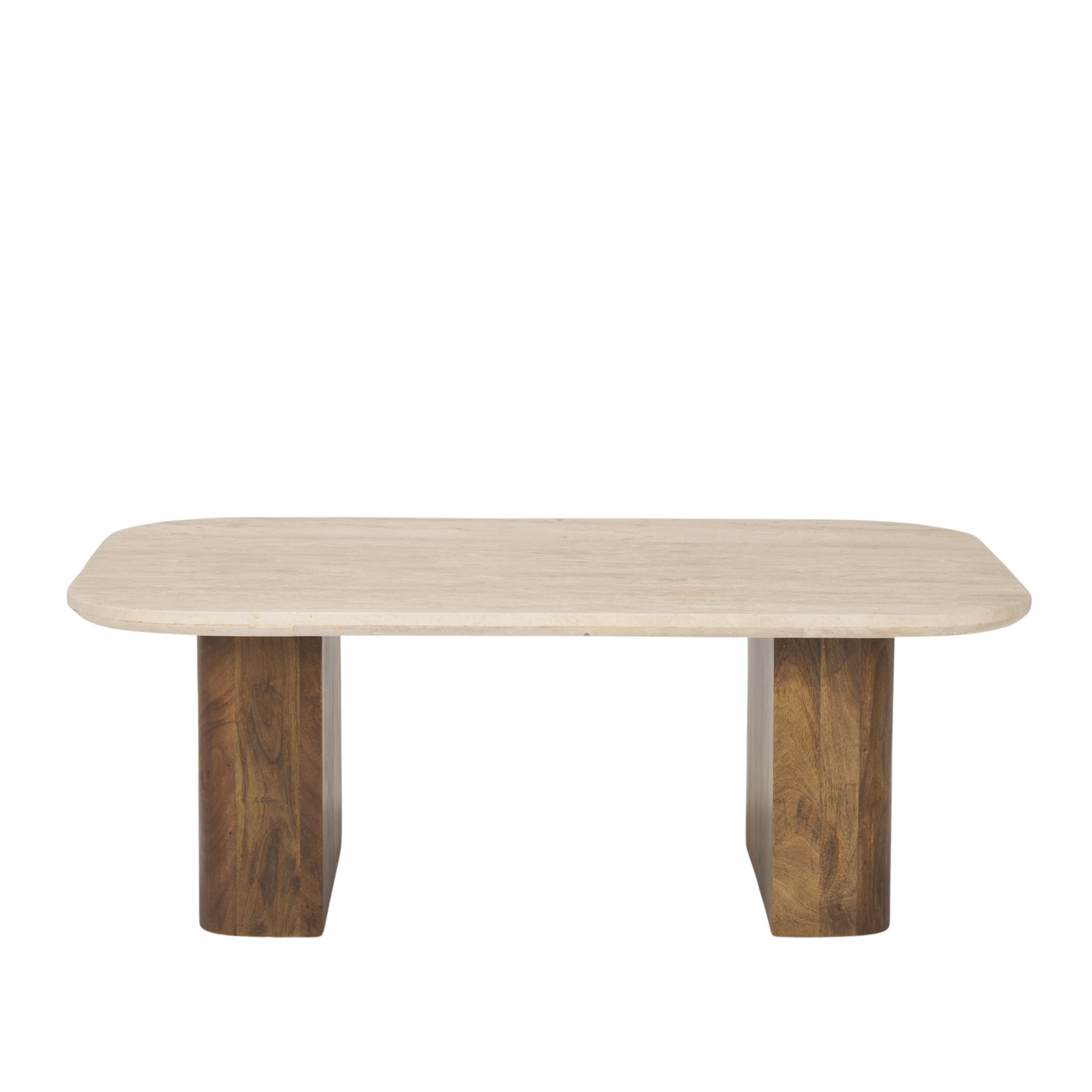 GEOVANA is an earthy rectangular travertine stone coffee table with rounded edges supported by two wide mango wood pedestal legs.