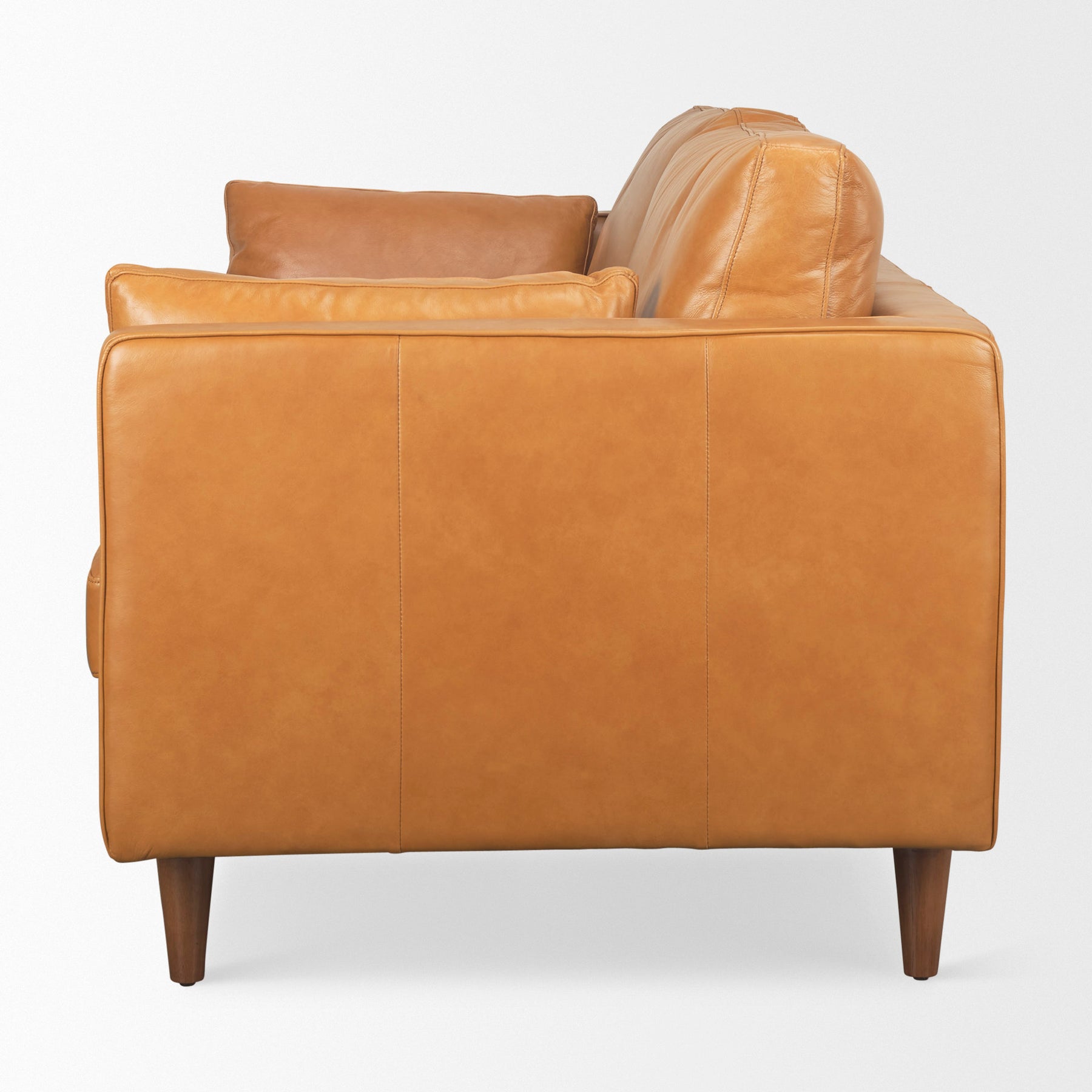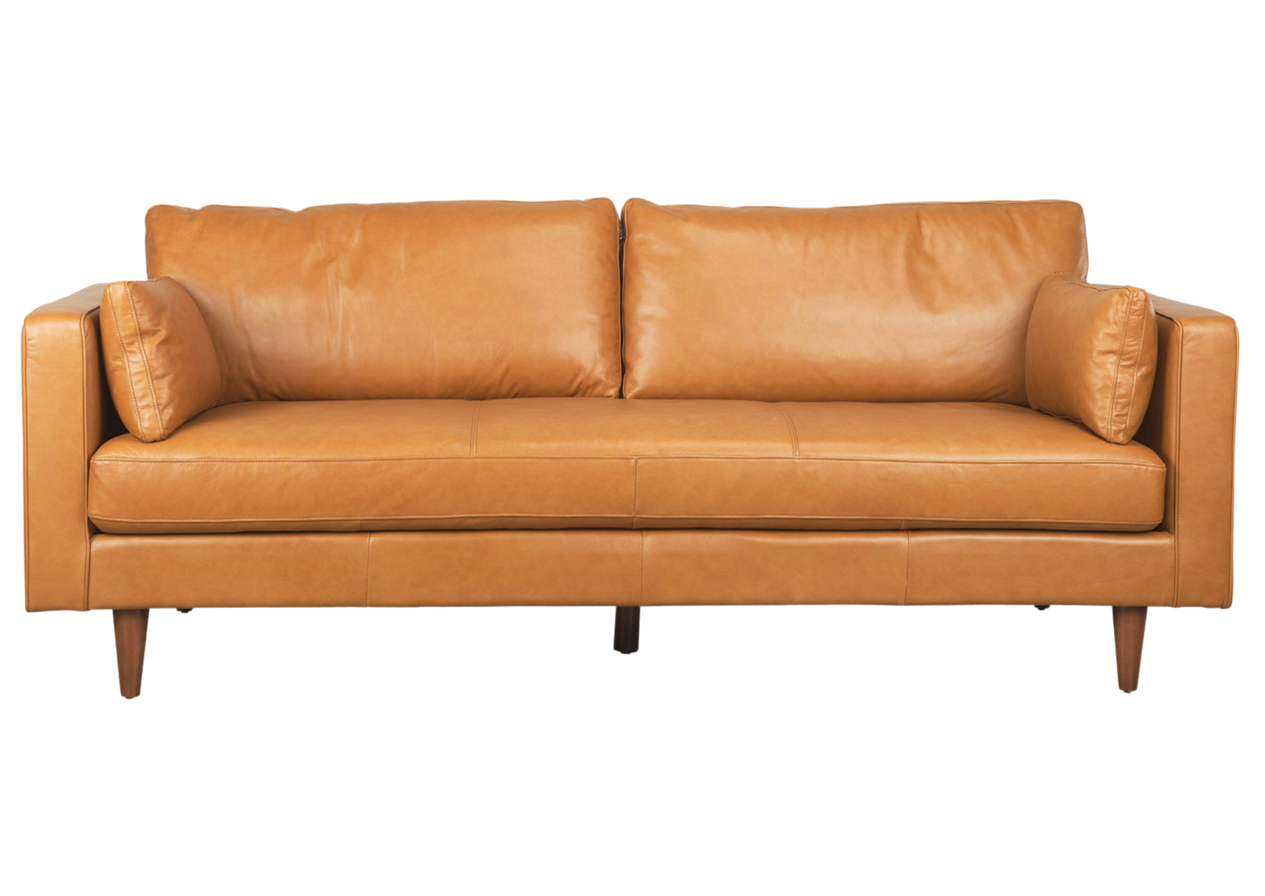 The JOHN sofa measures 87.8L x 37.8W x 34.6H. The JOHN sofa is constructed from high density foam, duck feathers, and full-aniline 100% top-grain leather. *Natural colour variations, and creases are part of the unique characteristics of this leather. It will develop a relaxed vintage look with regular use. This sofa is finished in a beautiful tan color.
