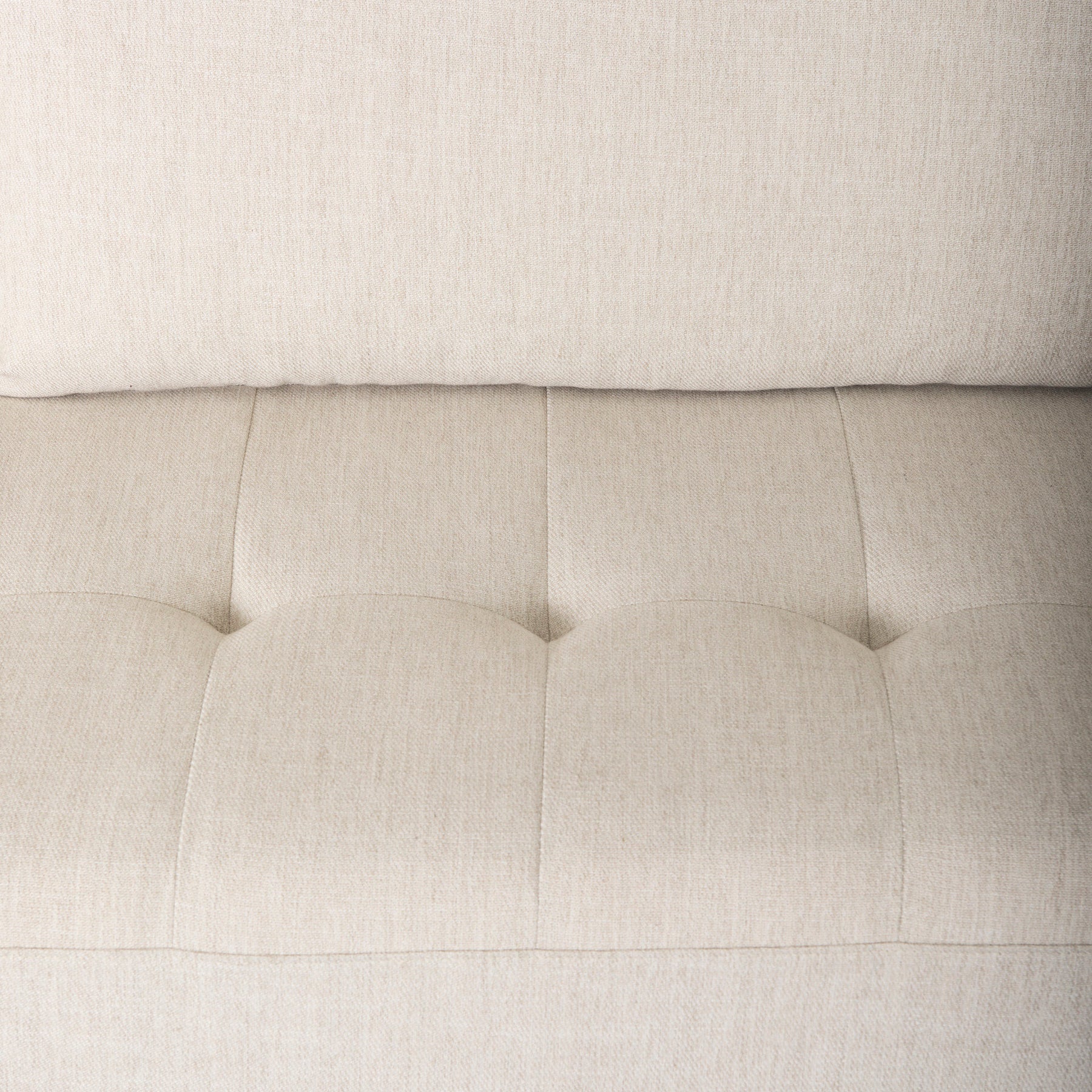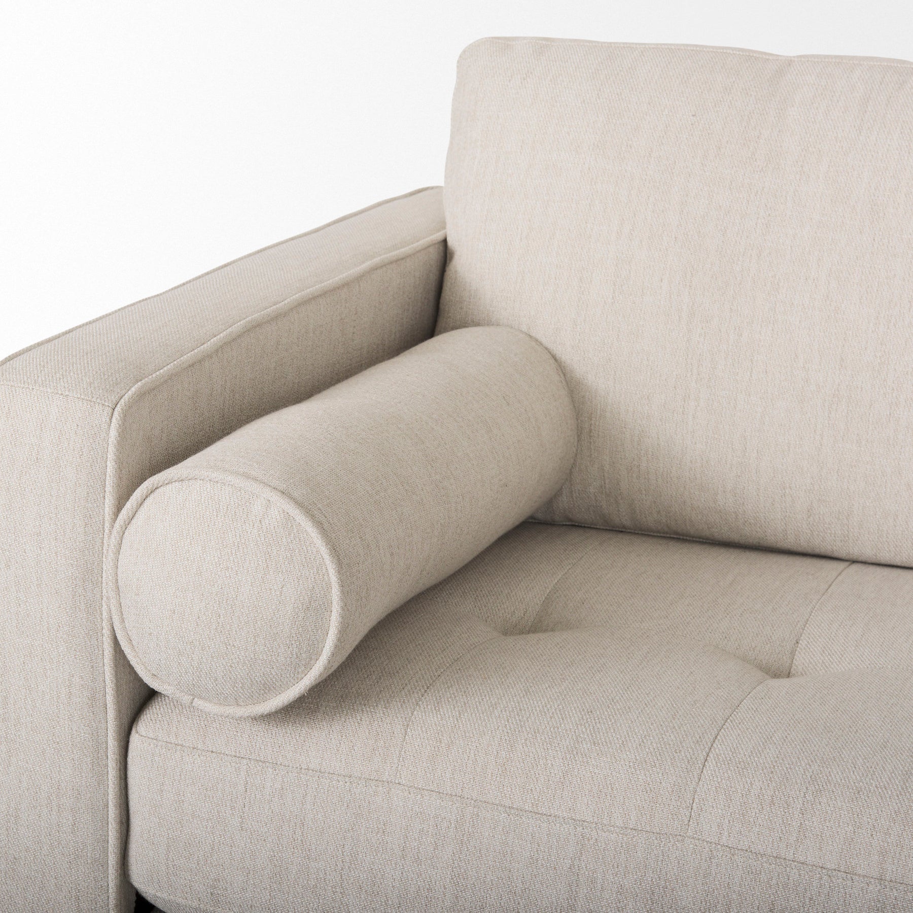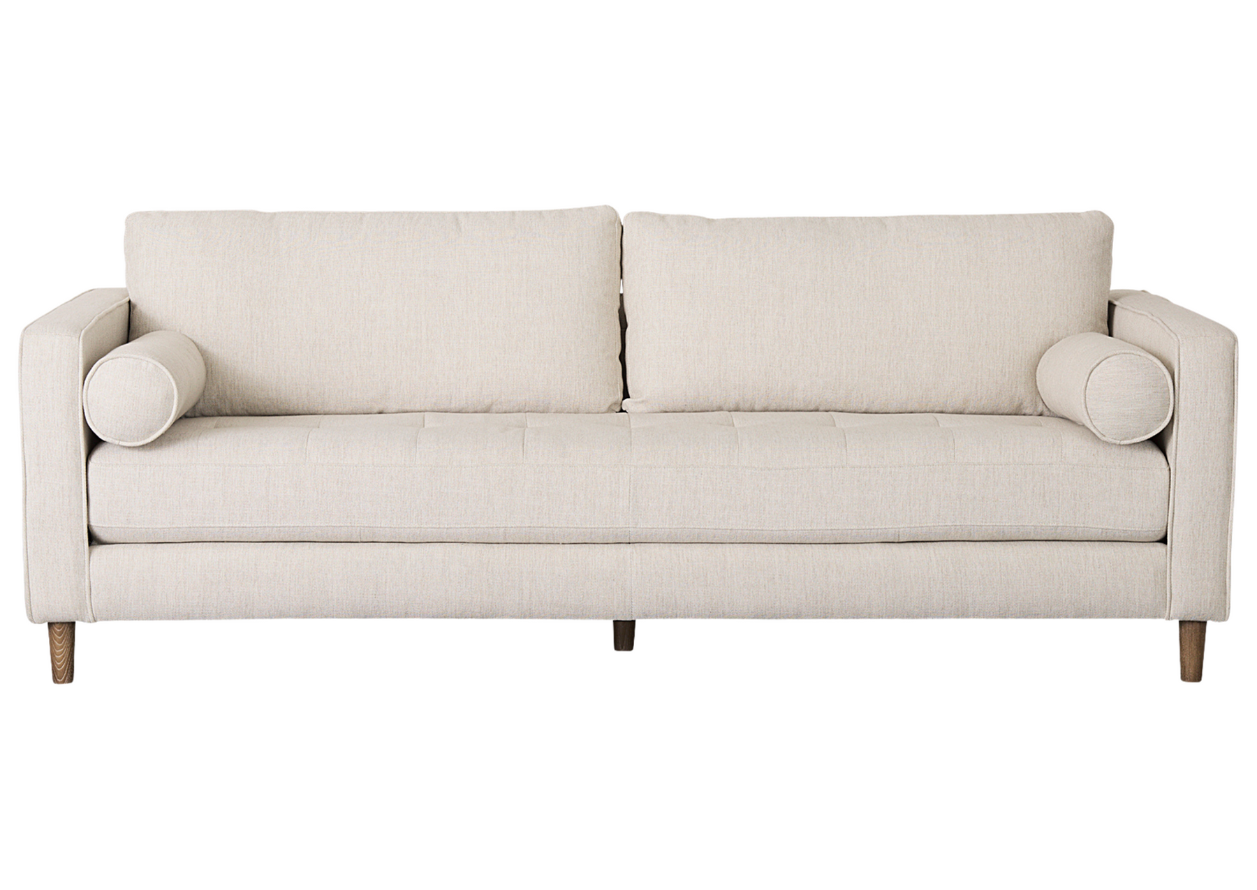 MARINA is a cream color fabric sofa with two matching bolster pillows. The MARINA sofa measures 88"L x 36.2"W x 33.9"H. MARINA is wrapped in cream color fabric, and offers unparalleled comfort and is guaranteed to have you lounging for hours. The sofa is finished in a cream color, with medium brown wooden legs, and two matching cream bolster pillows. The MARINA is braced by four solid wood legs that ensure exceptional stability and sturdiness. The MARINA looks gorgeous in any modern space and setting and is guaranteed to add a touch of luxury to your space without compromising on comfort.