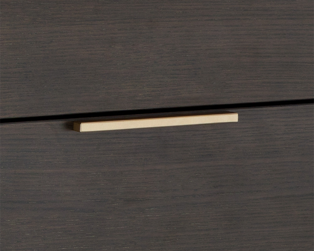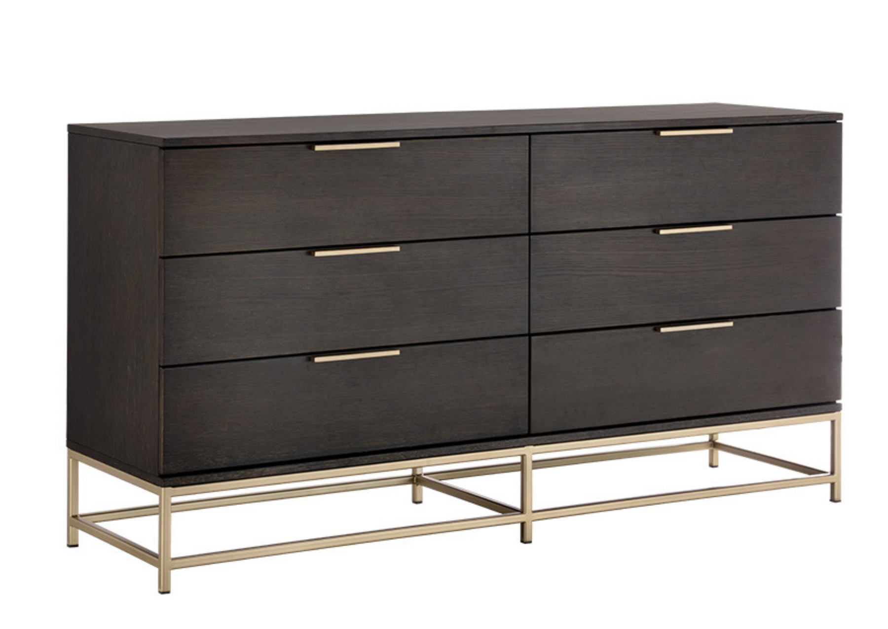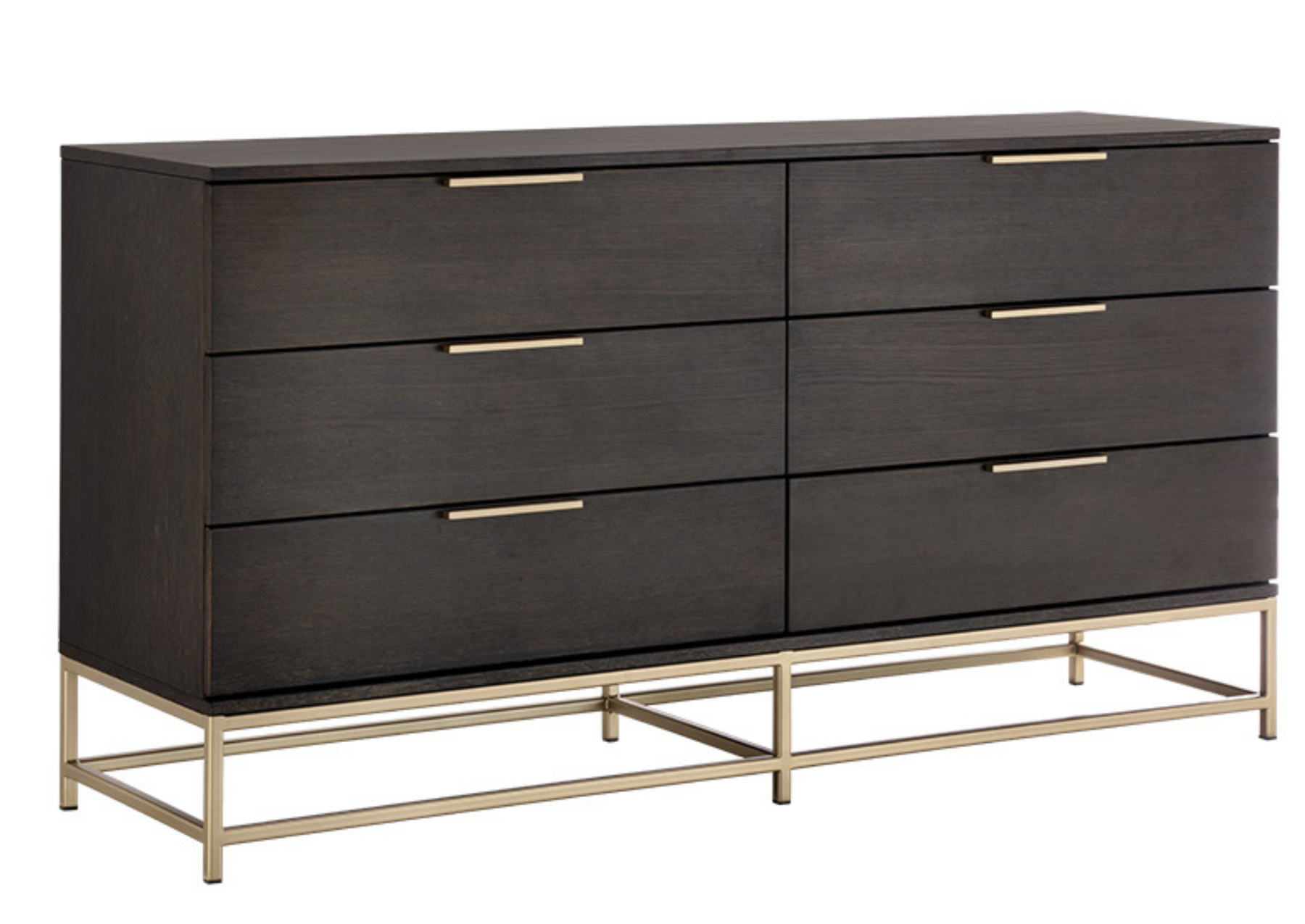 A modern dresser designed to add a beautiful touch to the bedroom. Crafted from charcoal grey oak veneer with six soft closing drawers for ample storage. Brushed gold iron hardware completes the look. Can be paired with matching nightstand.