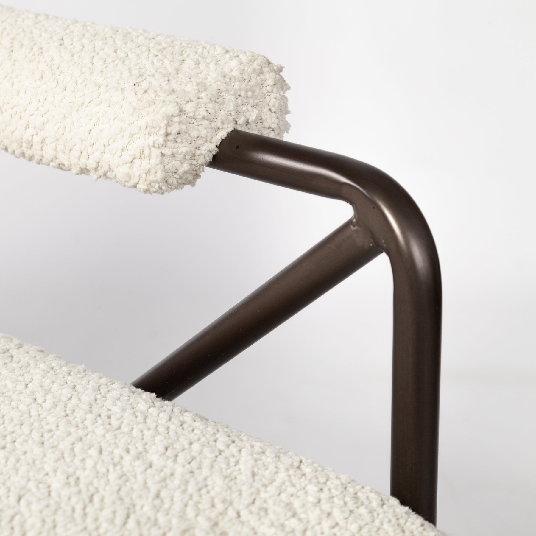 With a perfectly stuffed, upholstered seat and back, the ROSALIA combines durability with luxury and comfort. The body is anchored to metal legs finished in a gun metal gray polish that complements the off-white fabric, ensuring the comfort of the highest degree.