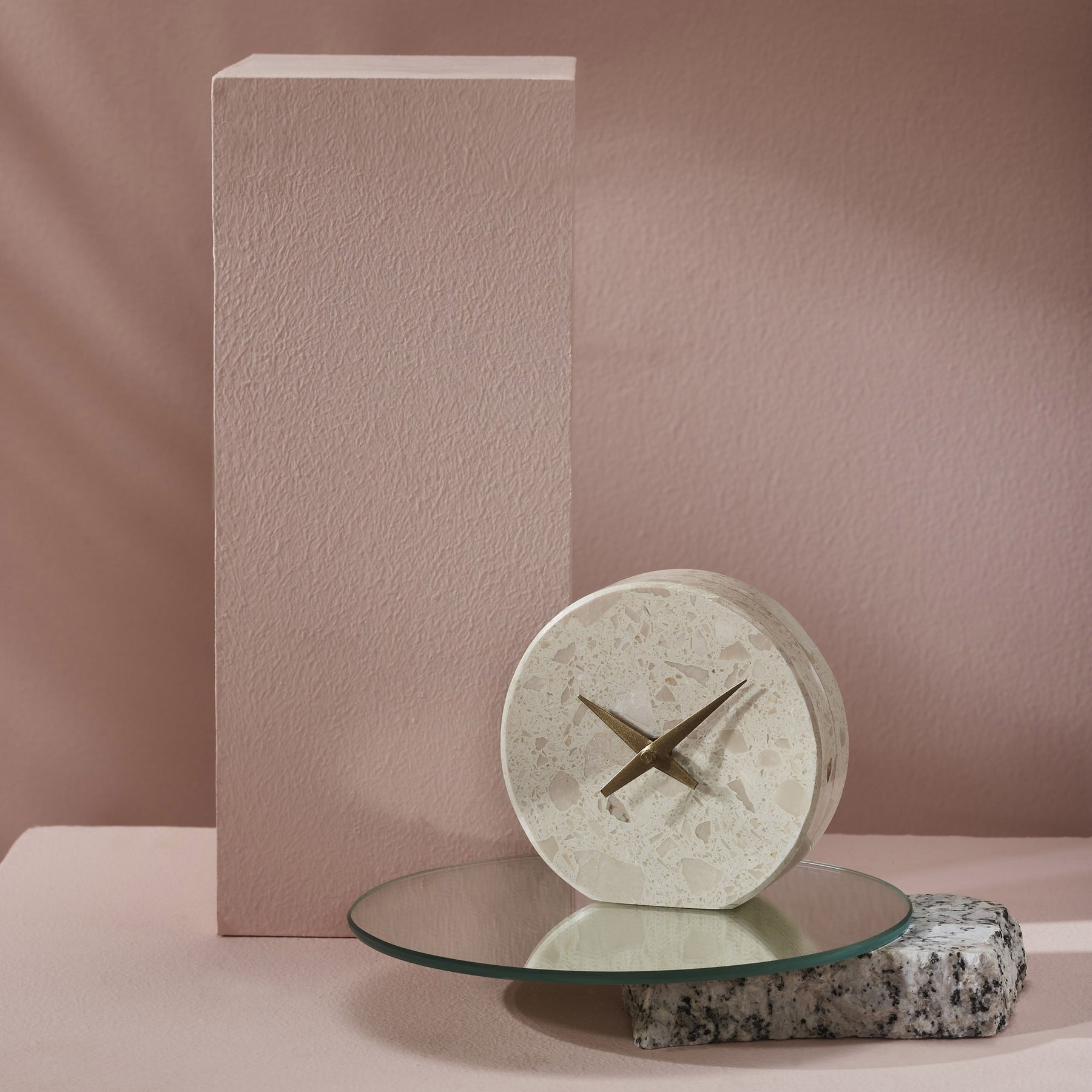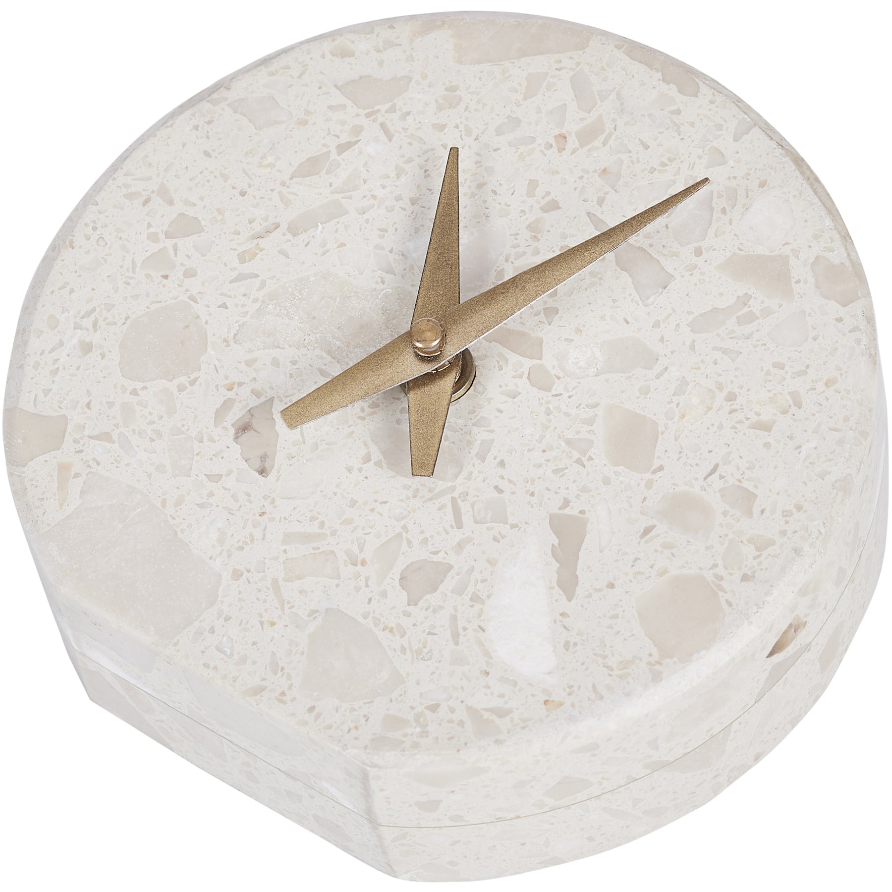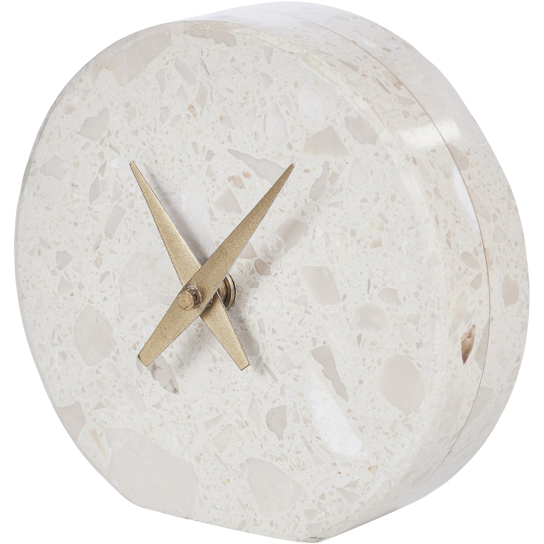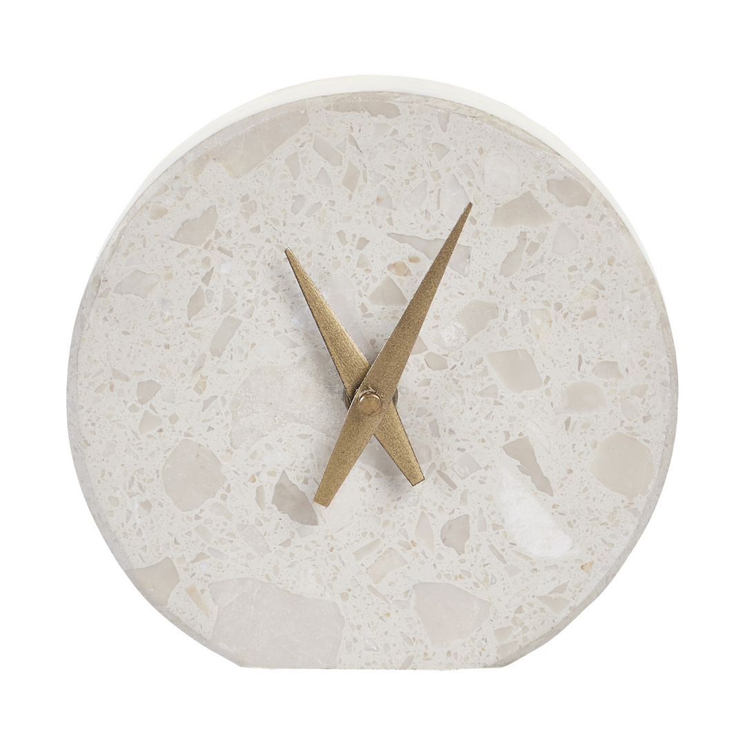 Warmth and glamour radiate from this refined clock design. Featuring a blend of cream and beige engineered marble and antique brass watch hands, it holds a soft and alluring monochrome palette.